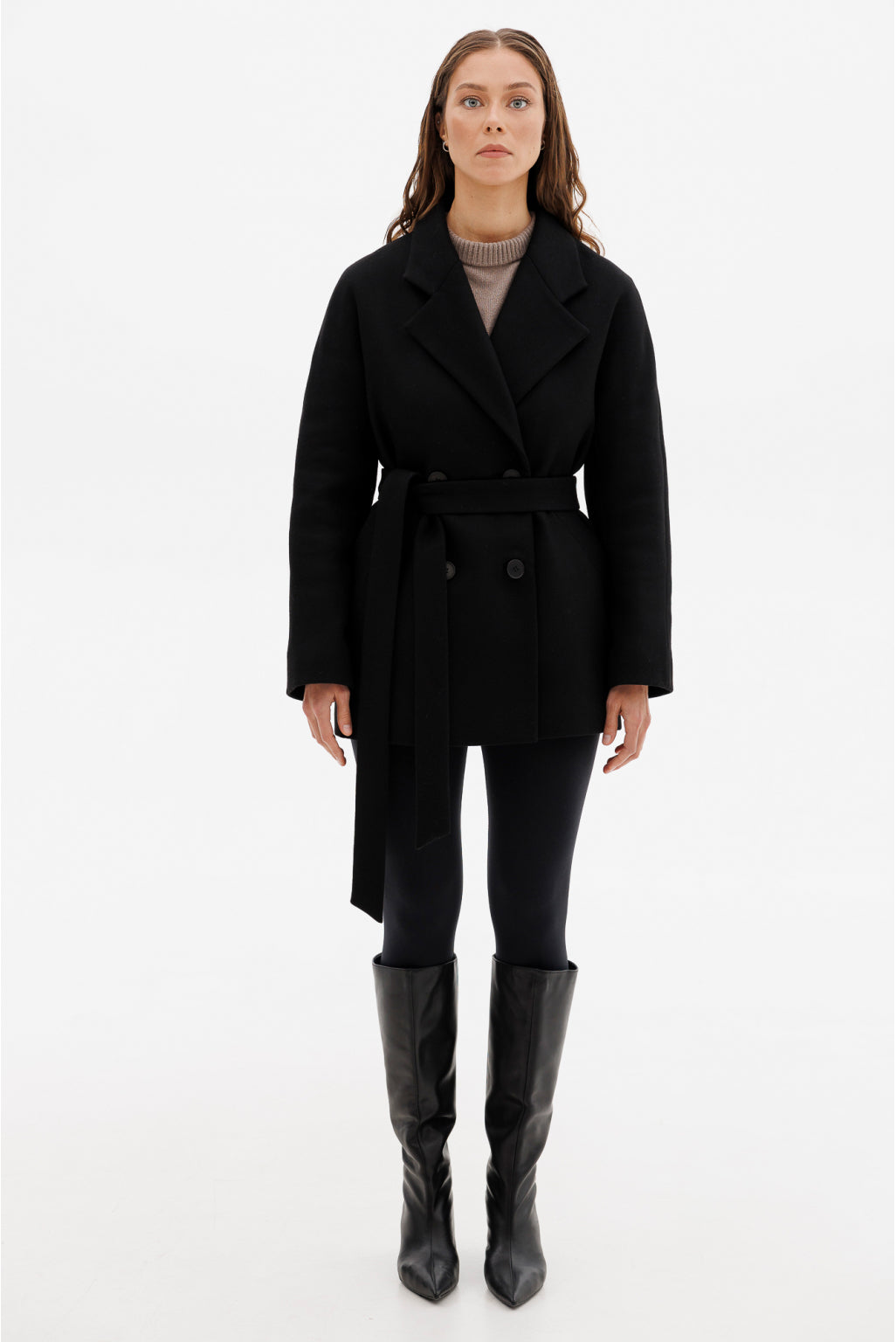 Вкорочене утеплене двобортне пальто з італійської вовни. Пальто має класичний комір, ґудзики пофарбовані в тон основної тканини, в комплекті пояс.