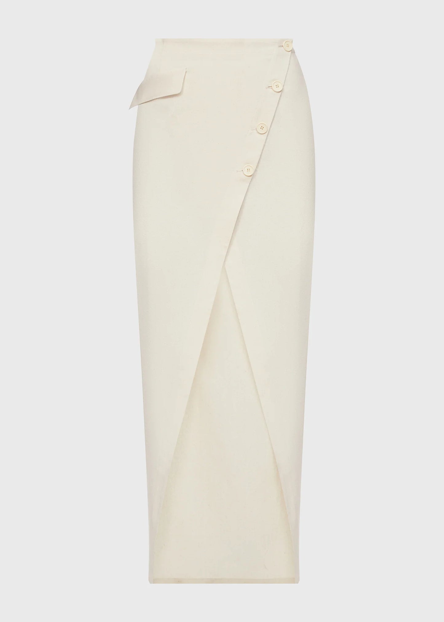 Максі спідниця на запах, виконана з дикого шовку. Оздоблена прорізними кишенями та декоративним клапаном. Застібається на три ґудзики. Тканина може містити вкраплення кольорових ниток.