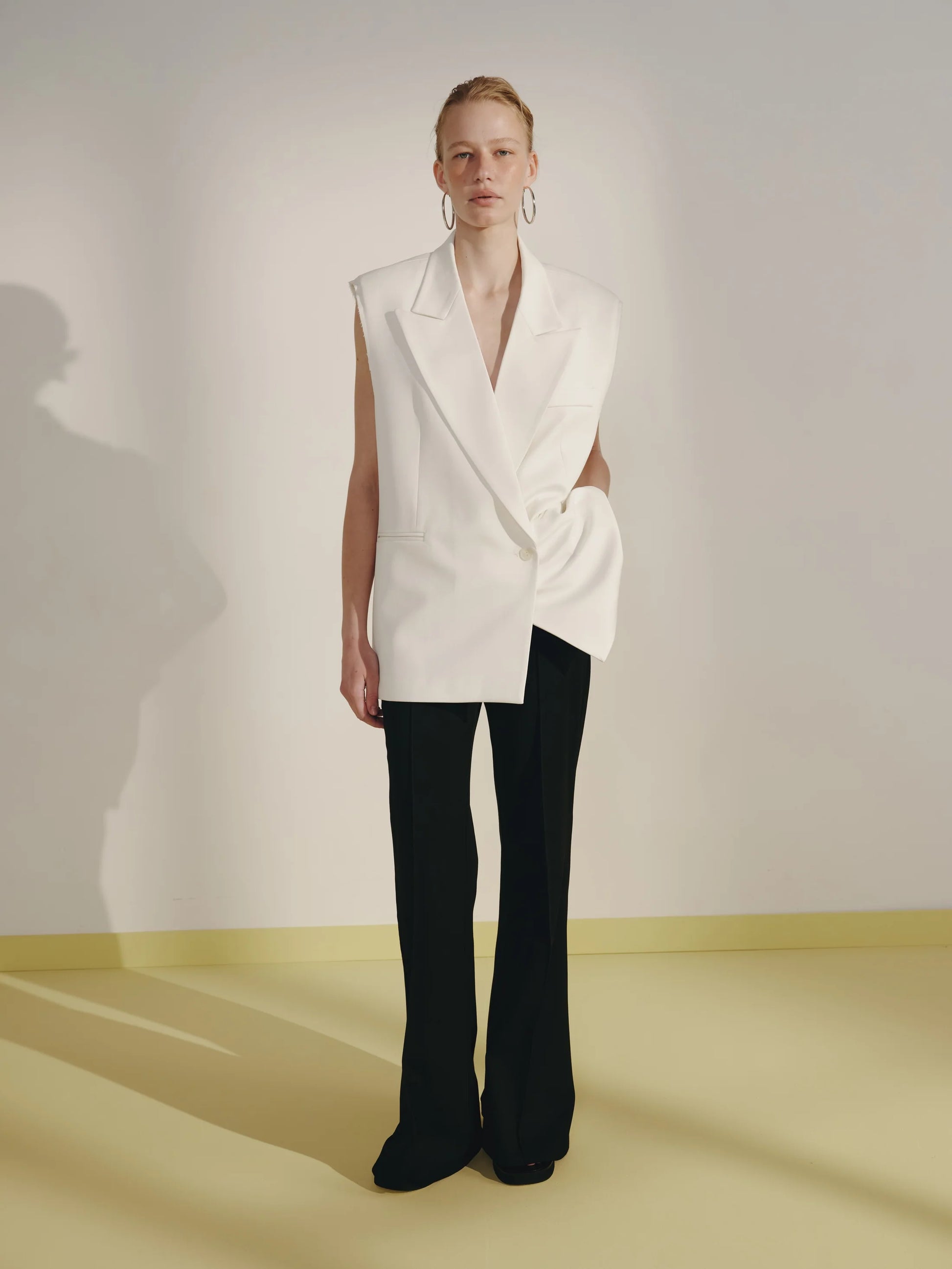 Жіночий жилет брючний молочний з обробленими плечима — це стильний і елегантний елемент гардеробу, який підкреслює силует і додає образу сучасного вигляду. Його класичний молочний колір робить його універсальним, а оброблені плечі надають жакету структури та витонченості.
