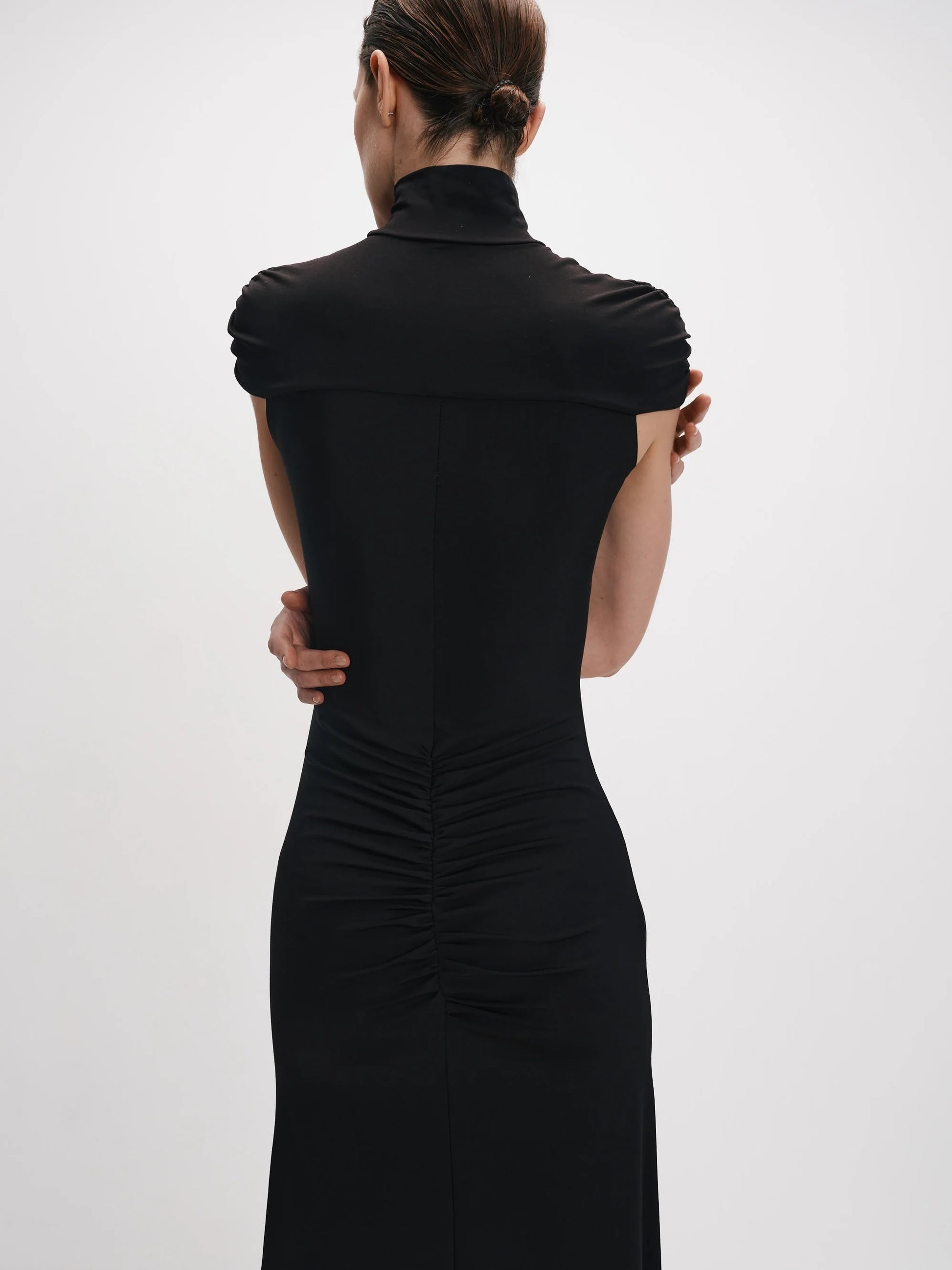 Чорна жіноча сукня з акцентним драпіруванням – це втілення елегантності та сучасного стилю. Витончене драпірування спереду й ззаду створює гармонійний силует, а акцент на горловині додає образу особливої виразності. Короткий рукав робить модель універсальною, а довжина максі підкреслює жіночність і стриману розкіш.