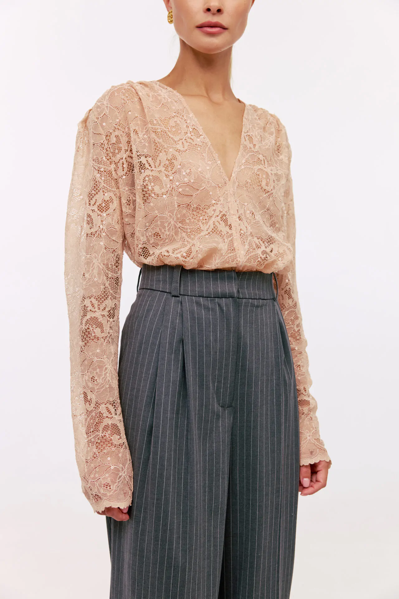 Штани-палаццо з подвійними защіпами та карманами по бокам. Висока лінія талії та широкий пояс підкреслюють силует. Широкий манжет по низу штанів.