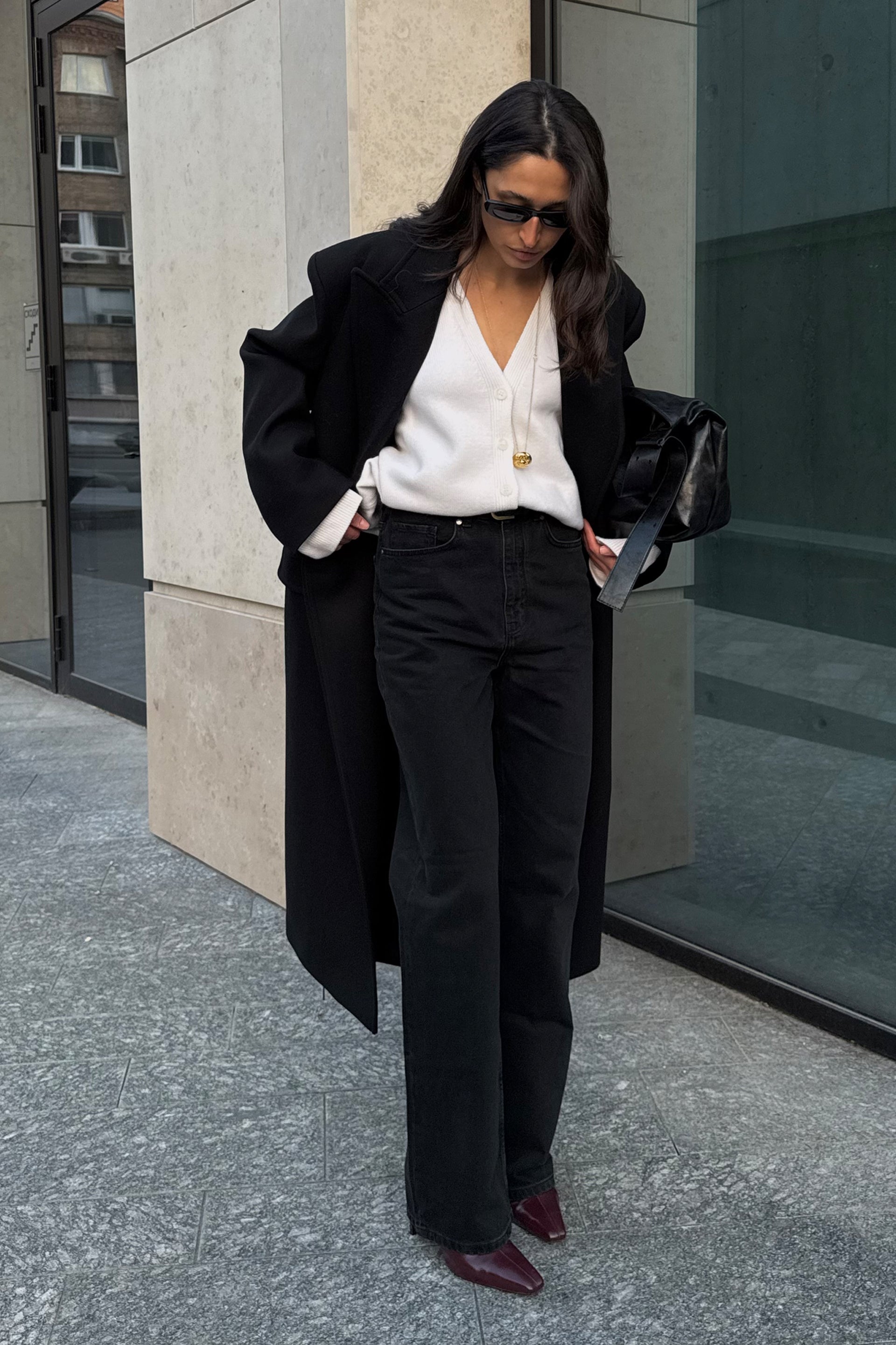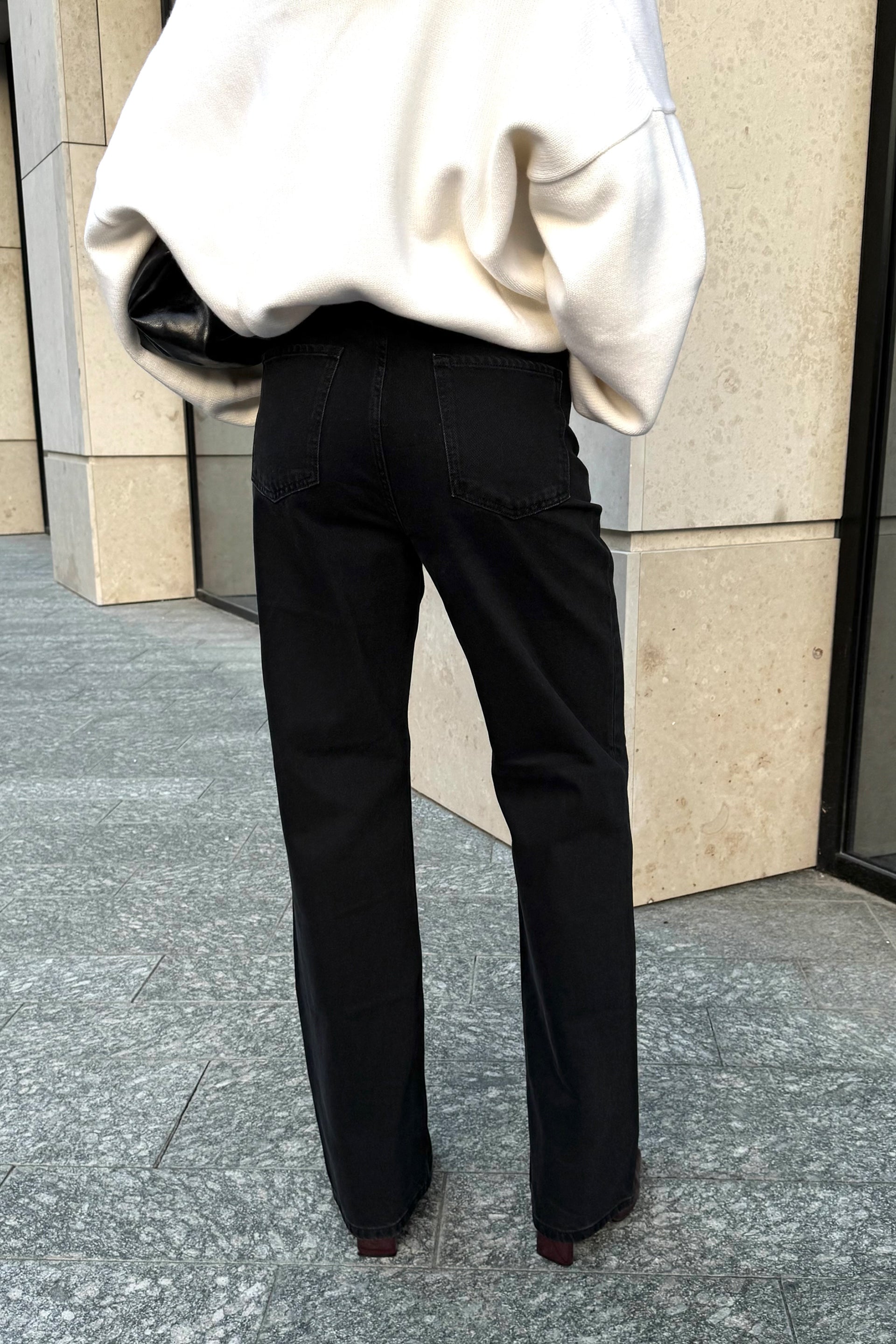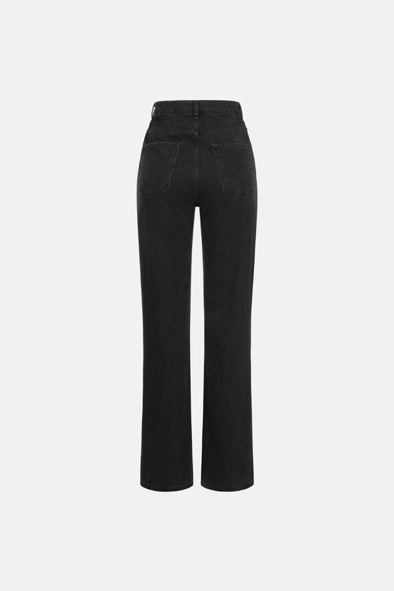 Джинси прямого крою з високою посадкою. Виготовлені з бавовни, що забезпечує комфортну посадку та довговічність. Ідеально підходять для створення базових образів на кожен день — від офісного до повсякденного стилю. Добре поєднуються з об'ємними светрами, сорочками або шкіряними куртками, створюючи стильний та універсальний лук.