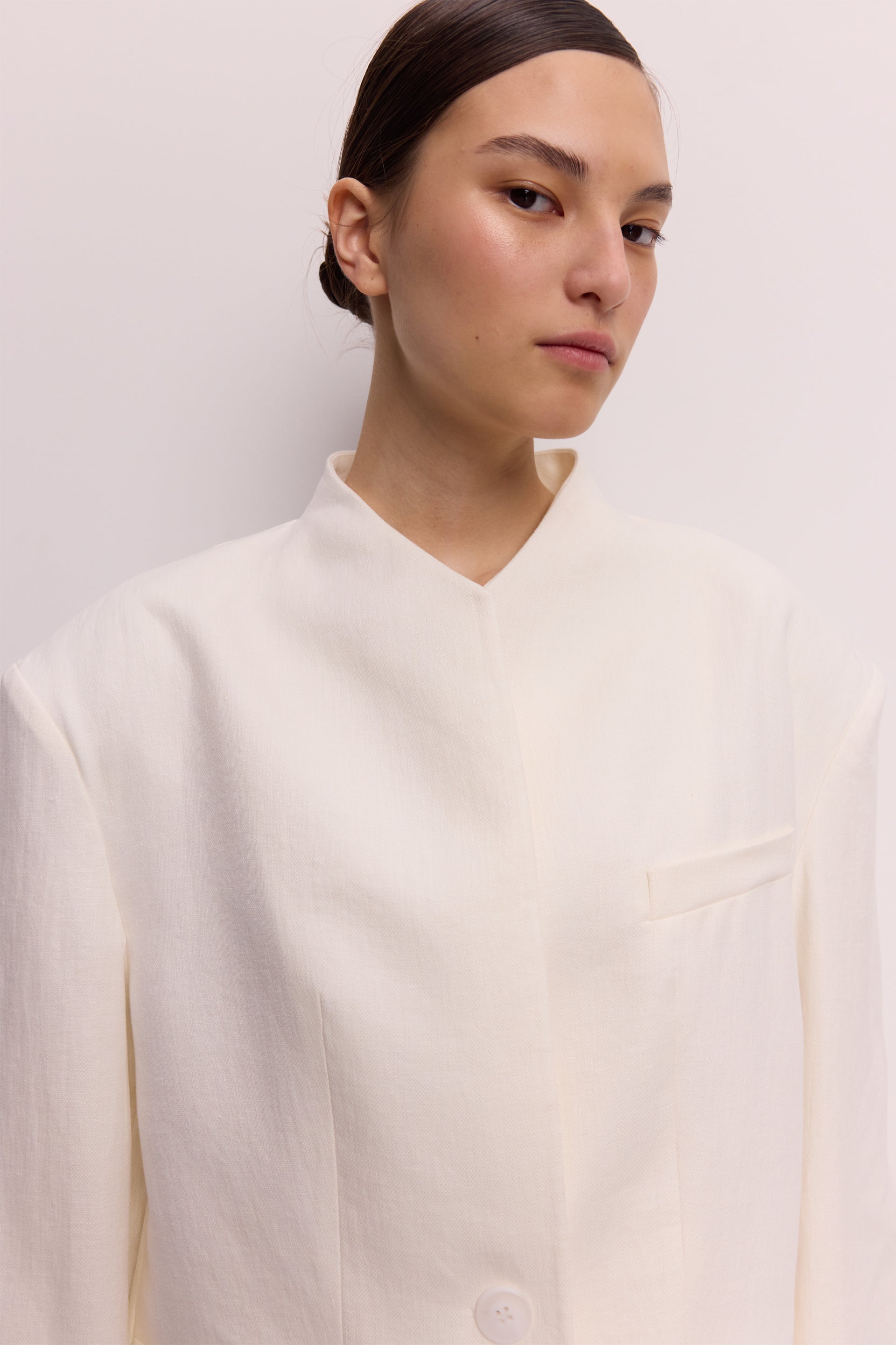 Жакет Blade - це інтерпретація класичного жакету в сучасному прочитанні — Blade jacket виконаний з льону, що надає йому природної текстури й легкості. Прямий вільний крій із акцентом на плечі формує виразний силует, водночас залишаючи простір для руху. Делікатний візерунок створює візуальний ритм, що підкреслює лаконічність дизайну. Жакет має глибокий V-подібний виріз, накладні кишені та приховану застібку на ґудзики. Ідеальний вибір для створення стриманого, але сильного образу.