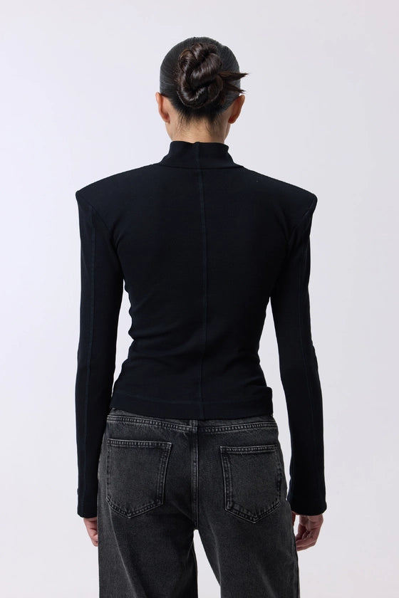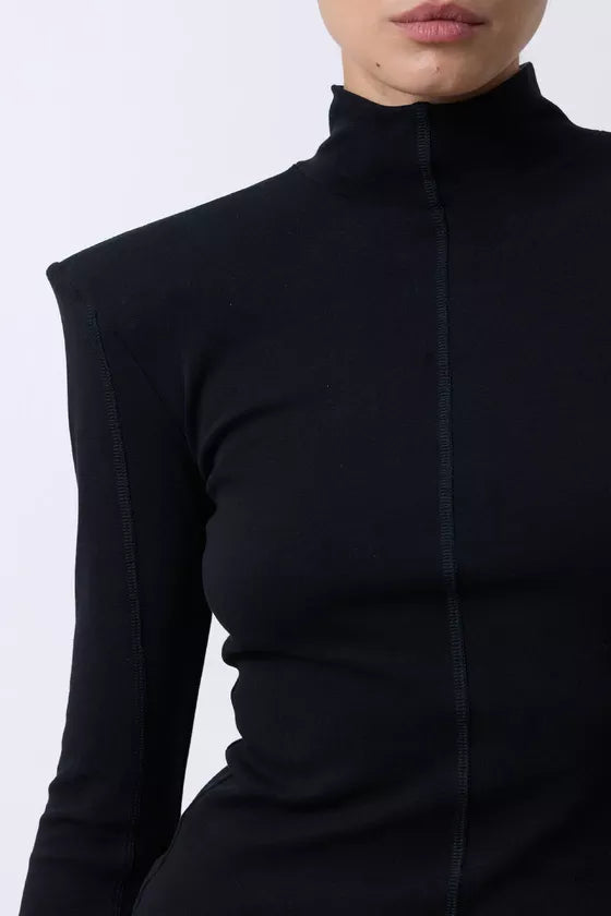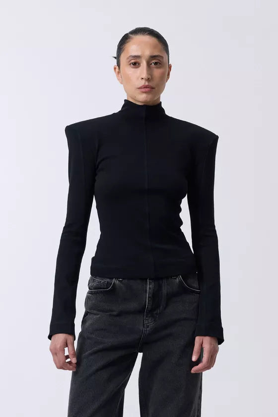 Лонгслів Fearless longsleeve — мінімалістична модель із сильним акцентом на конструктивні лінії. Високий комір-стійка та підкреслені плечі формують чіткий силует, а шов посередині додає графічності й завершеності образу. Виконаний з міксу бавовни та еластану, він дарує комфорт і легку еластичність, зберігаючи структурність крою.