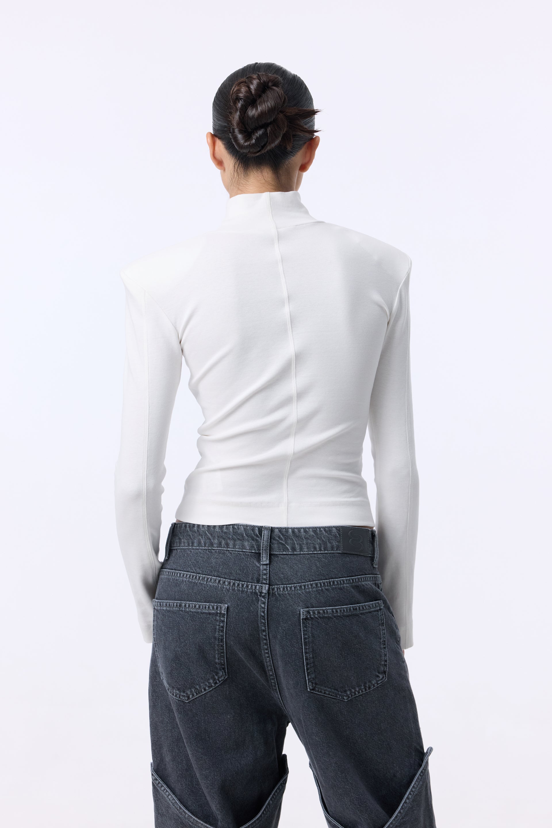 Лонгслів Fearless longsleeve — мінімалістична модель із сильним акцентом на конструктивні лінії. Високий комір-стійка та підкреслені плечі формують чіткий силует, а шов посередині додає графічності й завершеності образу. Виконаний з міксу бавовни та еластану, він дарує комфорт і легку еластичність, зберігаючи структурність крою.