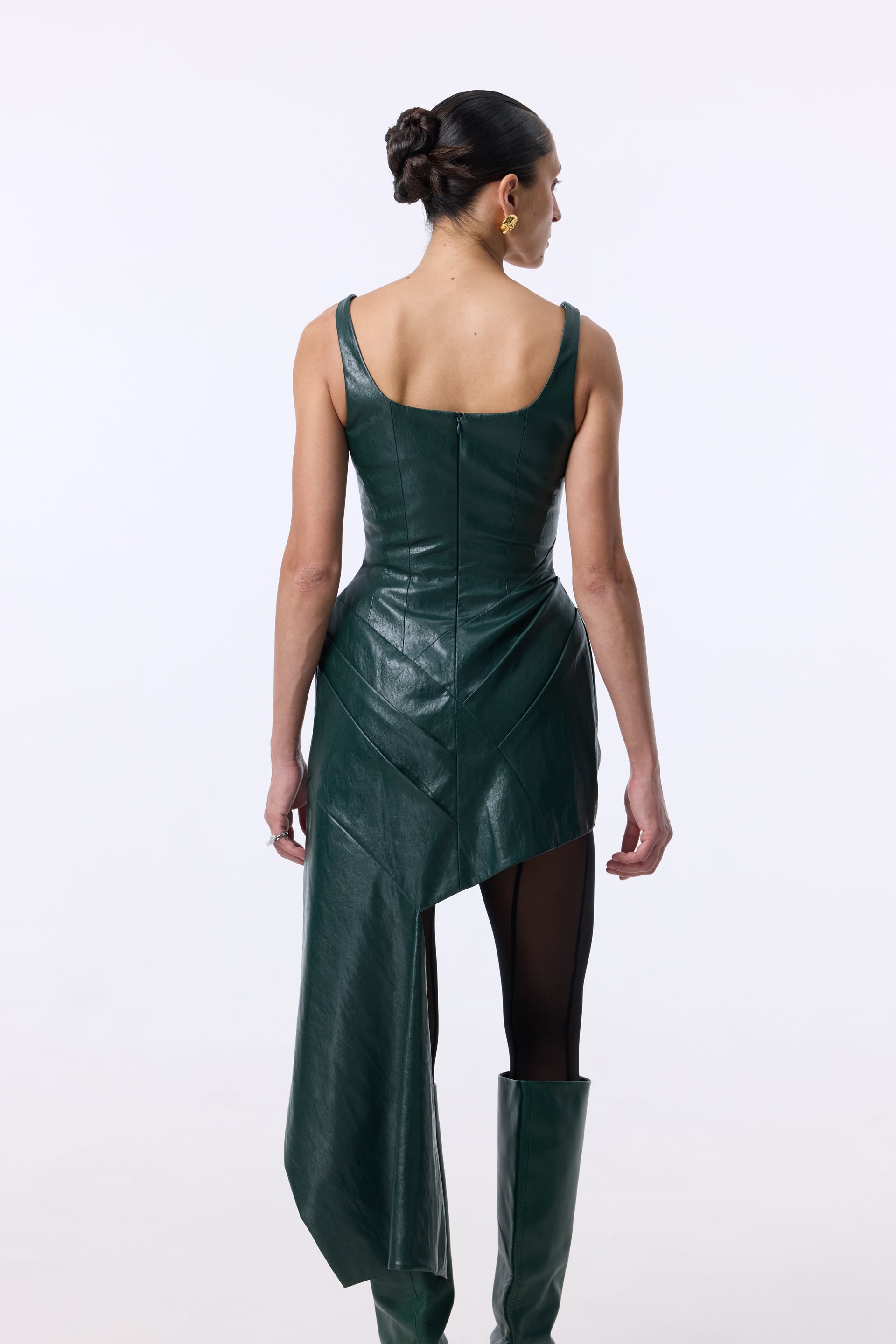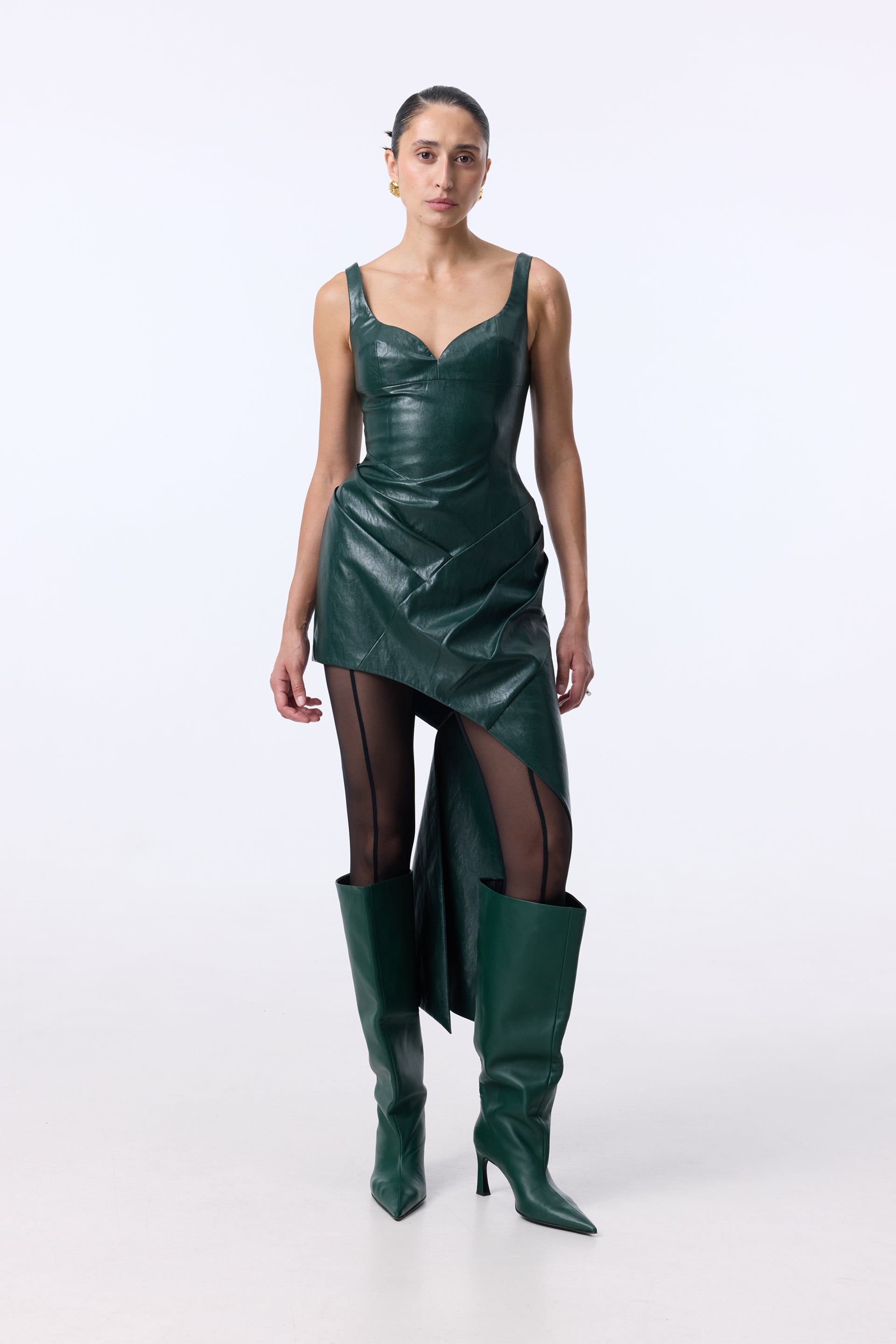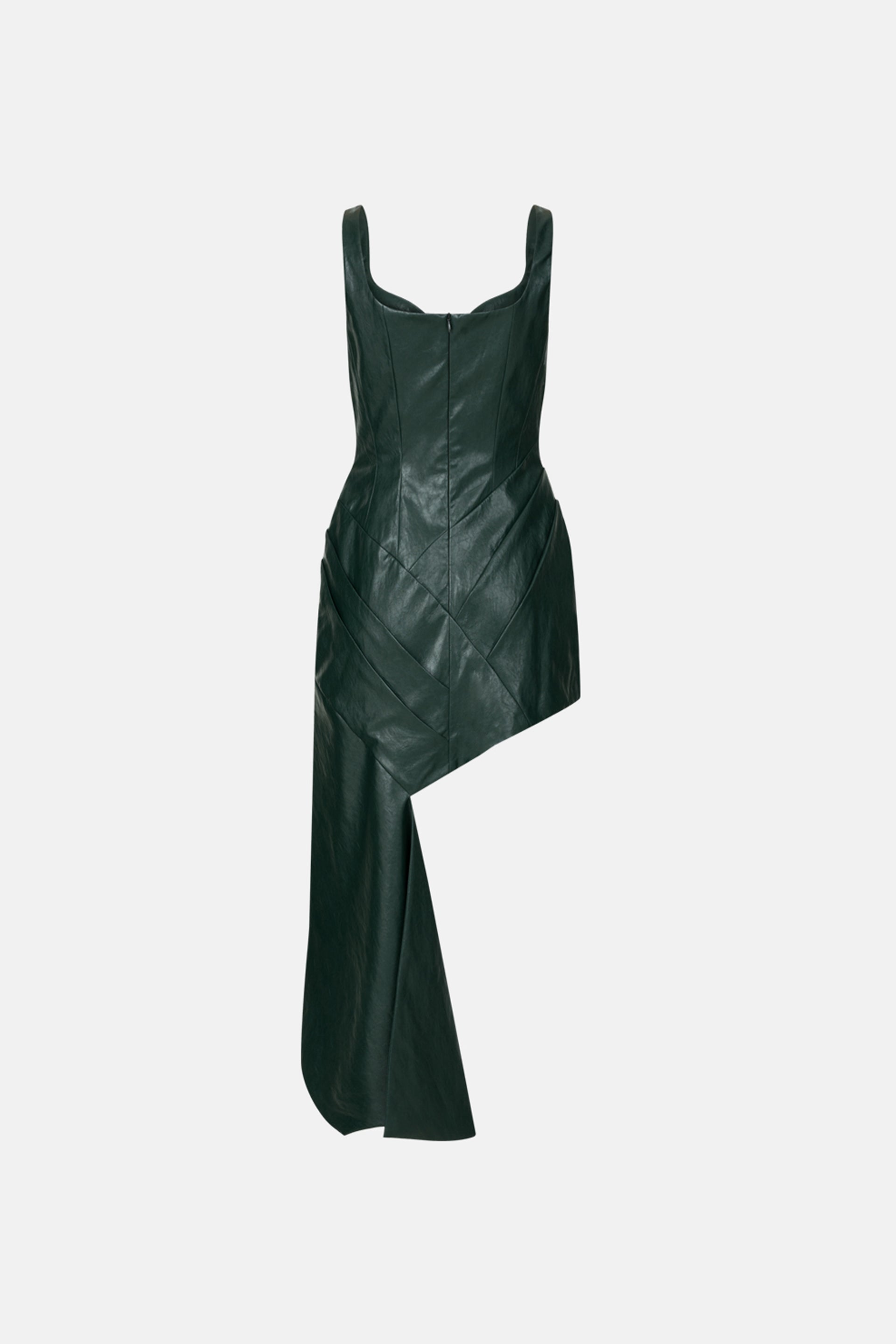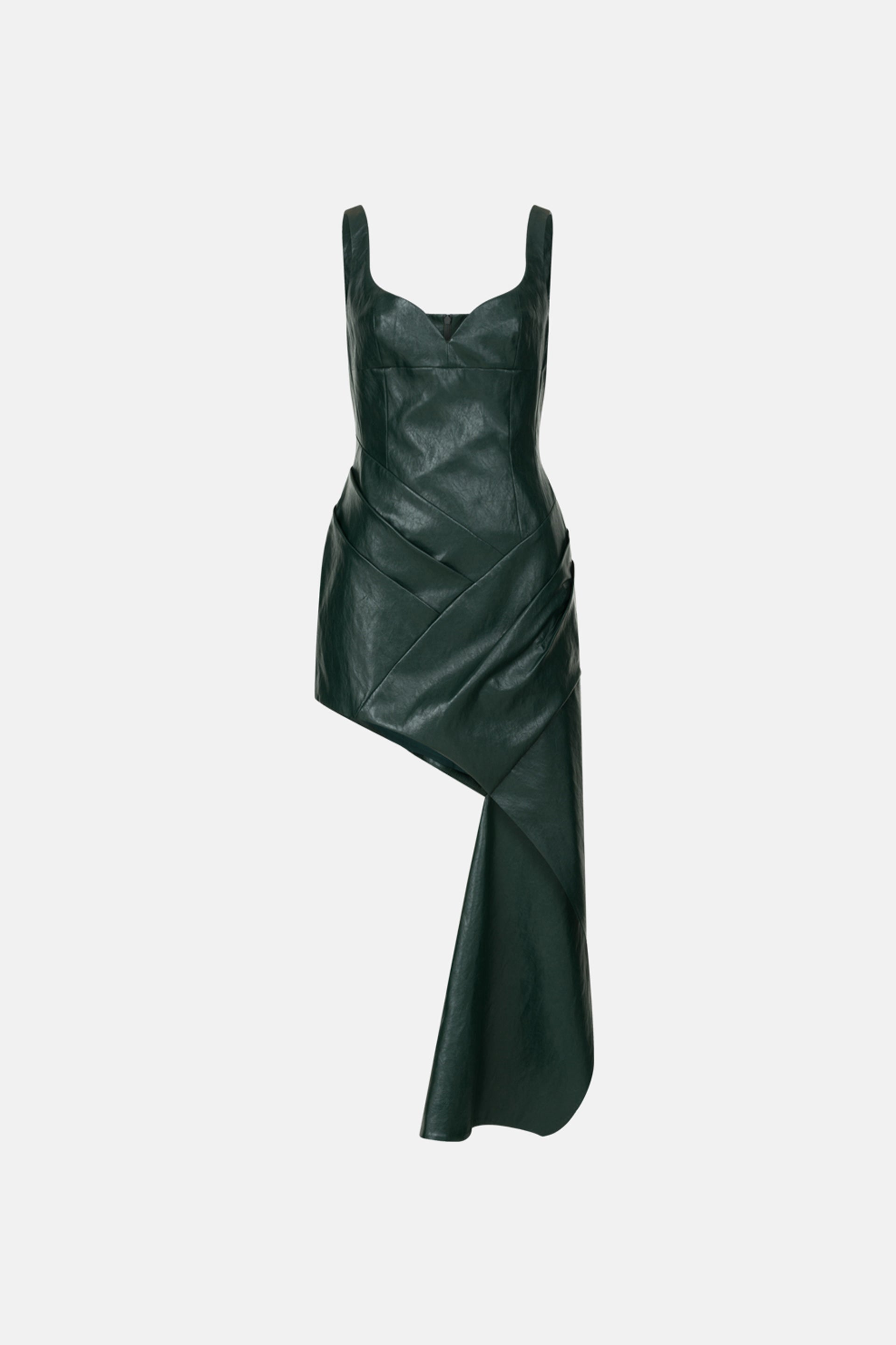 Сукня Serenity dress — асиметрична модель із глибоким декольте та акцентом на фігуру. Облягаючий верх плавно переходить у драпований низ зі скошеною лінією, що додає динаміки силуету. Текстурована поверхня з ефектом шкіри підсилює виразність образу, а мікс тканин забезпечує комфорт і зручність у носінні.
