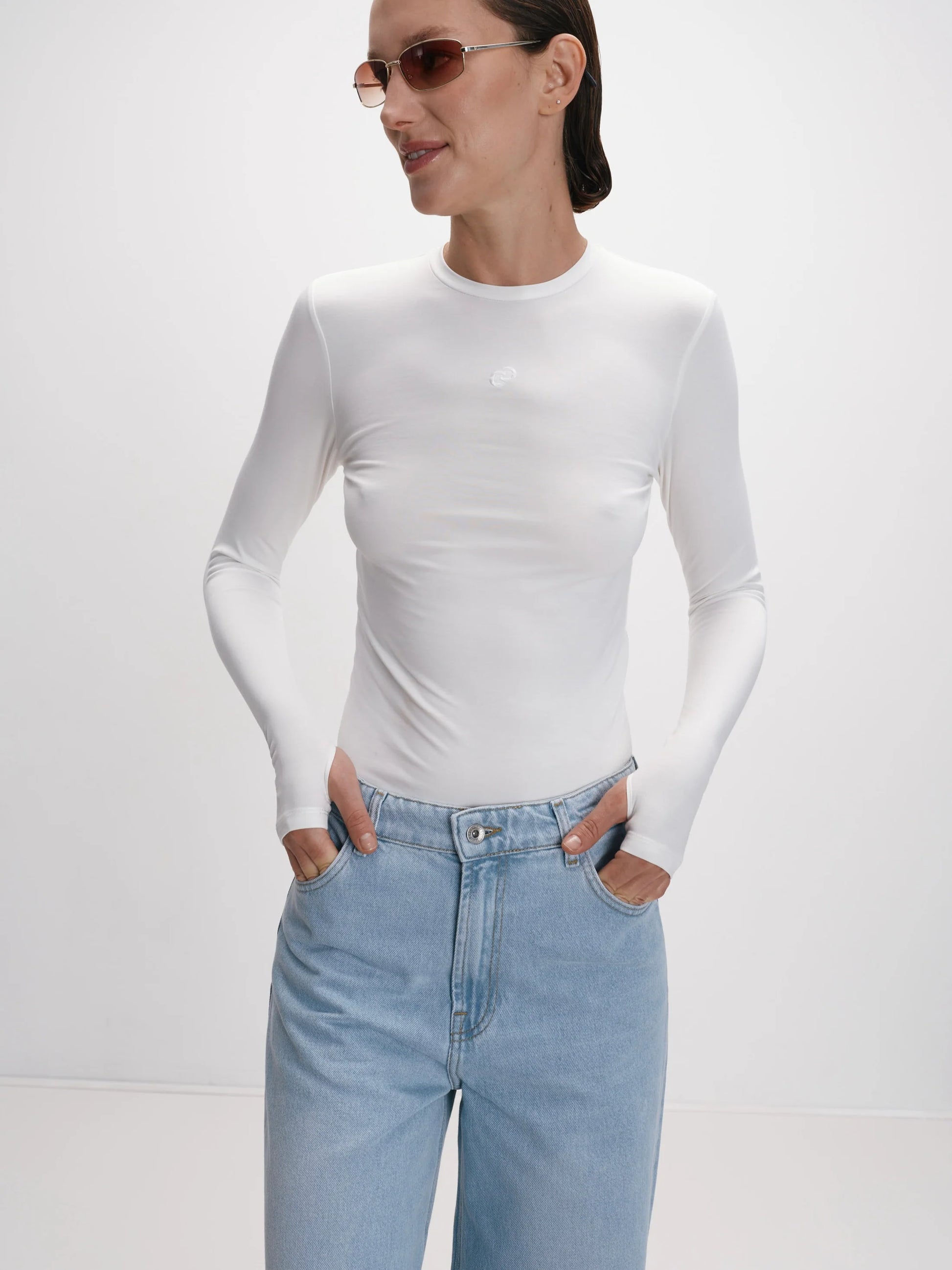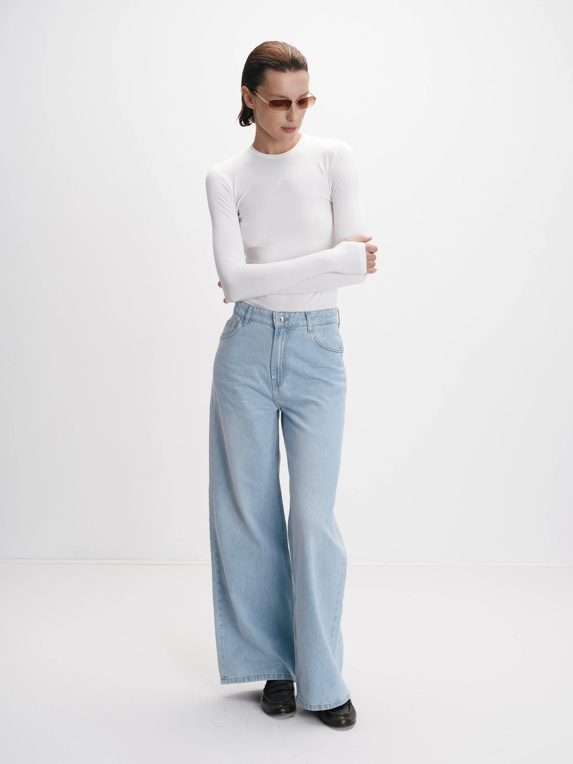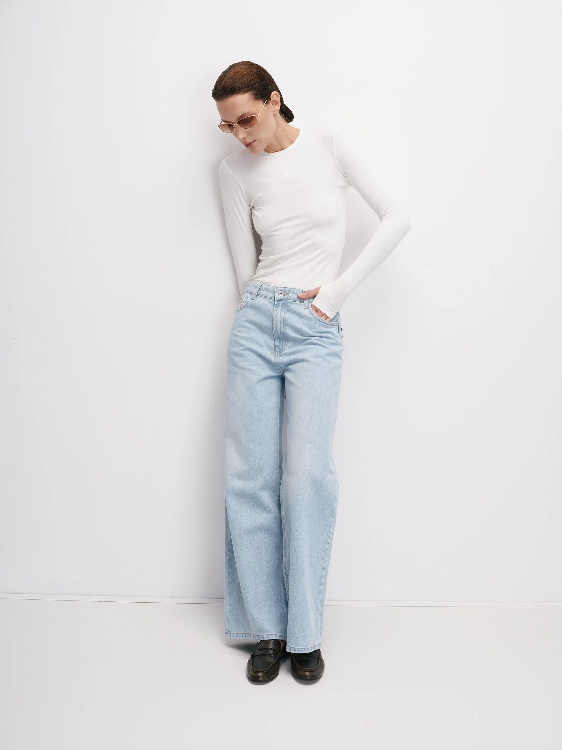 Блакитні джинси легко стилізувати як у casual-варіанті з білою футболкою та кросівками, так і в більш елегантному образі з підборами та структурованим жакетом. Вони ідеально поєднуються з oversize светрами, шкіряними куртками чи базовими сорочками, створюючи стильні багатошарові образи.