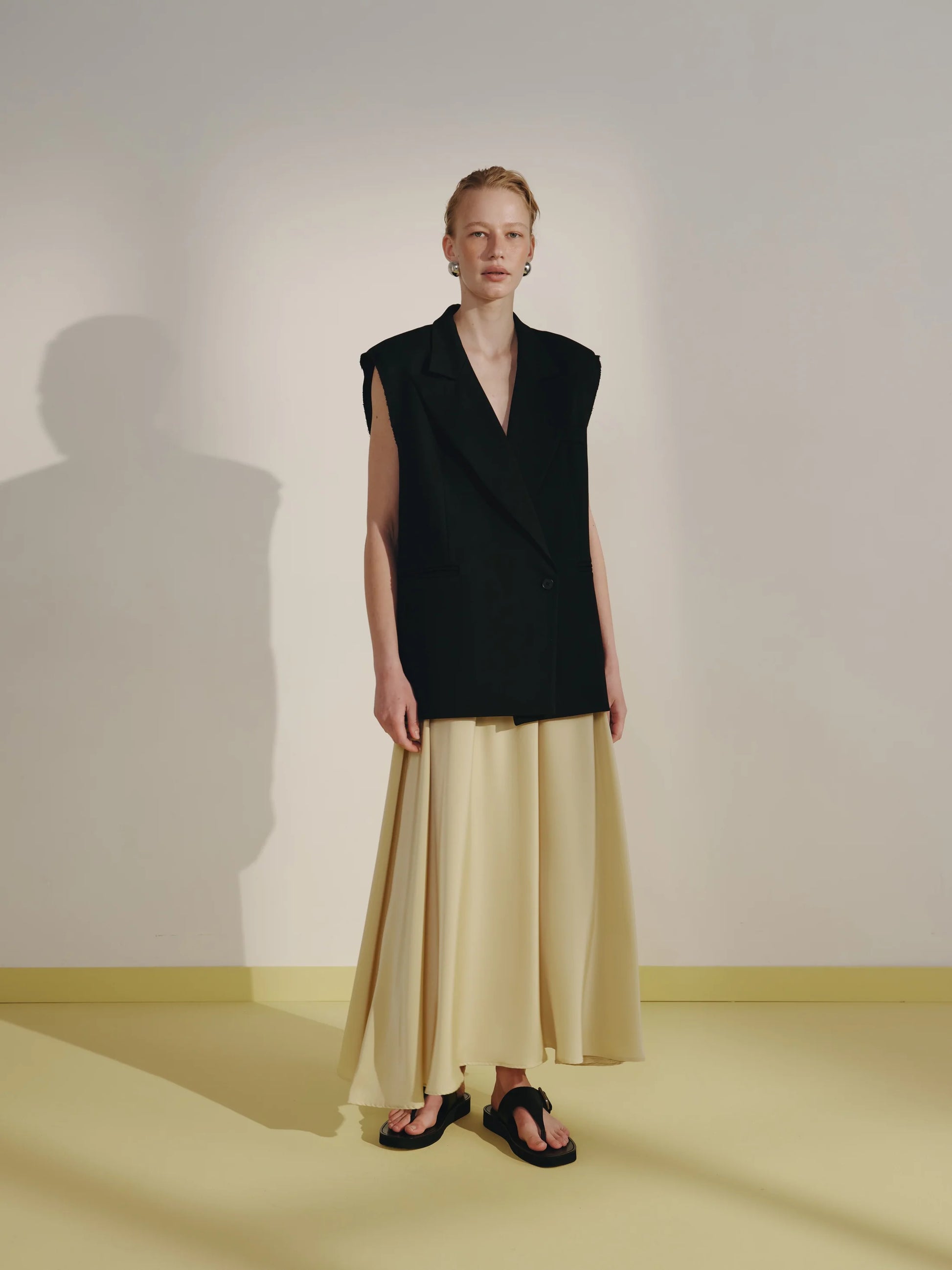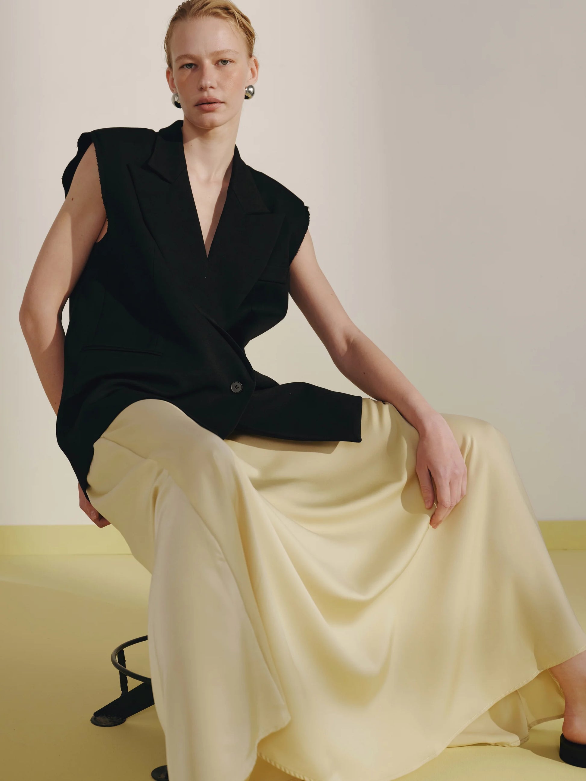 Жіночий жилет брючний чорний з обробленими плечима — це стильний і елегантний елемент гардеробу, який підкреслює силует і додає образу сучасного вигляду. Його класичний чорний колір робить його універсальним, а оброблені плечі надають жакету структури та витонченості.