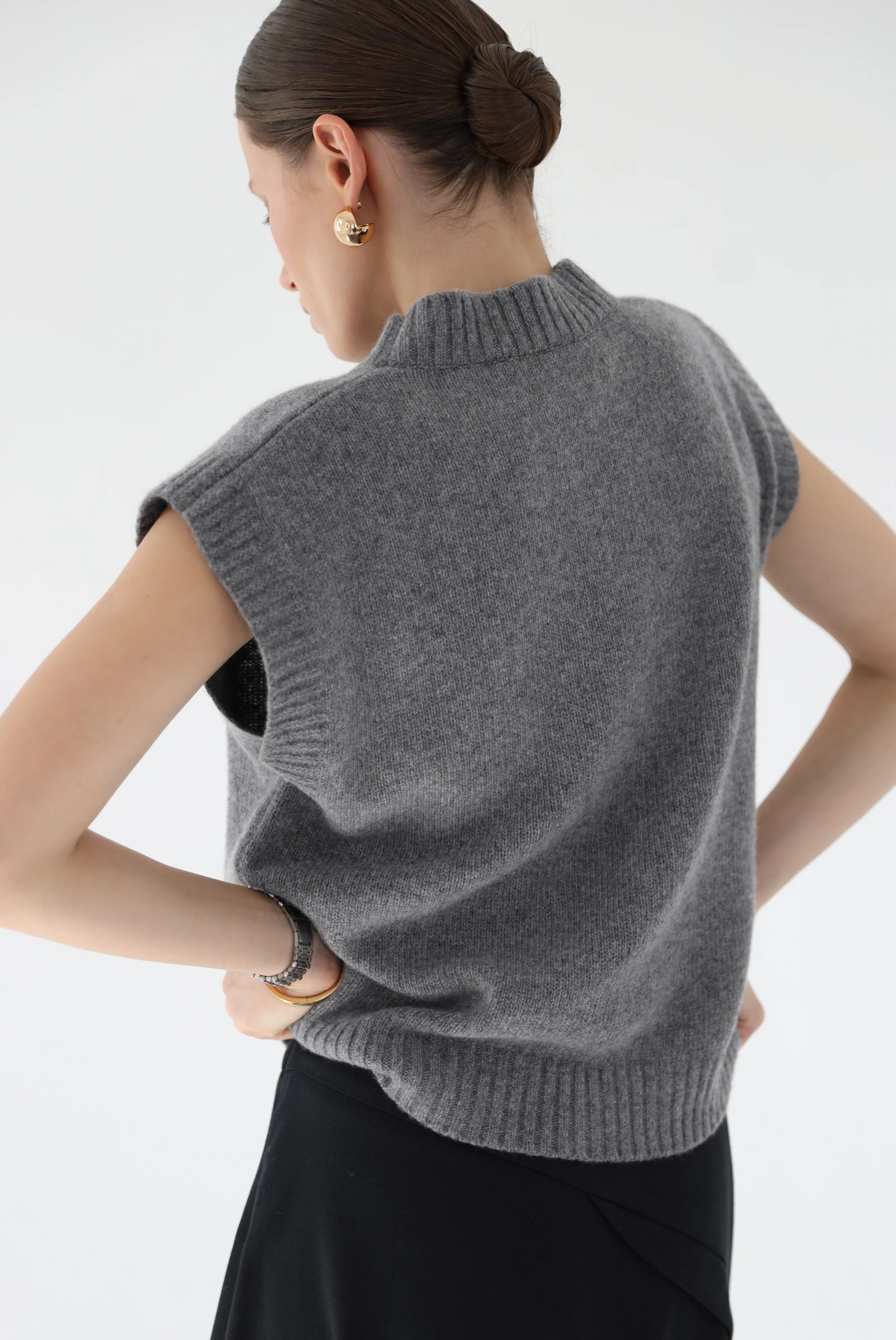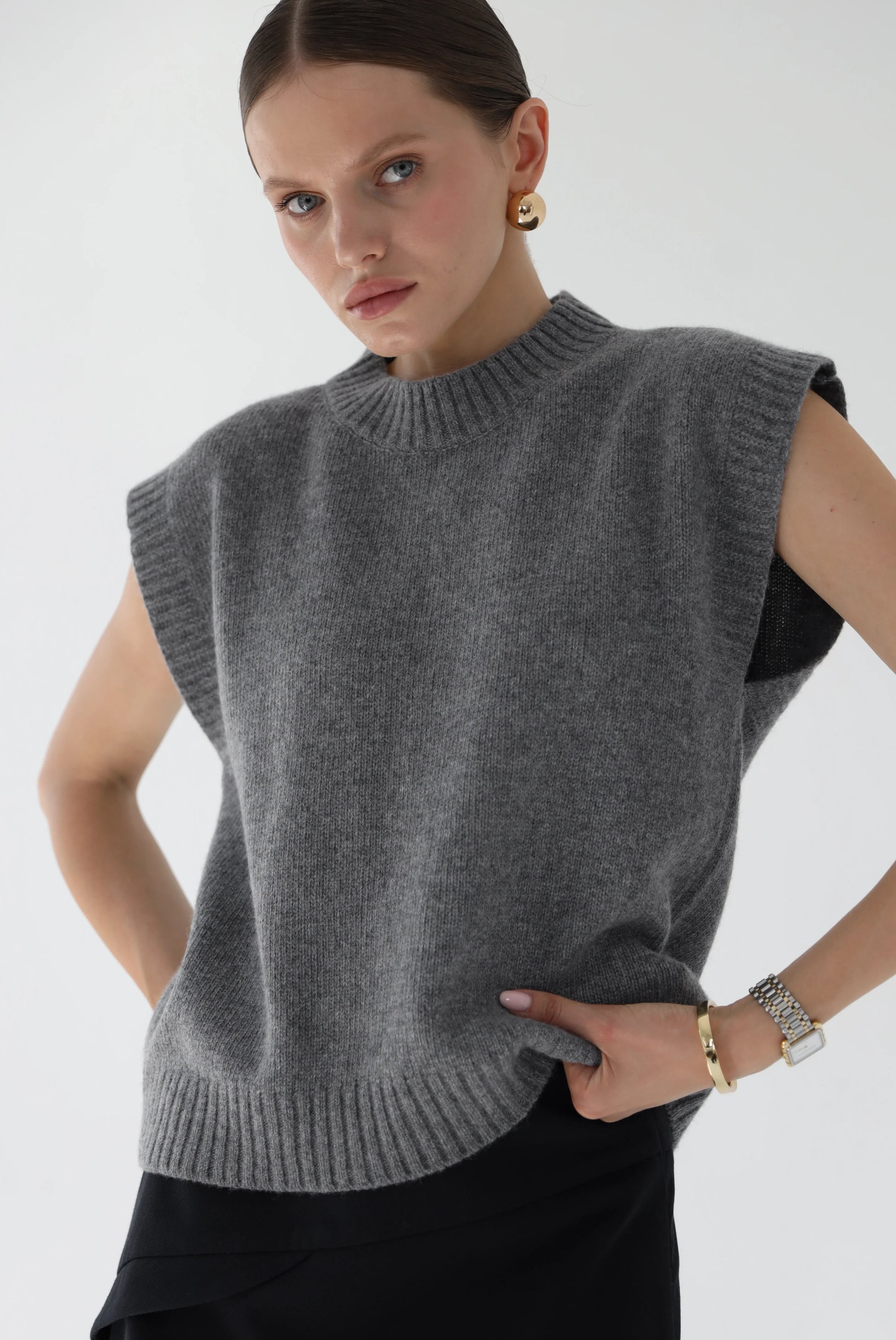 Сірий відтінок легко комбінується з різними елементами одягу, такими як сорочки, футболки, сукні або жакети, додаючи образу стильний та затишний акцент. Жилет можна носити як самостійно, так і в багатошарових луках, що дозволяє створювати різні стилі на кожен день.