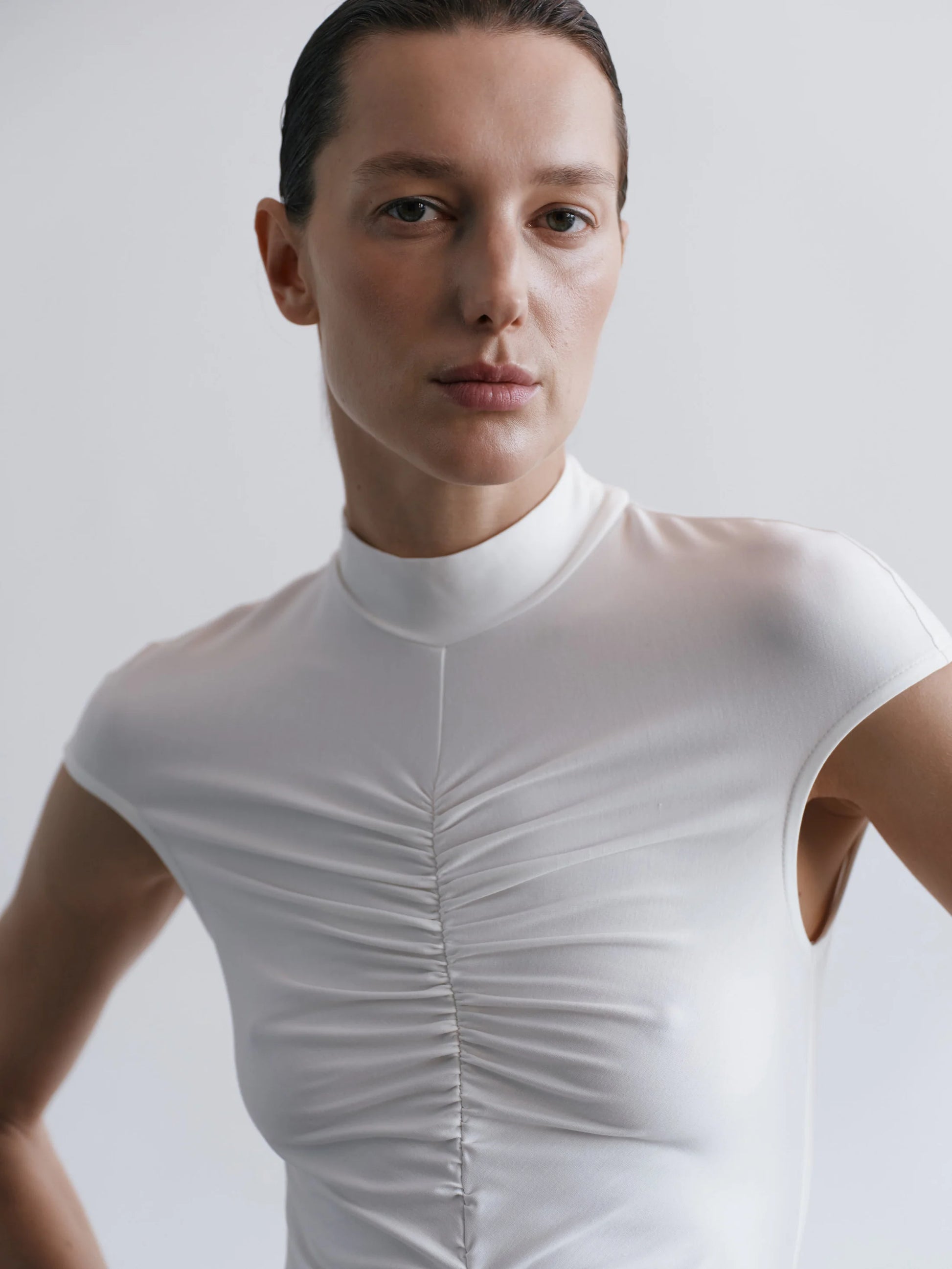 Молочне жіноче боді з акцентним драпіруванням – це стильна основа гардеробу, яка поєднує комфорт і елегантність. Завдяки драпіруванню спереду та ззаду силует виглядає вишукано й витончено, а стриманий дизайн дозволяє легко інтегрувати боді у різні образи.