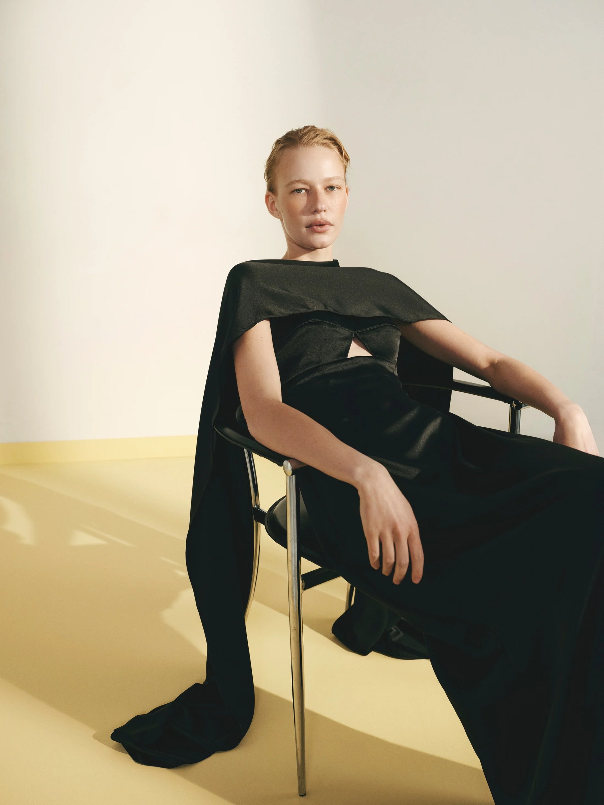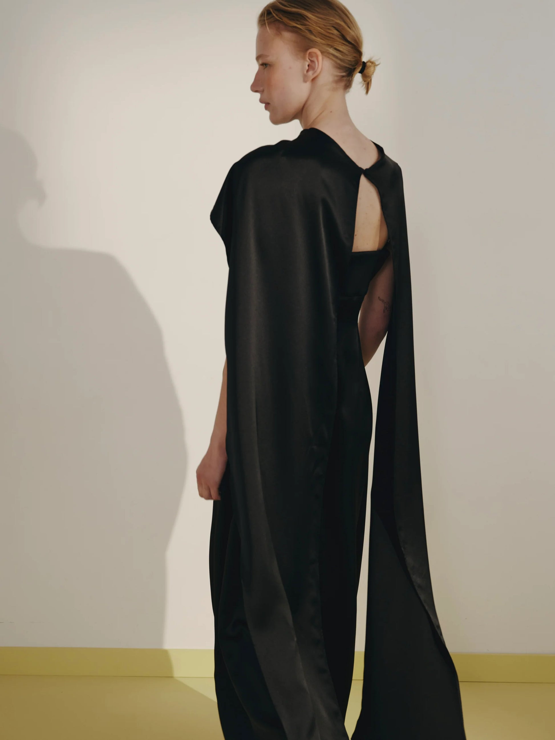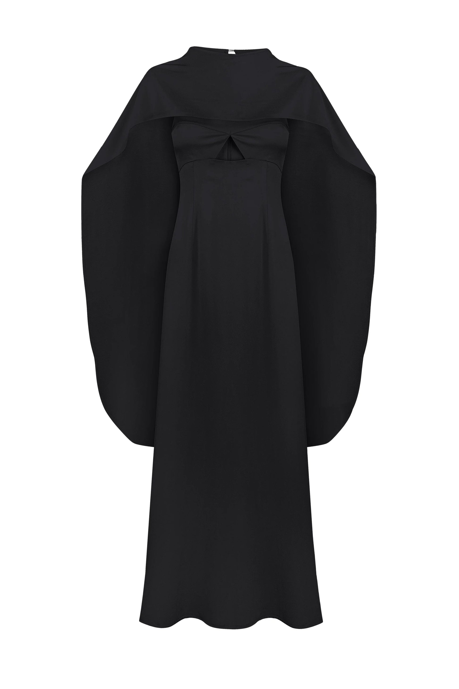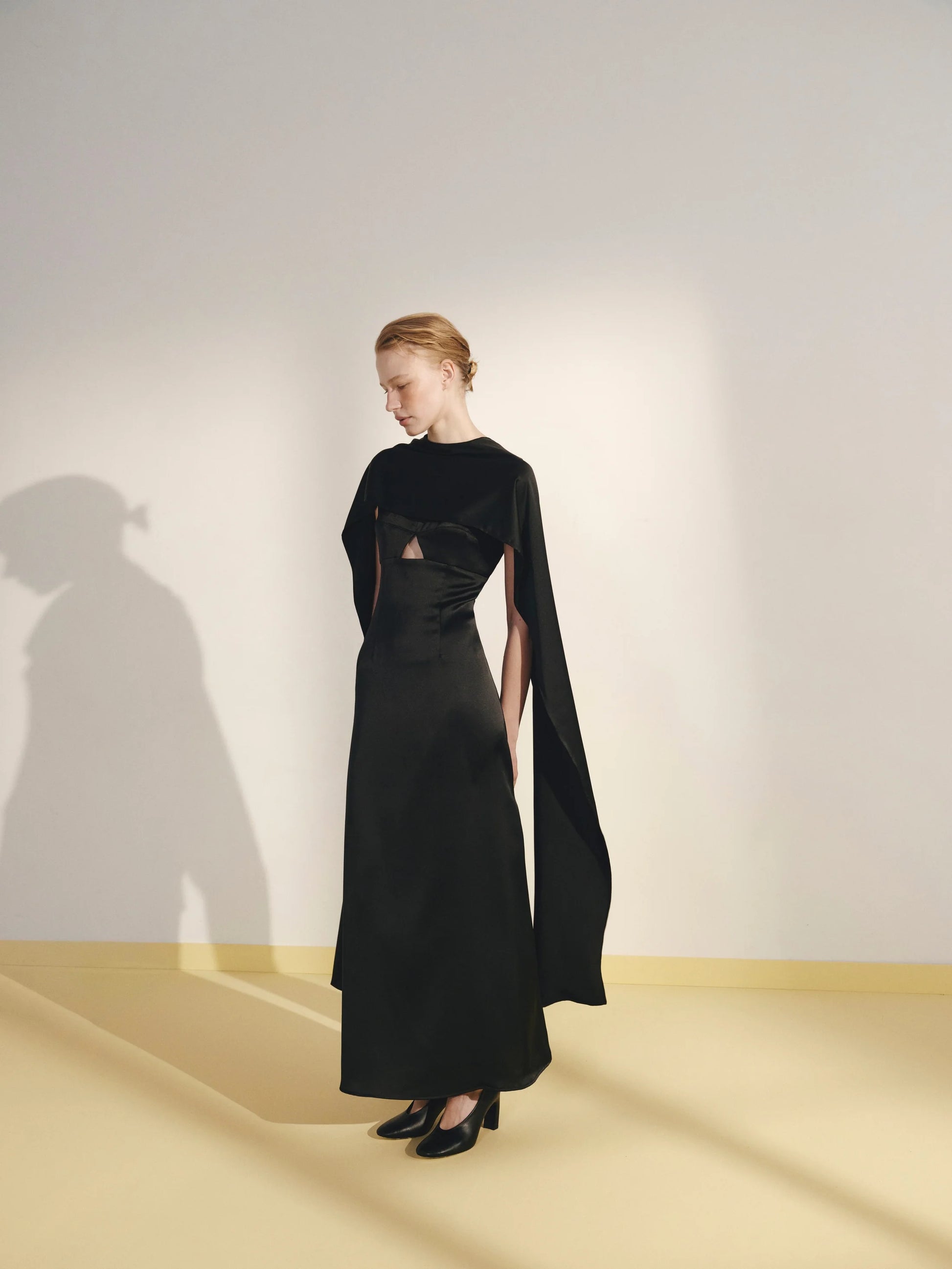 Особливий акцент — легка пелерина, що м’яко спадає поверх сукні, огортаючи плечі й спину. Вона додає загадковості, динаміки та створює відчуття витонченого руху. Пелерина входить до комплекту із сукнею, що дозволяє створити цілісний та гармонійний образ.