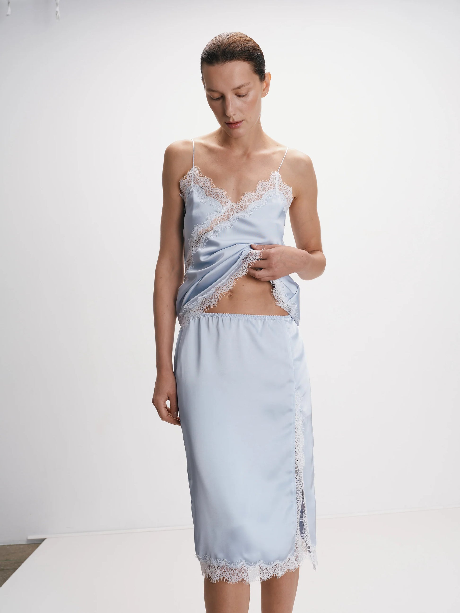Сатиновий блакитний топ з мереживом – ідеальний вибір для особливих моментів. У комплекті зі спідницею він створює цілісний і романтичний образ, а в поєднанні з класичними брюками чи джинсами додає форму сучасної легкості. Достатньо підібрати витончені прикраси та взуття на підборах – і ваш лук готовий для вечірнього виходу чи святкової події.