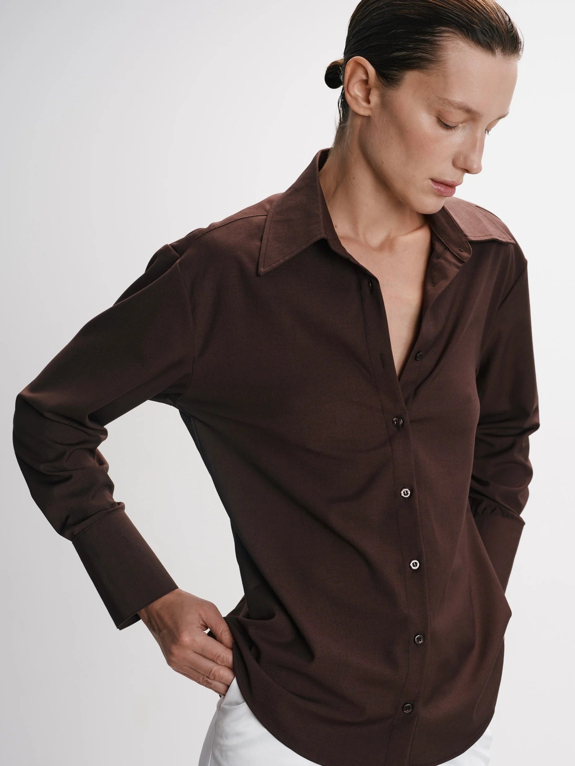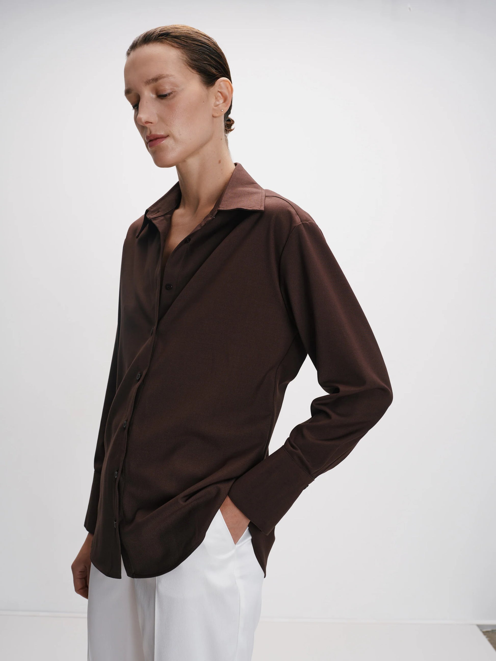 Коричневу силуетну сорочку можна поєднувати з широкими штанами, джинсами або спідницею для створення різних образів – від офісного до повсякденного. У парі з тренчем або жакетом вона набуває ще більшої виразності.