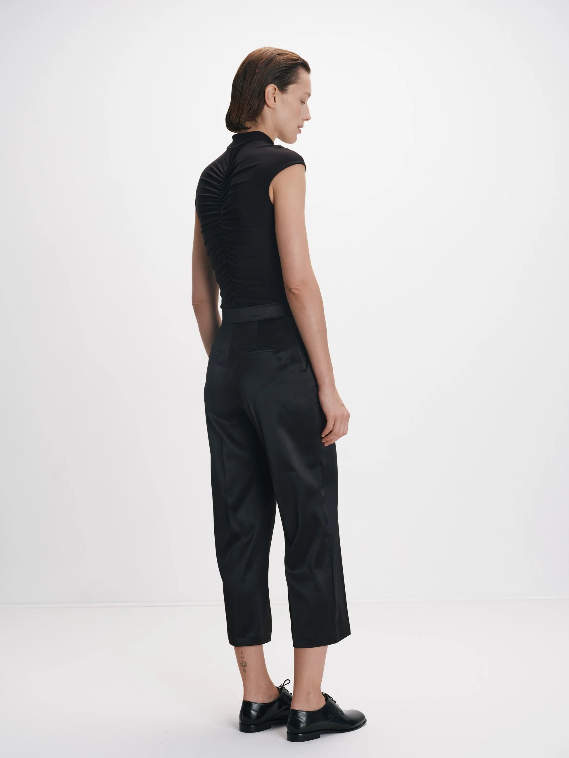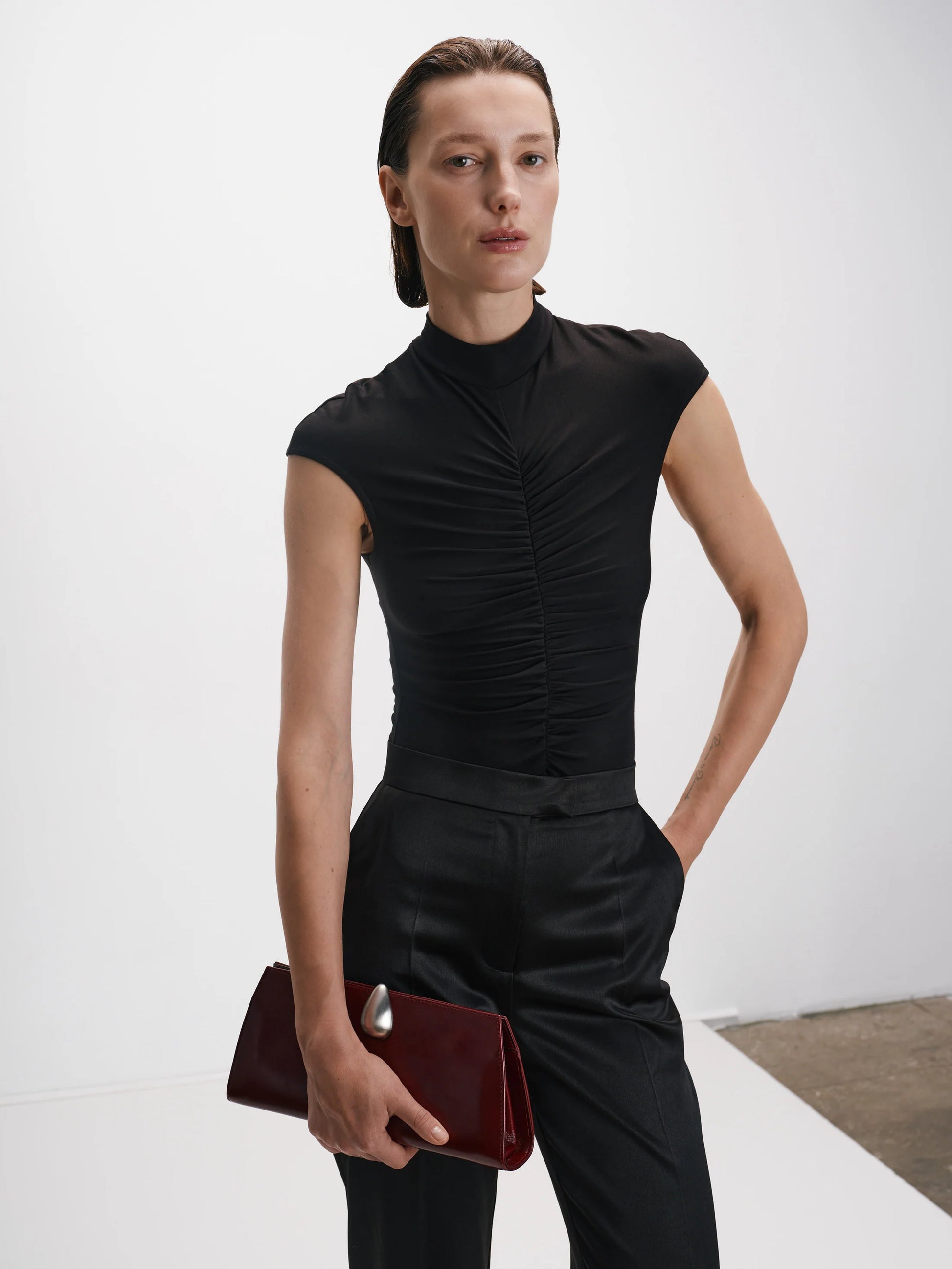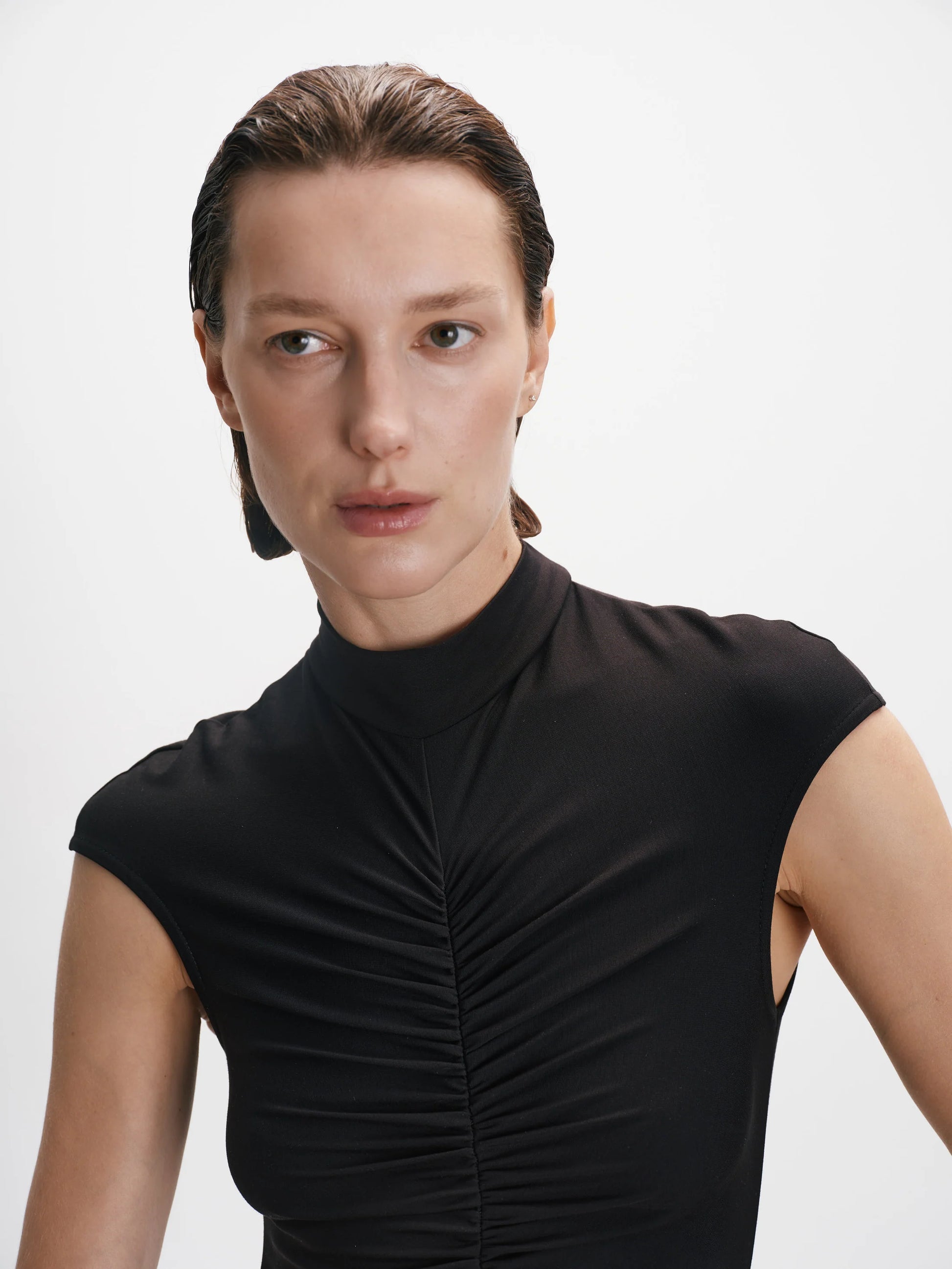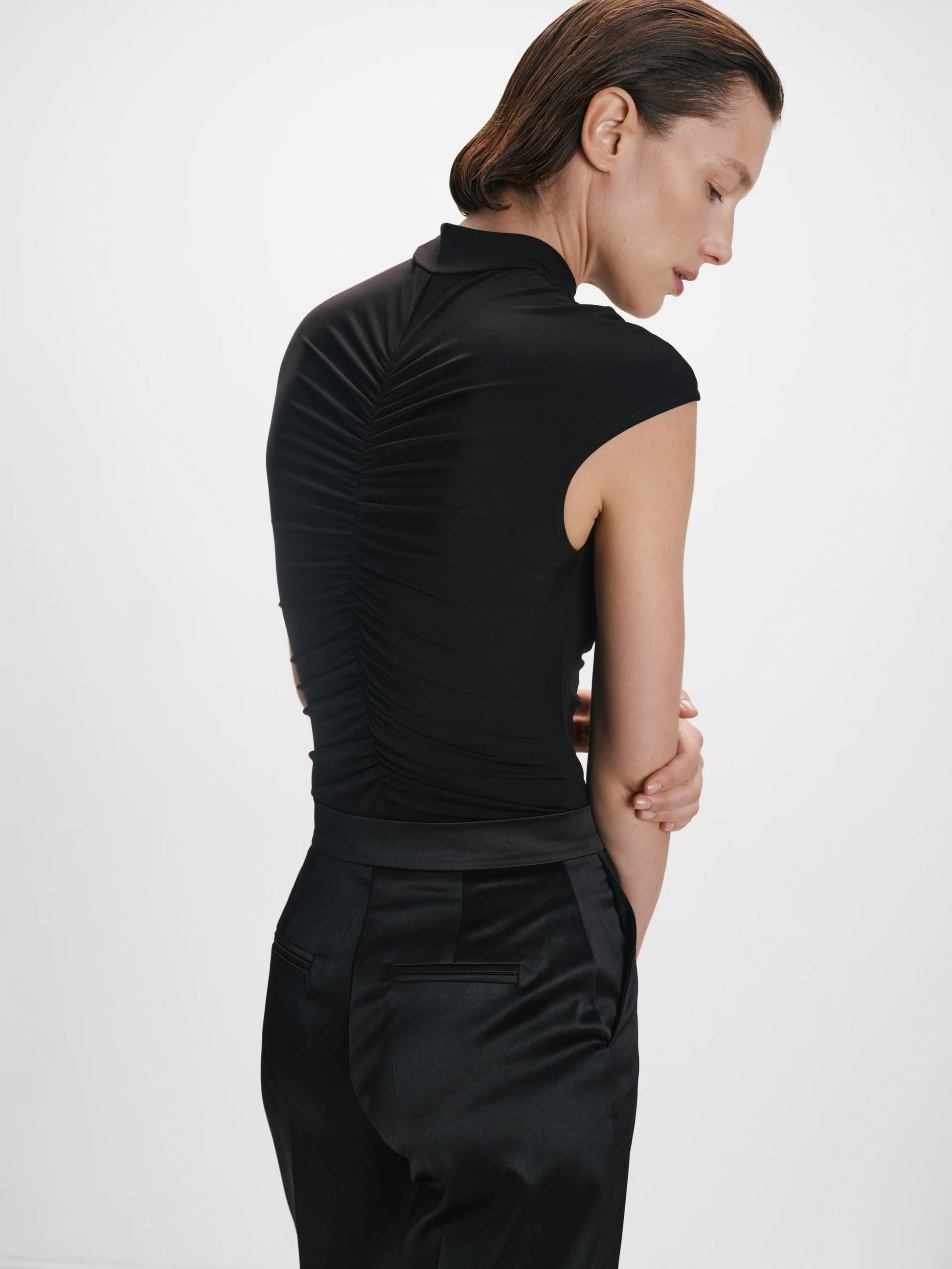 Чорне боді з драпіруванням стане універсальною базою як для офісних луків, так і для вечірніх виходів. Воно ідеально поєднується з брюками з високою талією, спідницями чи жакетом, створюючи сучасний і лаконічний образ.
