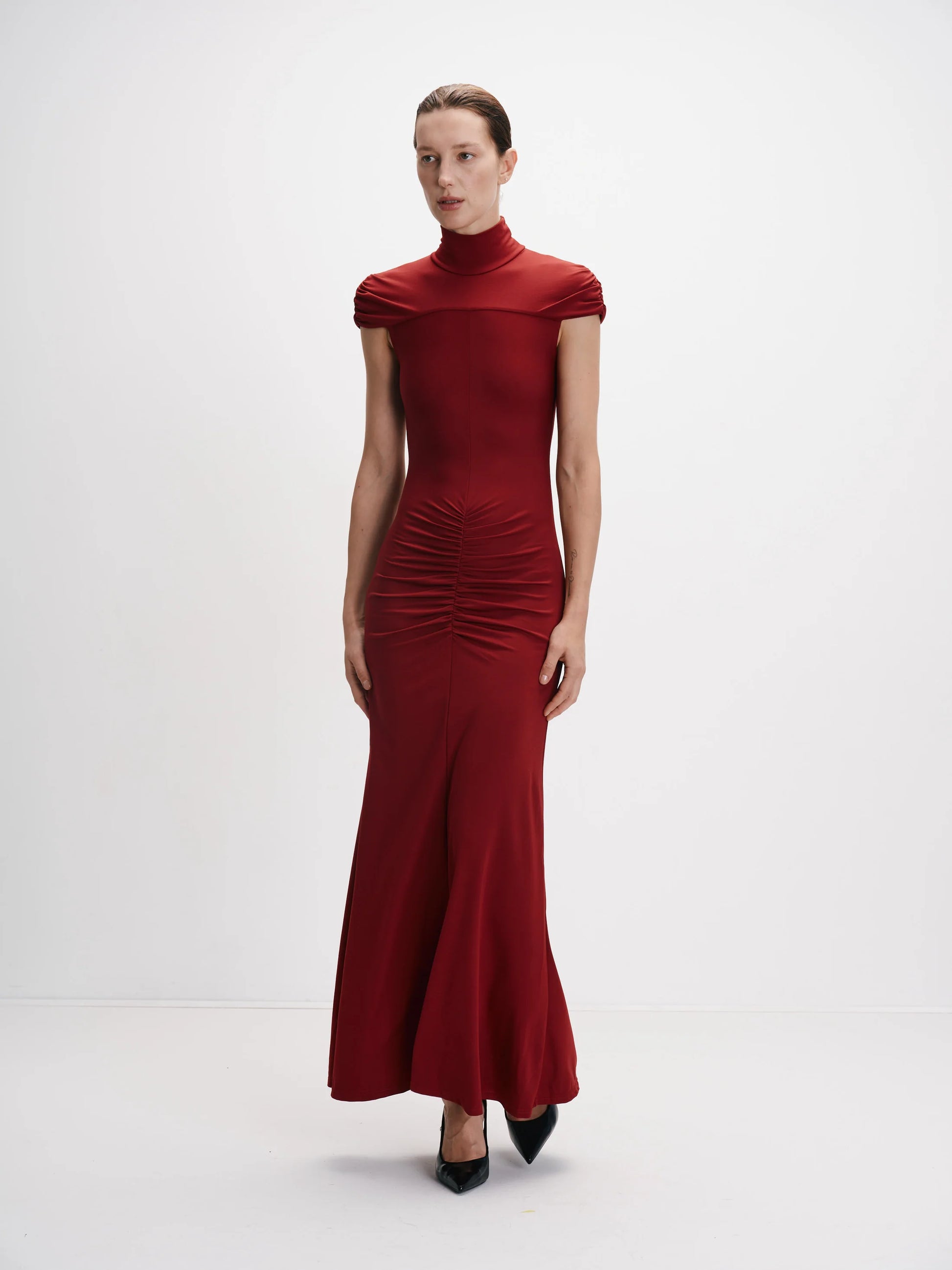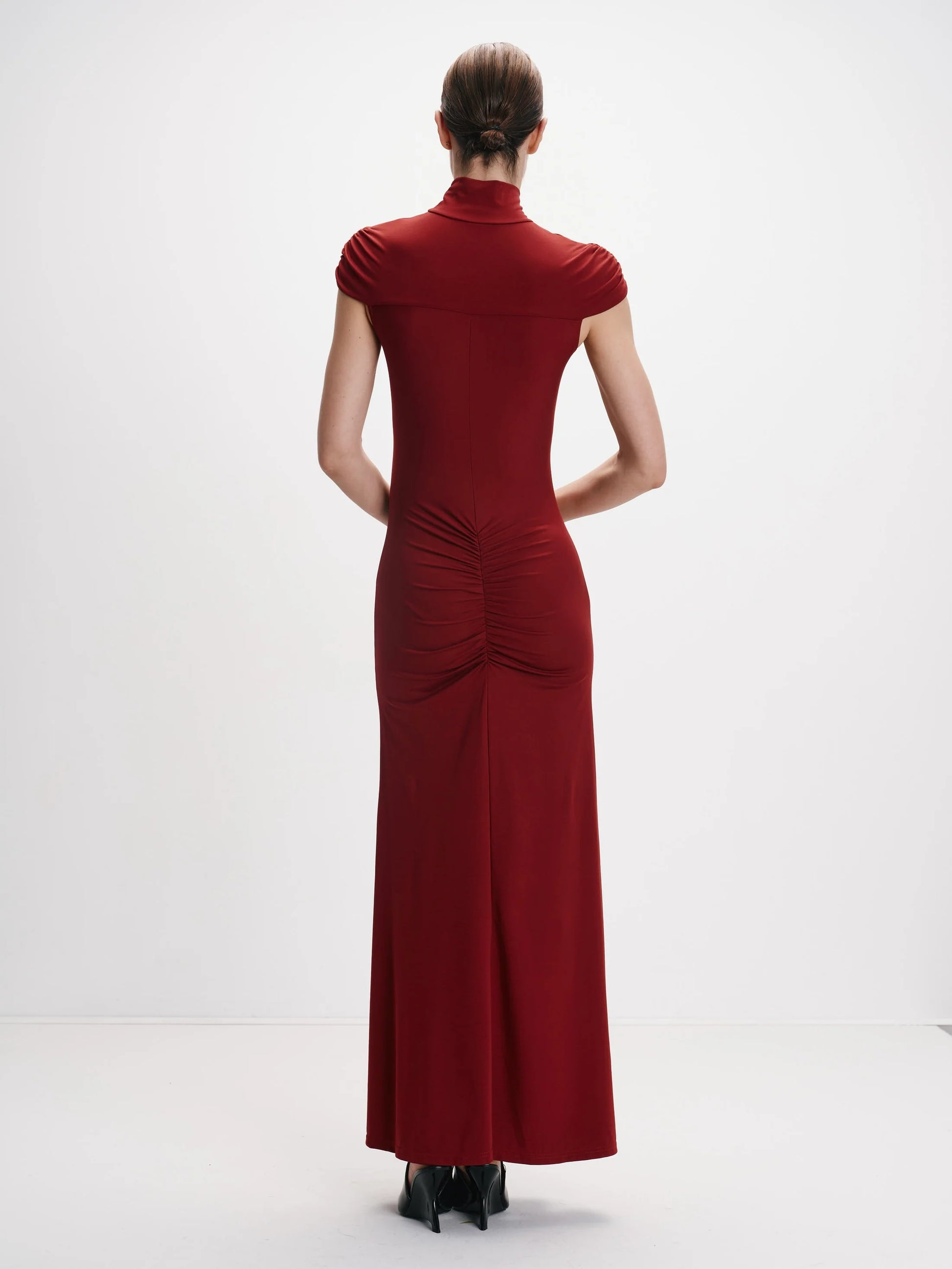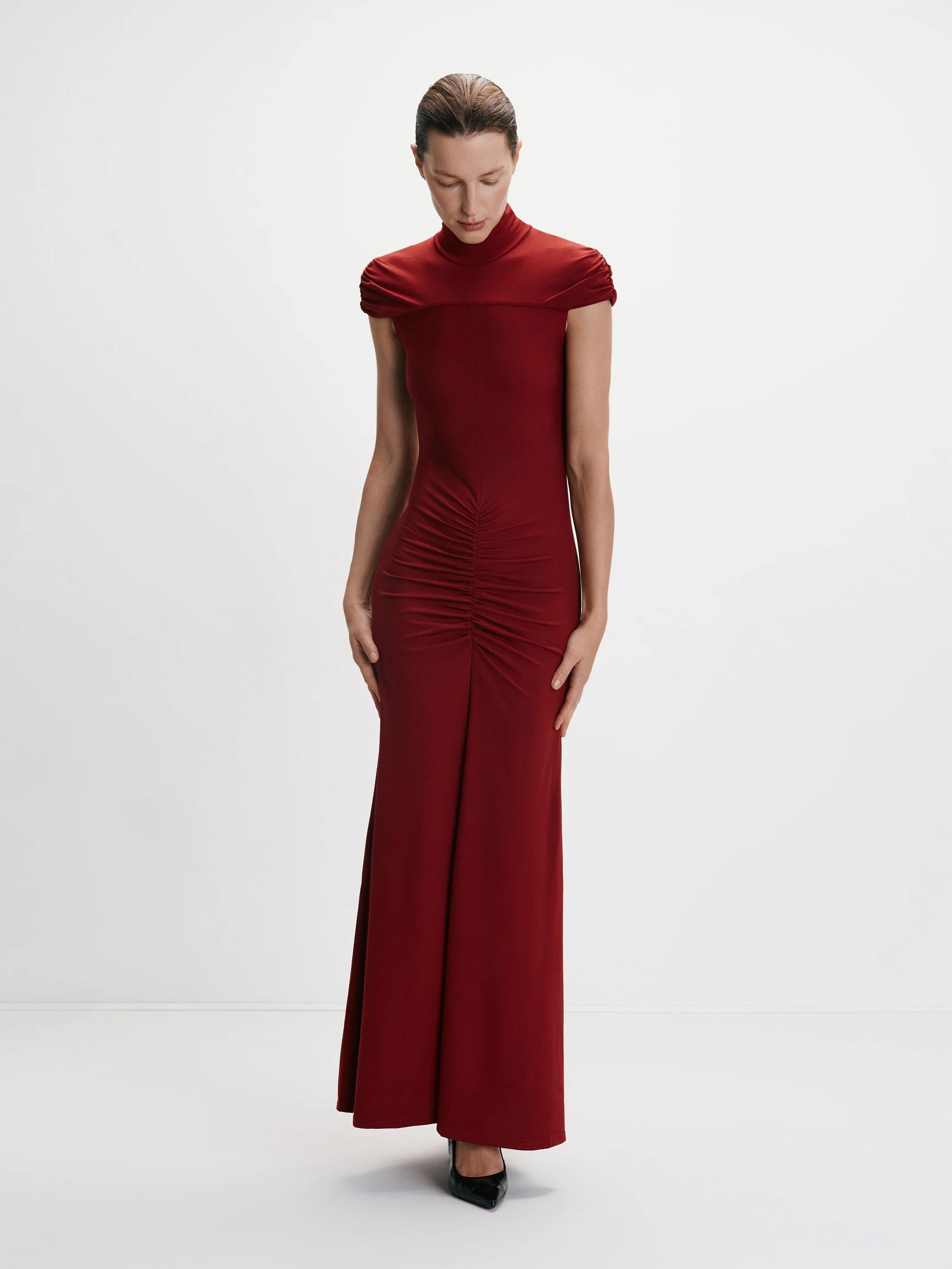 Вишнева жіноча сукня з акцентним драпіруванням – це втілення елегантності та сучасного стилю. Витончене драпірування спереду й ззаду створює гармонійний силует, а акцент на горловині додає образу особливої виразності. Короткий рукав робить модель універсальною, а довжина максі підкреслює жіночність і стриману розкіш.