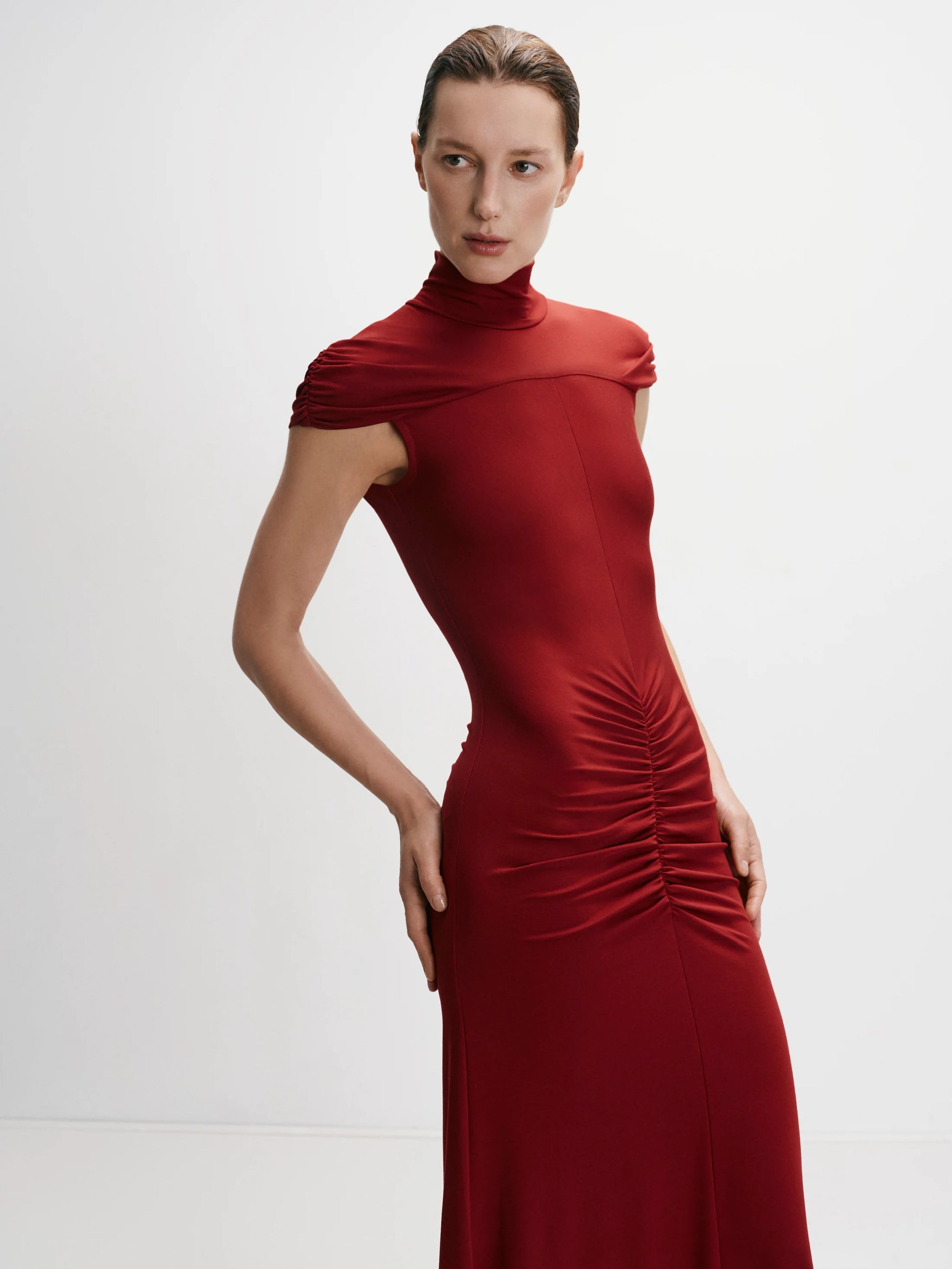 Вишнева сукня з драпіруванням стане вашим безпрограшним вибором для вечірніх виходів і особливих подій. Її можна доповнити мінімалістичними прикрасами та взуттям на підборах, щоб підкреслити лаконічність, або ж яскравими аксесуарами для створення виразного акценту.
