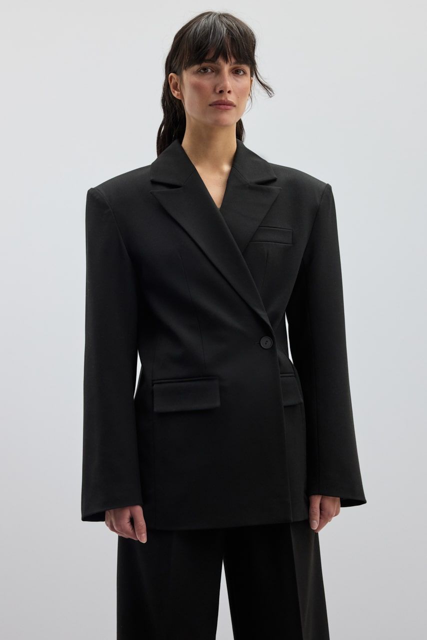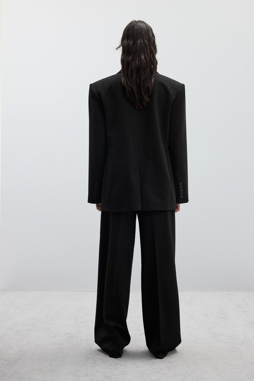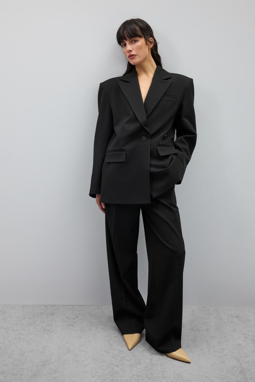 Застібнутим на ґудзики, розташовані вздовж планки. Такий однобортний жакет повністю відповідає стилістиці oversize. Приспущена лінія плеча дозволяє створити трендовий маскулінний образ з ефектом легкої невимушеності.