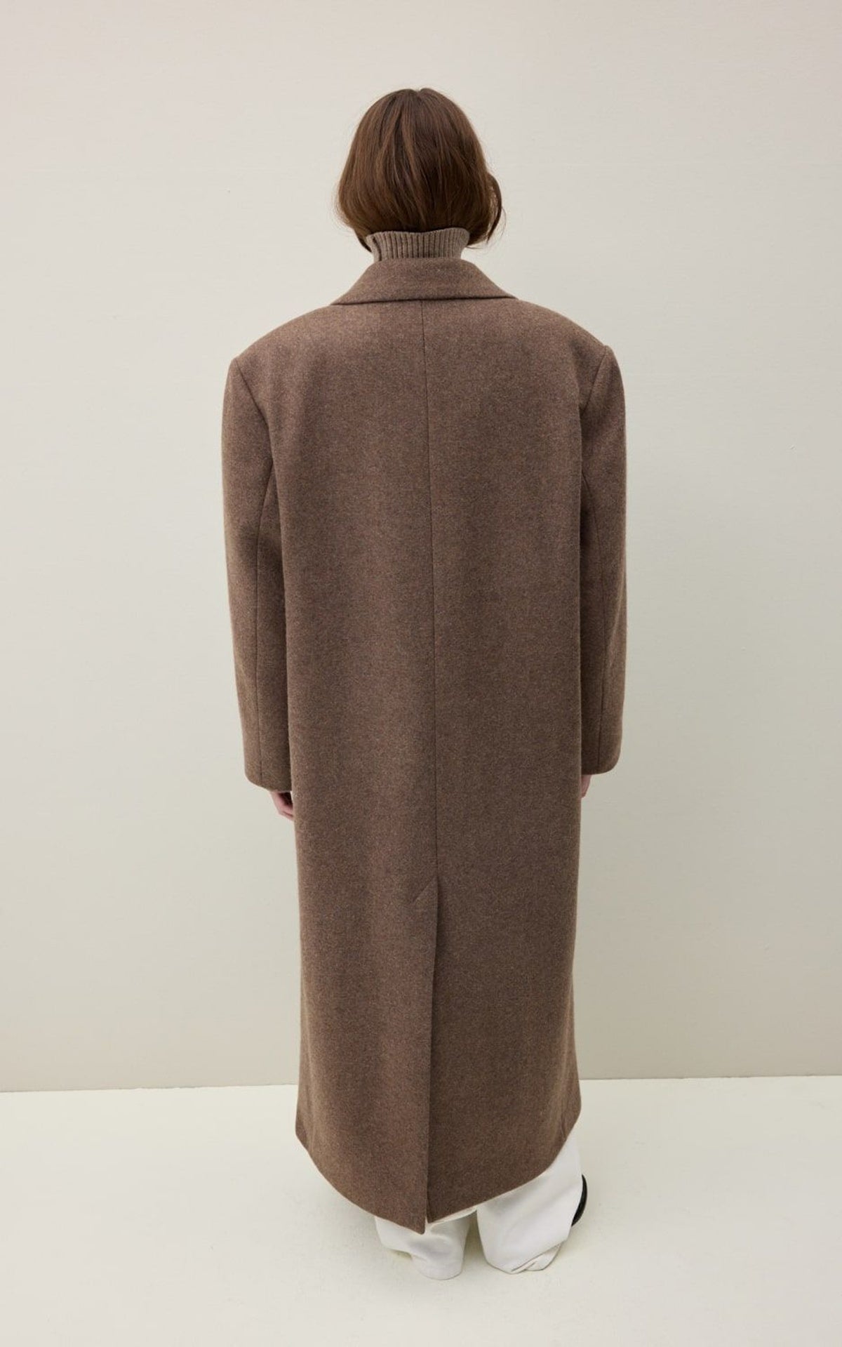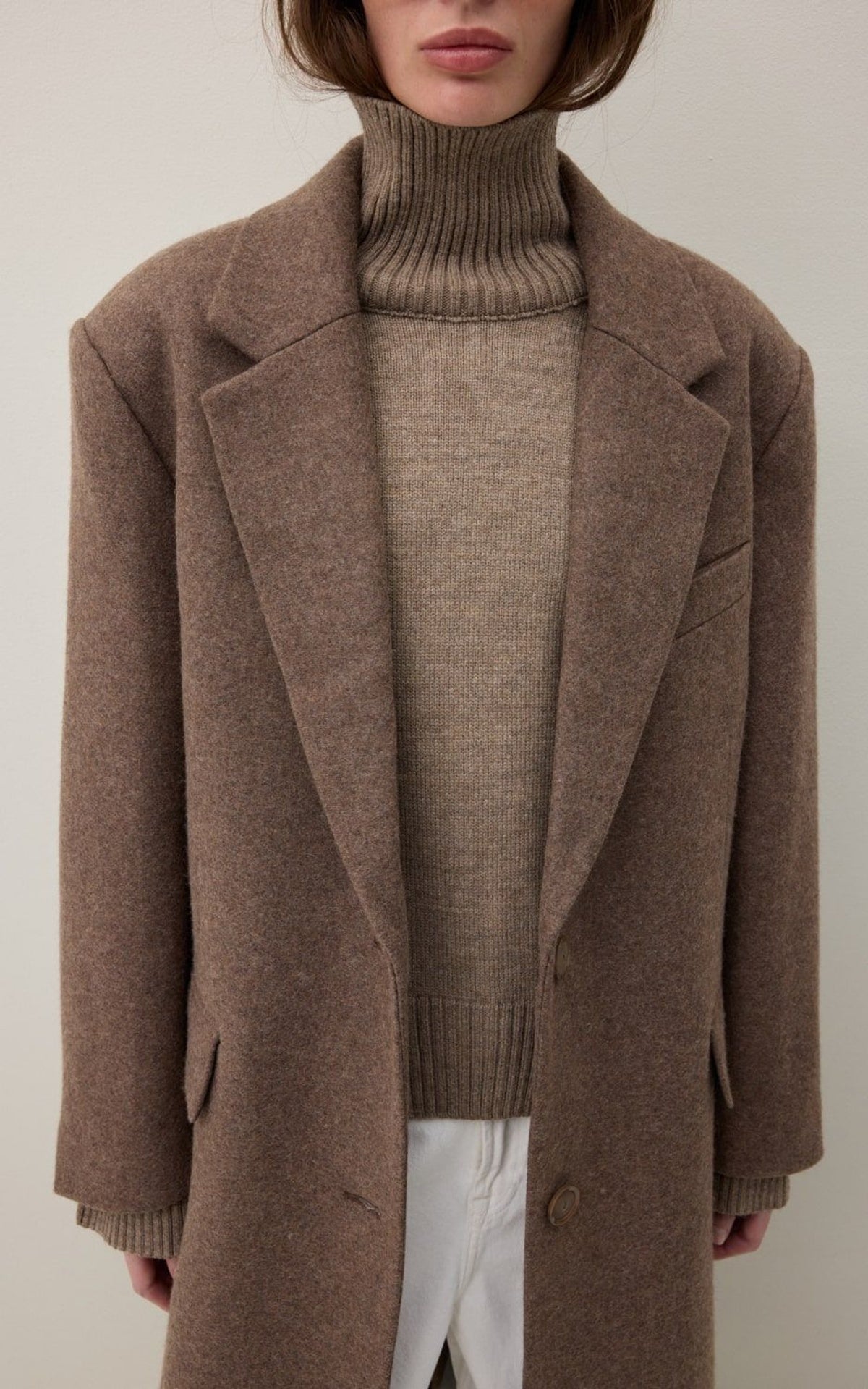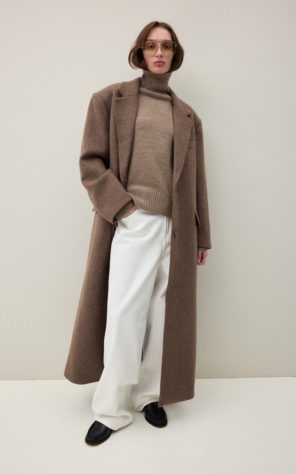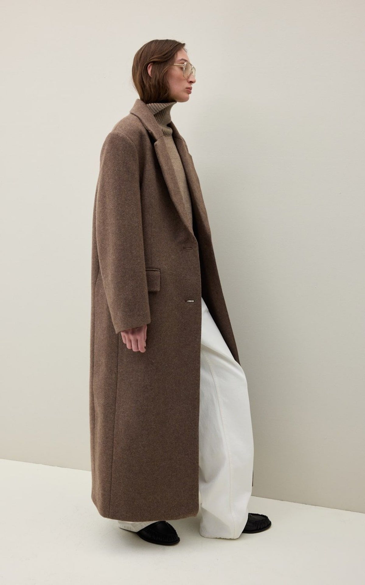 Пряме вовняне пальто довжини максі зі спущеною лінією плечей — це втілення справжньої елегантності та шику, яке ідеально підходить для ефектних виходів восени. Модель, виконана з теплого фактурного матеріалу, дарує тепло та комфорт у прохолодні дні. Однобортний крій та oversize силует створюють виразний образ, а спущена лінія плеча та загострені лацкани додають сучасну графічність.