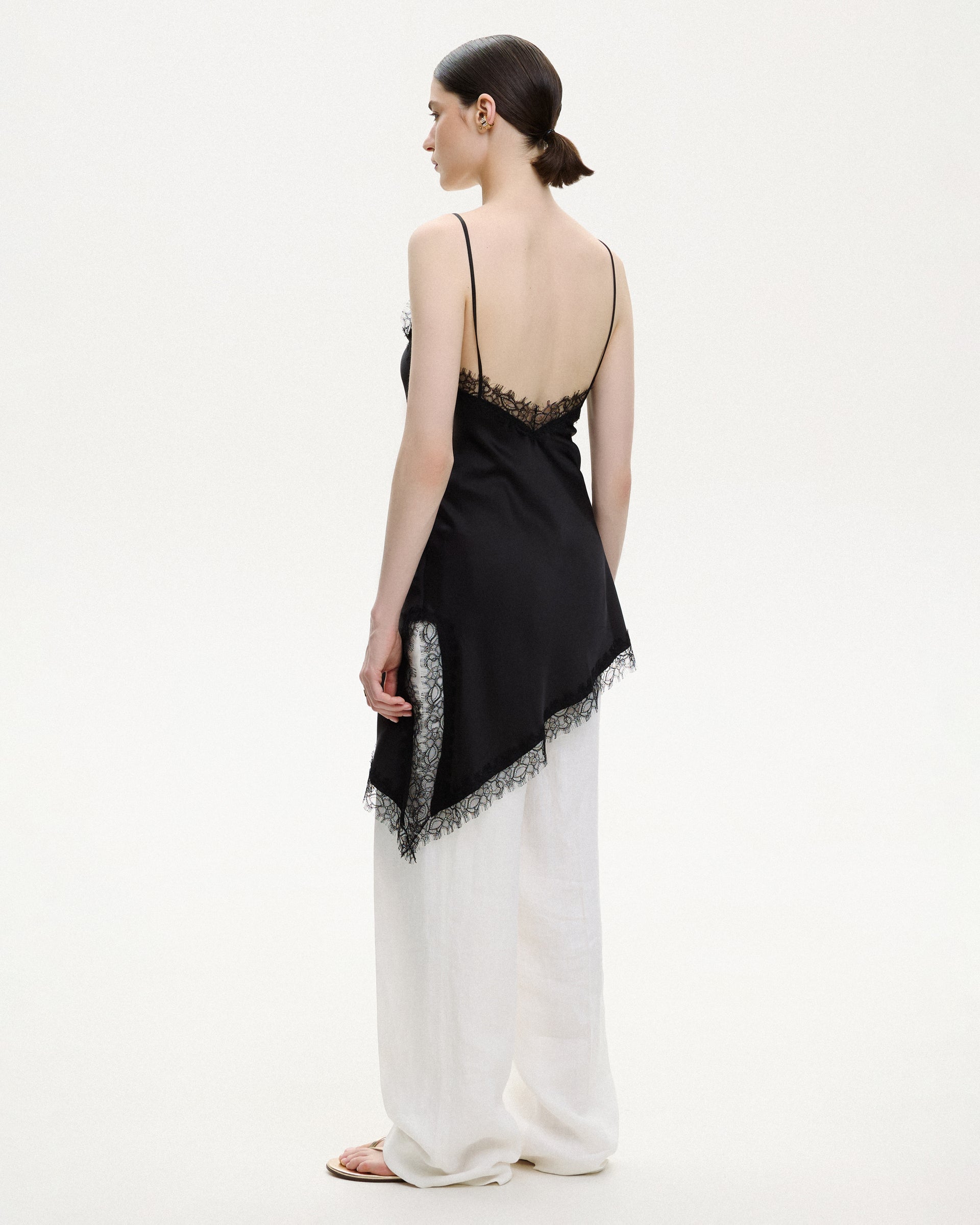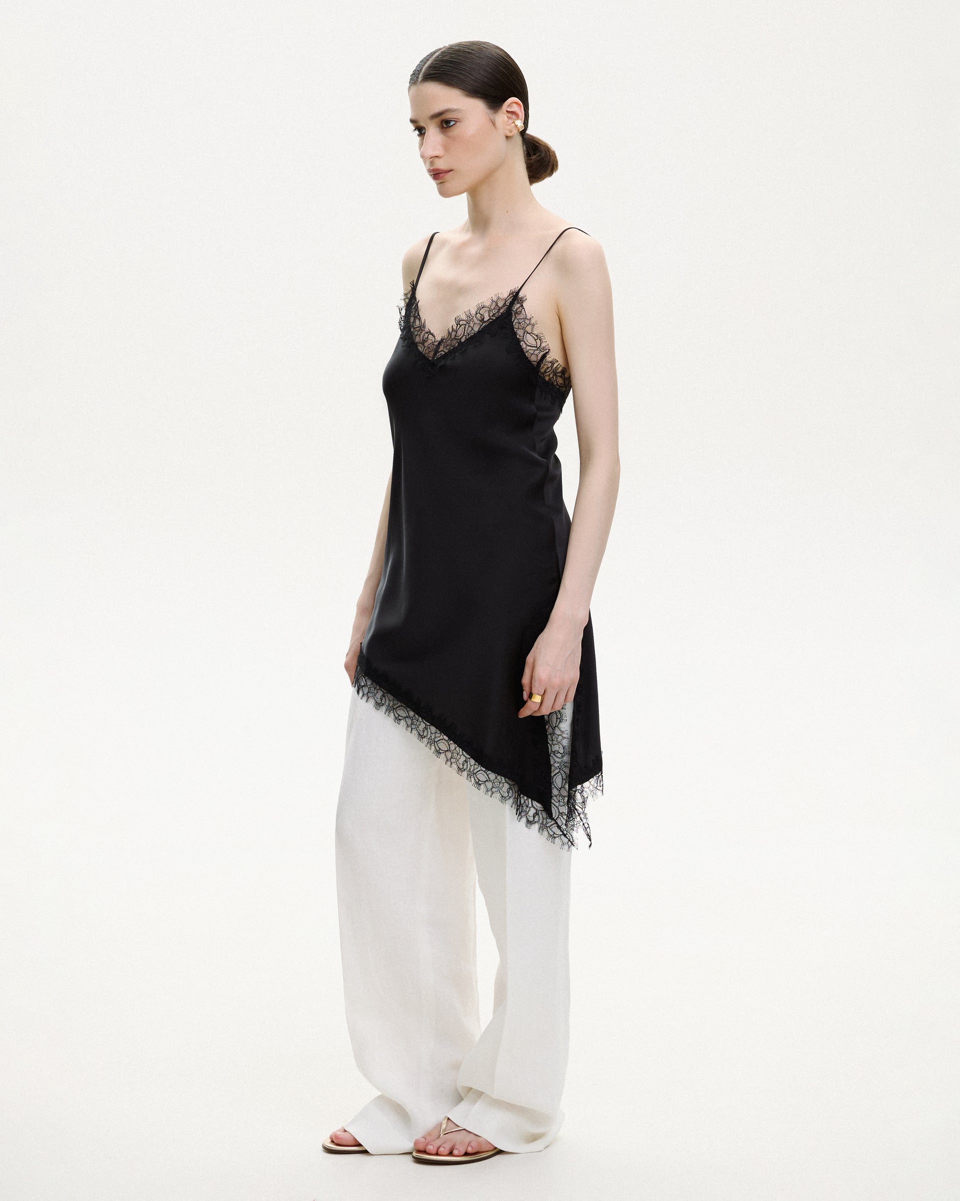 Асиметричний крій, краї оздоблені французьким шантильє.