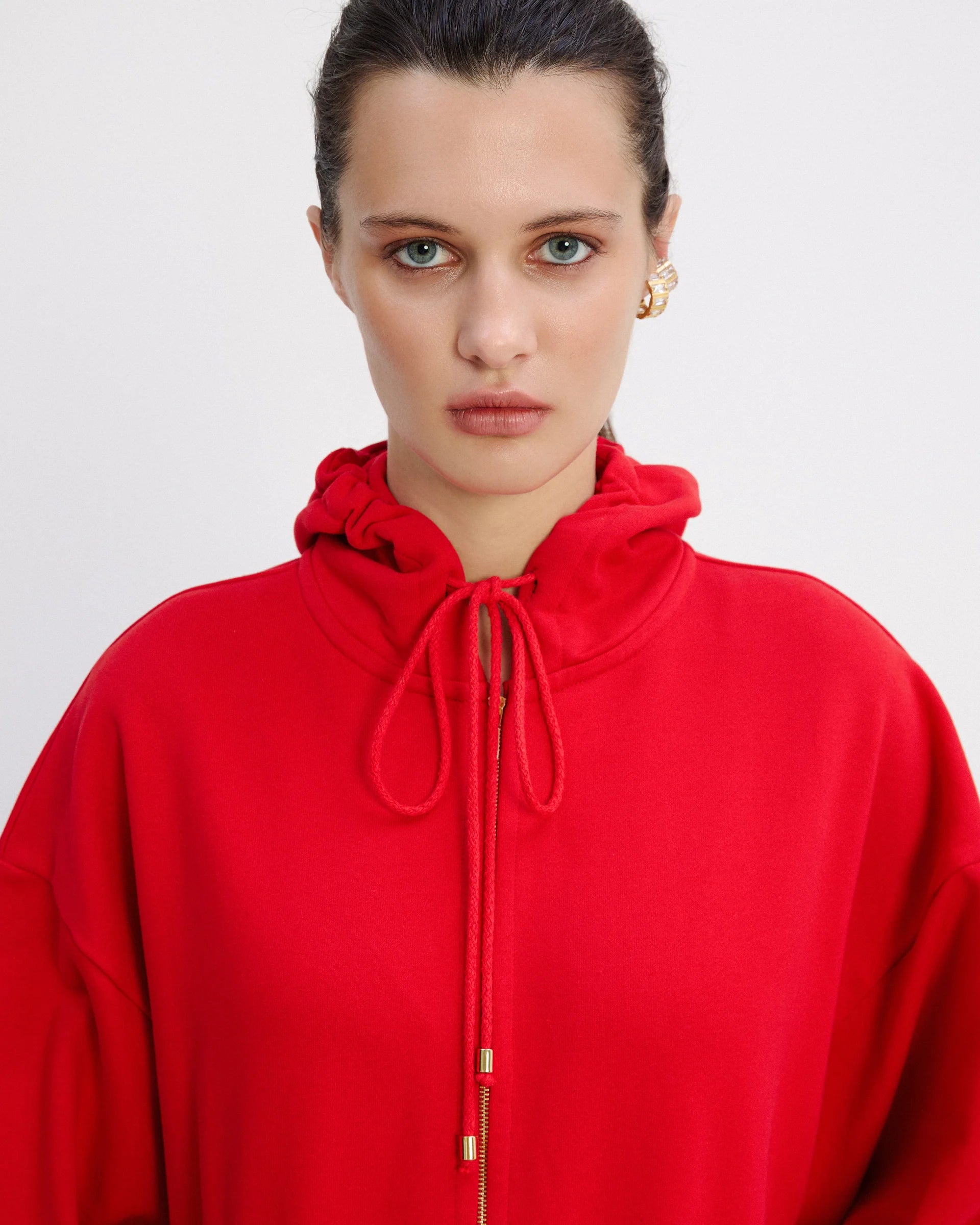 Дві кишені спереду, еластичні манжети та нижня гумка, куліса в капешоні.