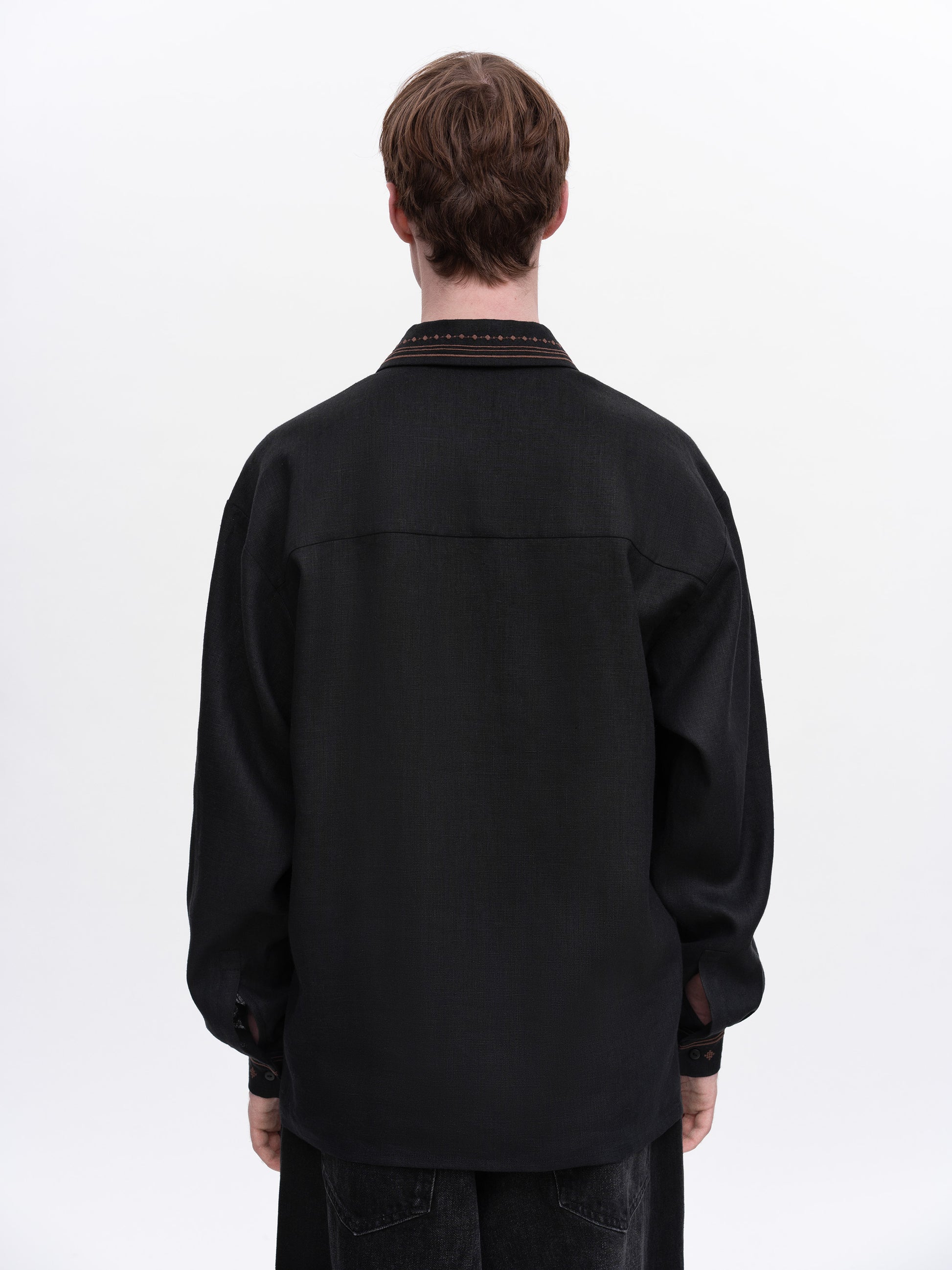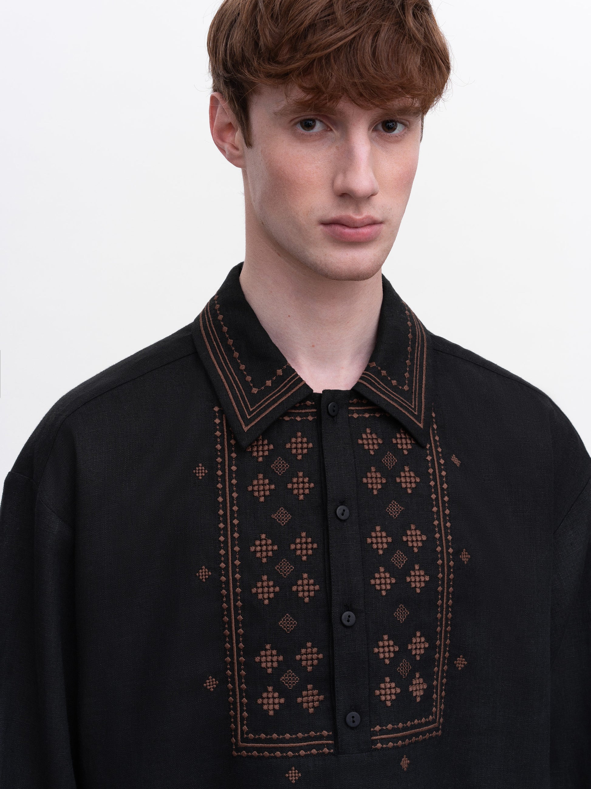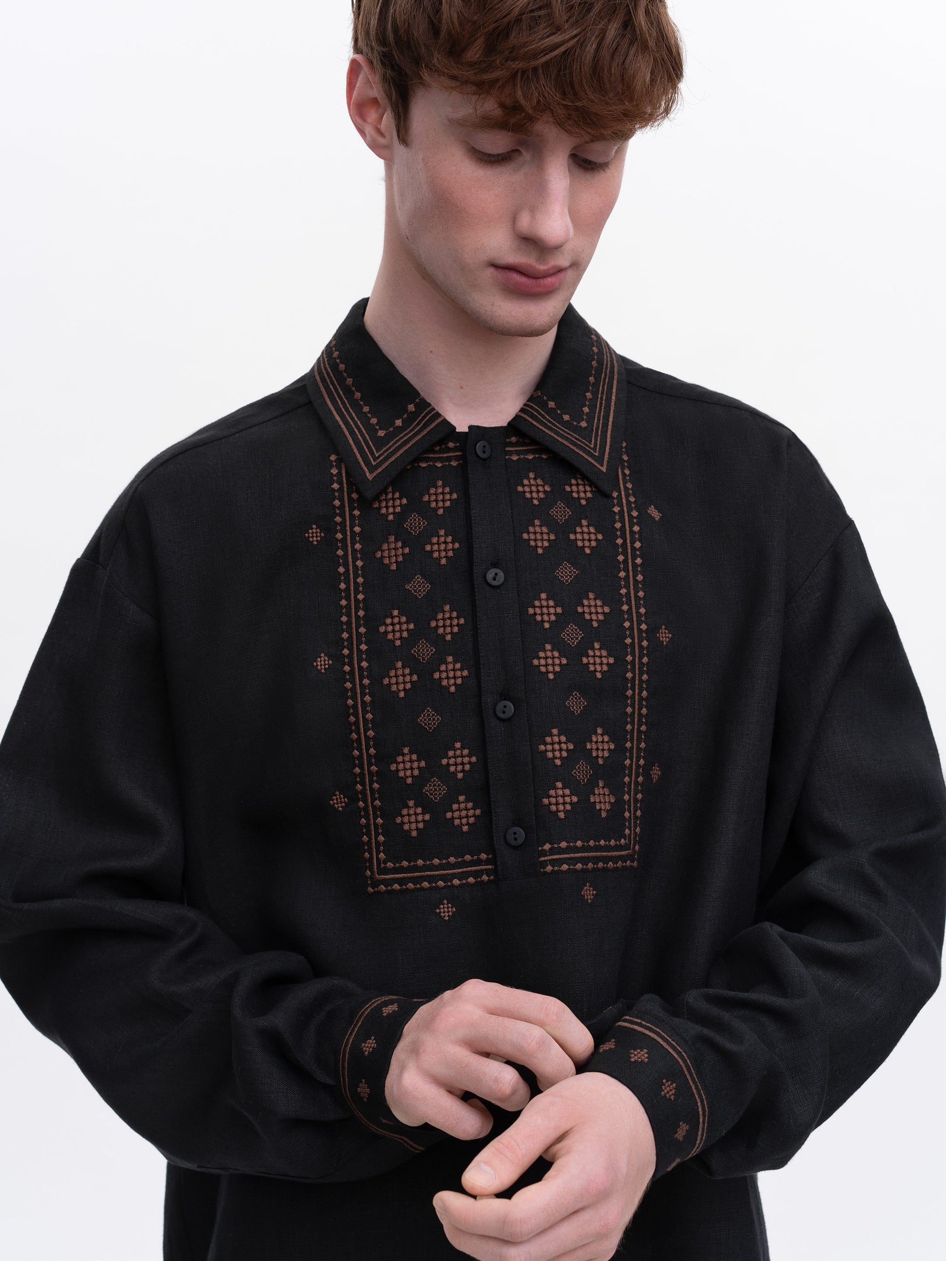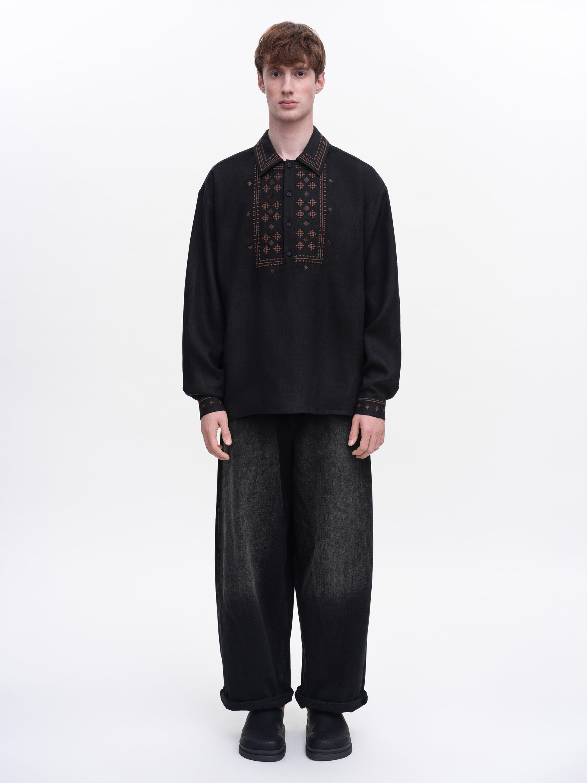 Вільний крій сорочки доповнений широкими рукавами з вишитими манжетами, відкладним коміром і застібкою на ґудзики.