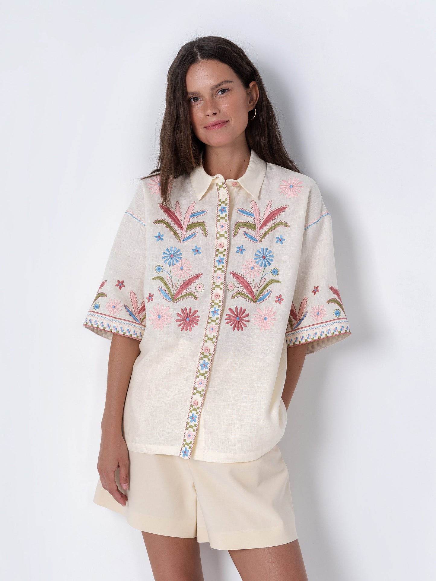 На сорочці зображені яскраві стилізовані весняні квіти: кульбабка, пролісок та ромашка.