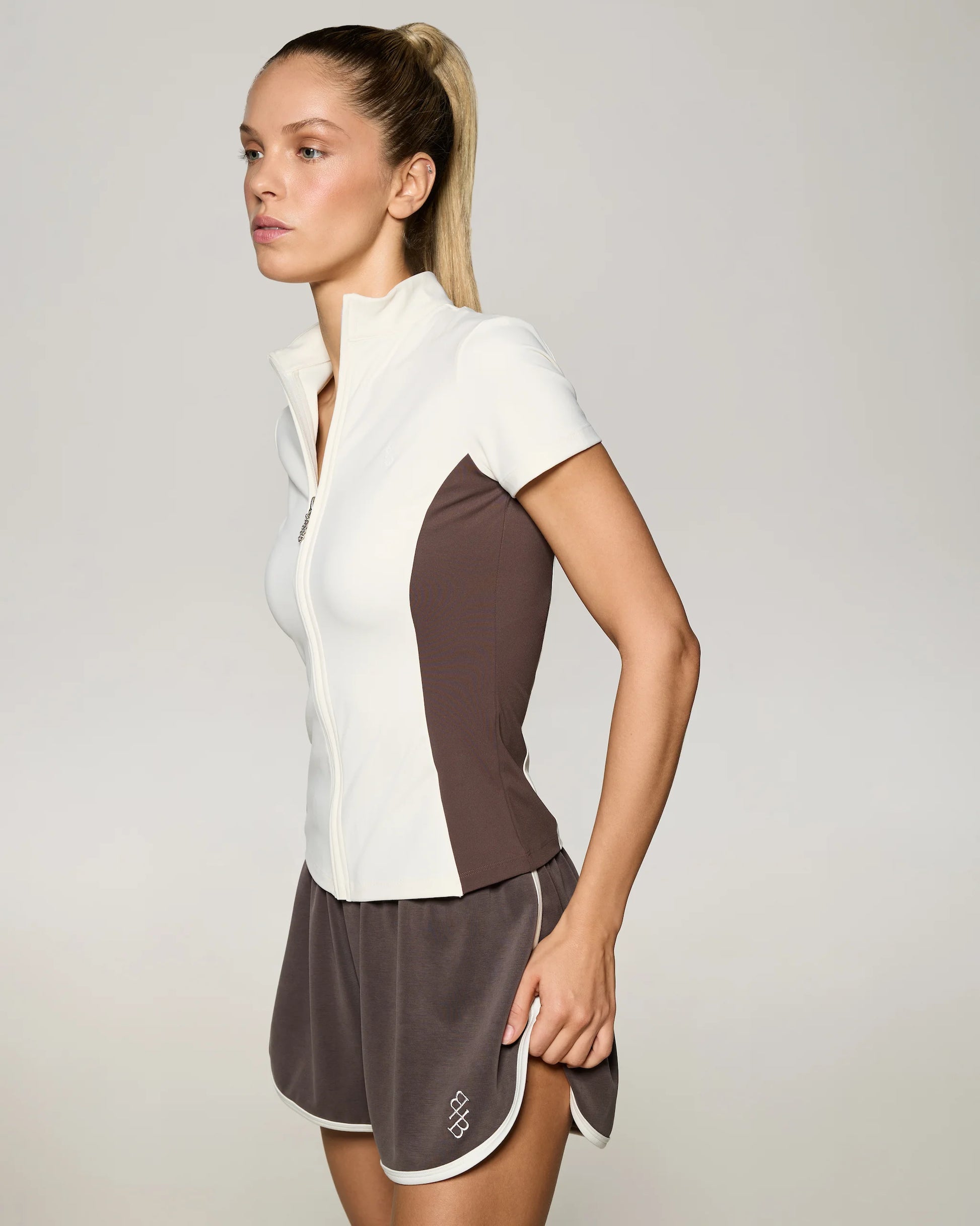Зіп-футболка з інноваційної soft-touch тканини, у якій спортивна функціональність поєднується з сучасною casual-естетикою. Контрастні вставки додають моделі графічності, а slim-силует підкреслює фігуру та формує чіткі пропорції образу.