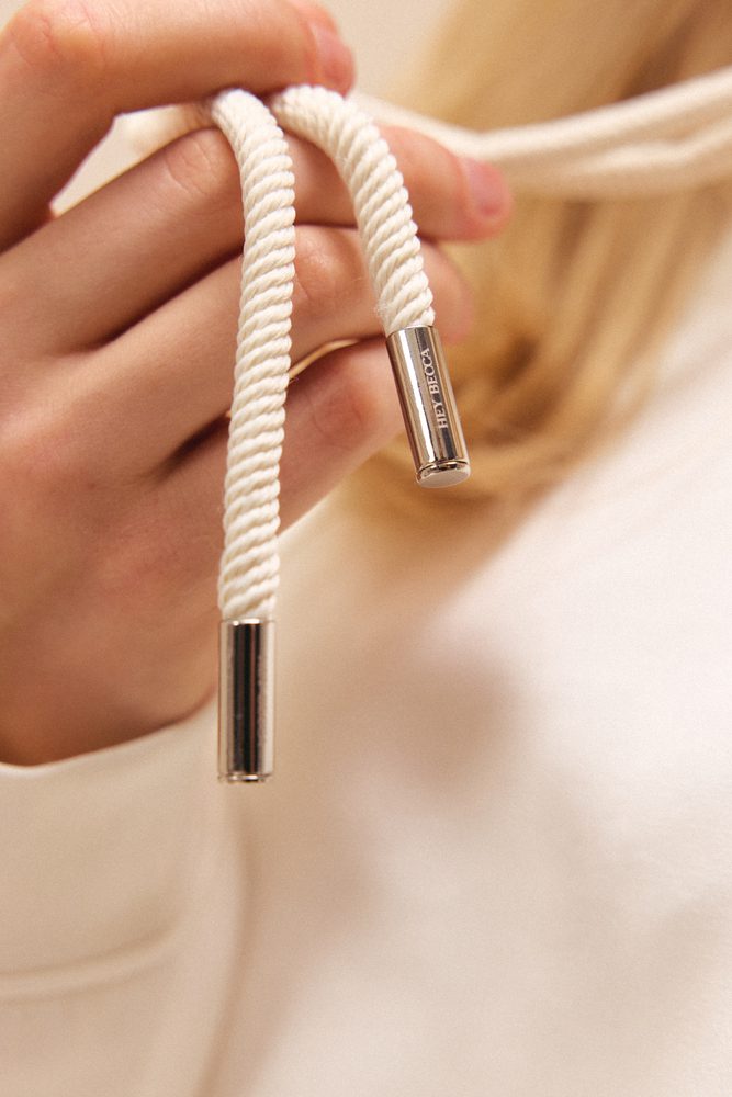 Затишний капюшон із підкладкою та кулісою доповнено шнурком канатного плетіння з металевими люверсами й сріблястою брендованою фурнітурою HEY BECCA. Рукав крою реглан робить посадку ще більш комфортною, а силует невимушеним та розслабленим. Внизу зліва худі прикрашене нашивним лого бренду.