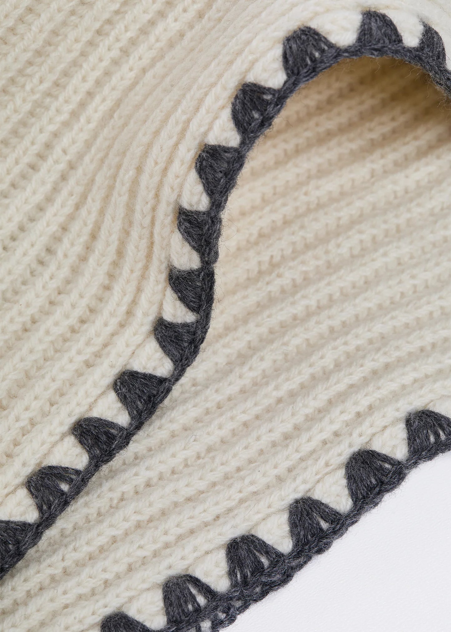 В‘язаний шарф декорований графітовими стібками по краю. Виконаний з м‘якого кашеміру.