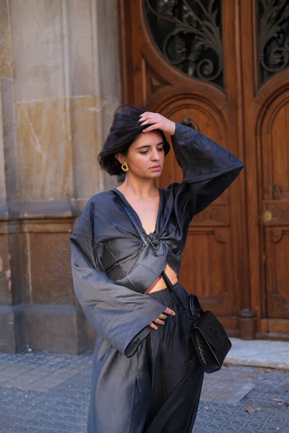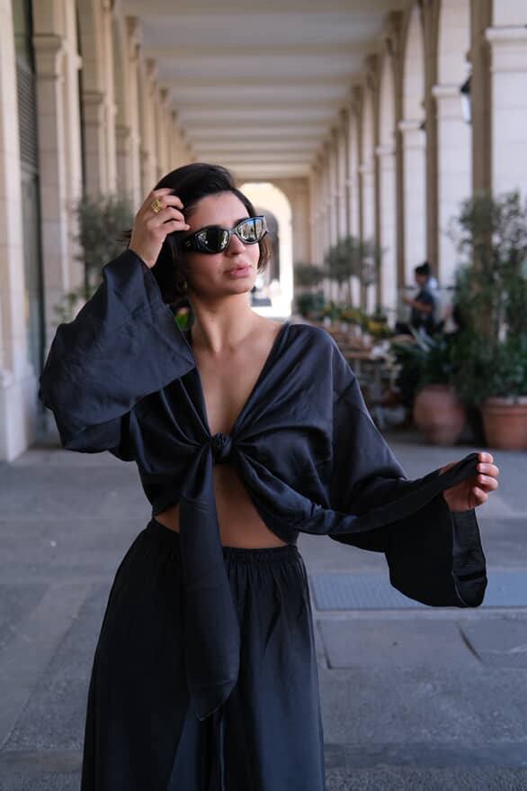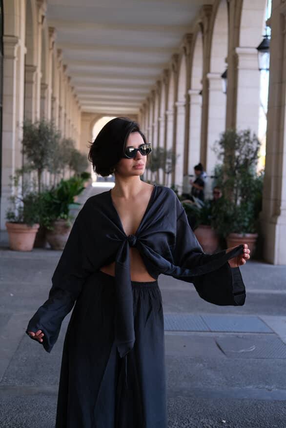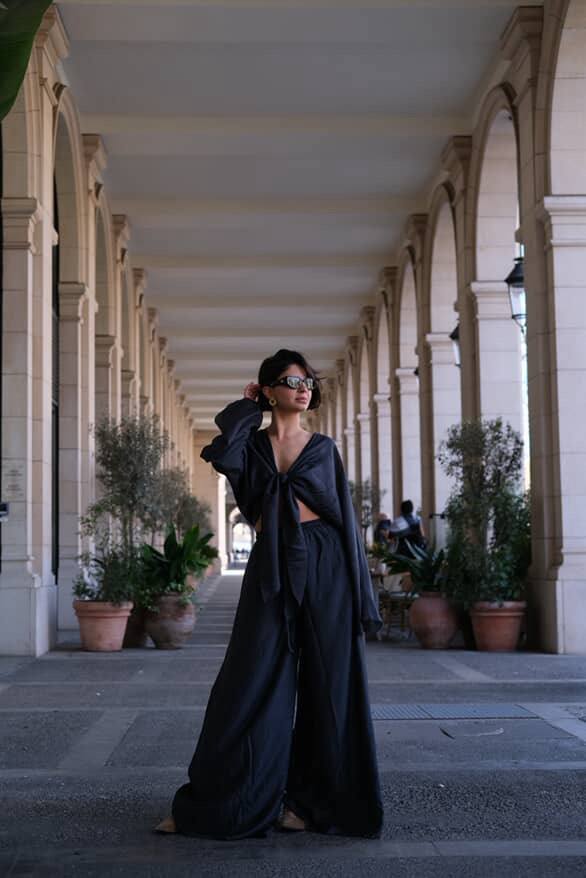 Костюм La Fleur виконаний із напівпрозорої легкої тканини. Верх із широкими рукавами має глибоке декольте та зав’язується спереду на довгий бант. Штани вільного крою з еластичним поясом і зав’язками забезпечують комфорт і легкість. Тканина приємна до тіла та пропускає повітря, що робить образ ідеальним для спекотних днів.