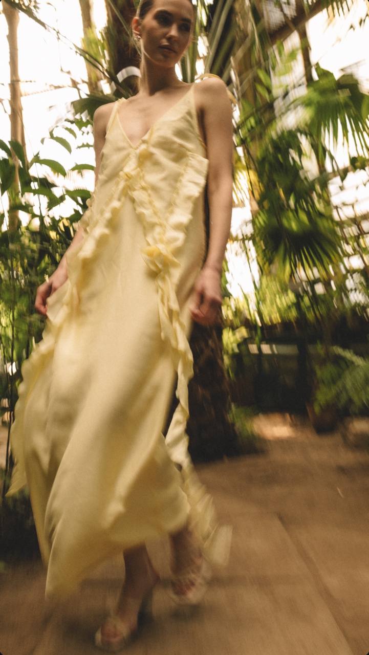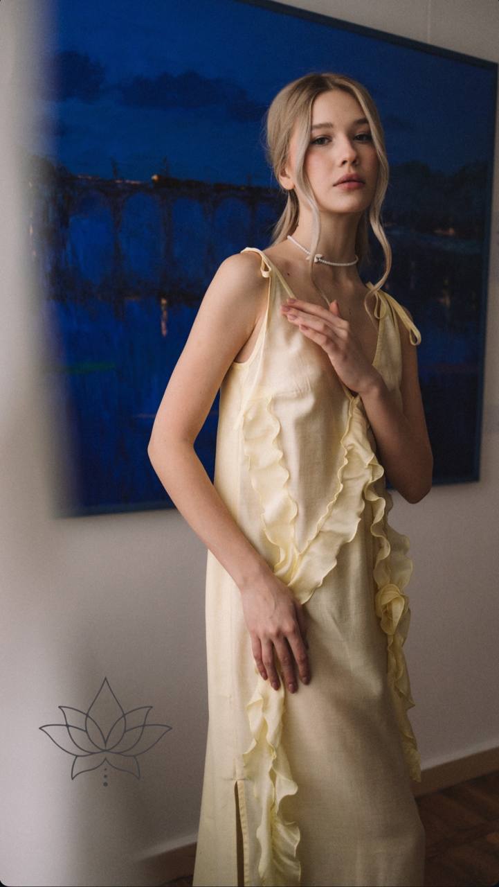 Сукня Fiesta виготовлена з легкої напівпрозорої тканини чорного кольору, має вільний крій максі-довжини. Модель прикрашена рюшами, які спускаються по передній частині, створюючи м’який акцент. Тонкі зав’язки на плечах дозволяють регулювати посадку. Матеріал м’який, добре тримає форму декоративних елементів.