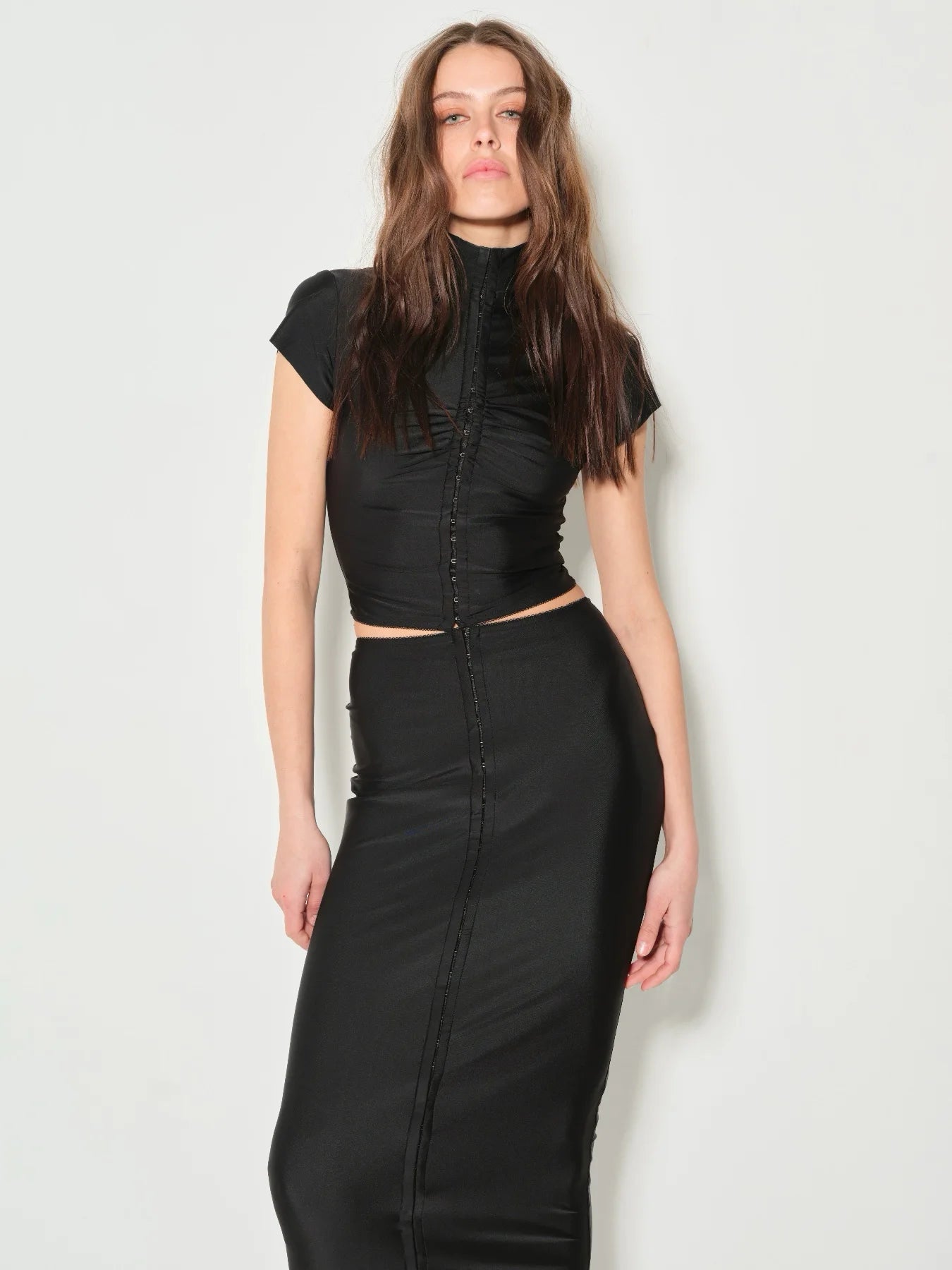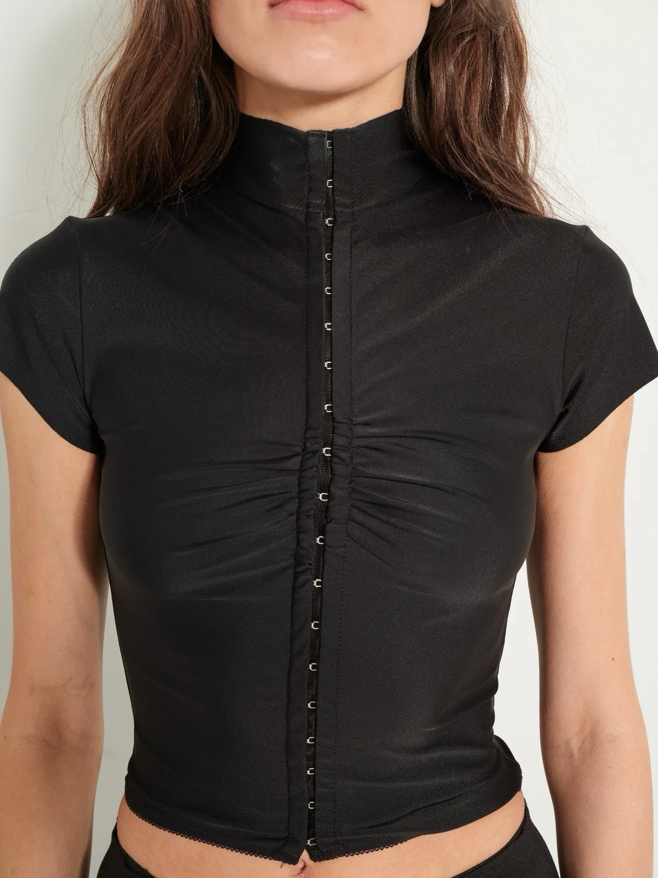 Модель сукні Sirena, яка стала улюбленою, тепер — в інтерпретації топа. Срібні акцентні гачки спереду формують силует і дозволяють регулювати глибину розрізу — більш стримано або сміливіше, залежно від настрою.
