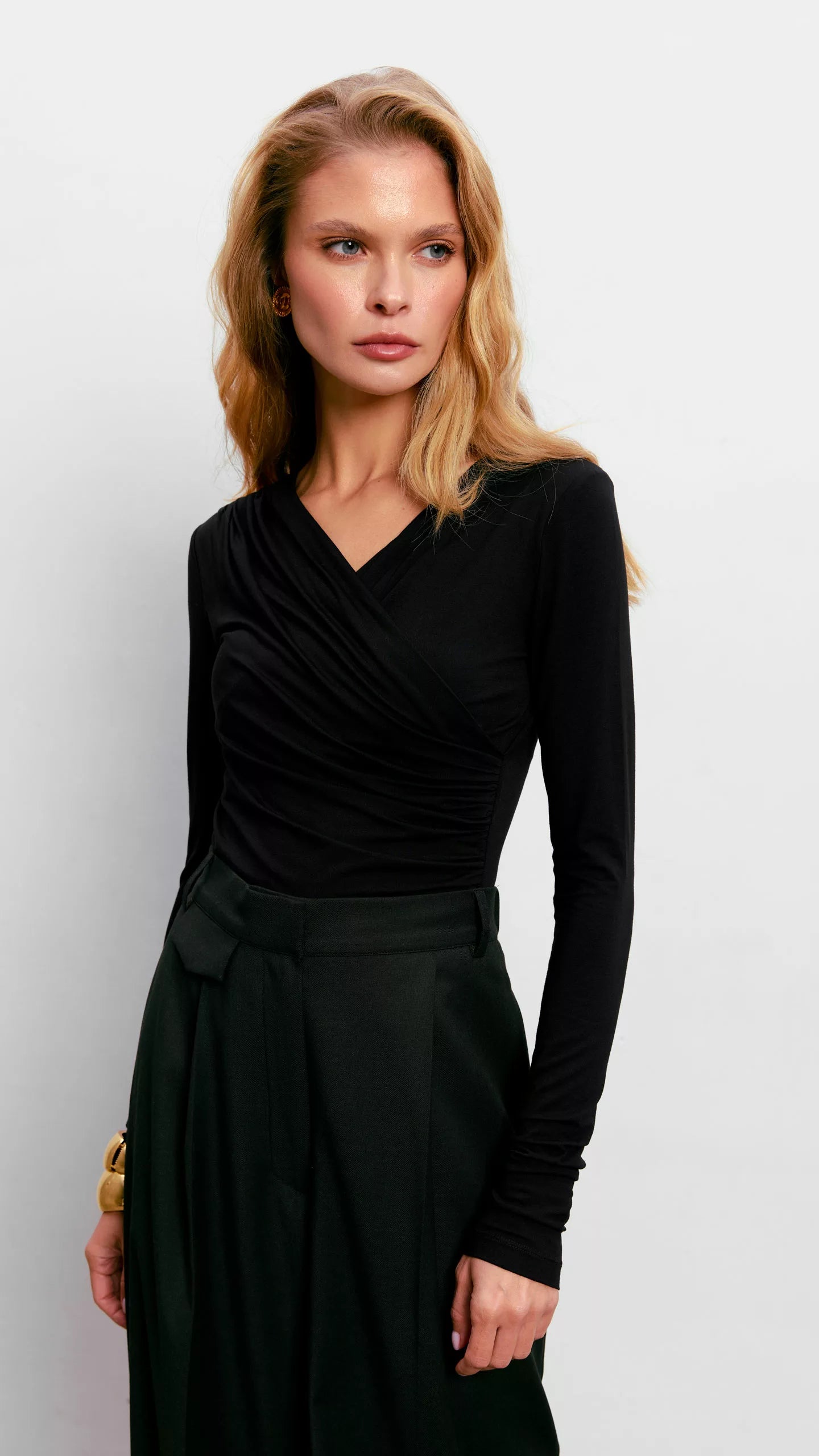 Багатофункціональний лонгслів, який за рахунок драпіювання може бути опущений на одне або обидва плеча, виконаний з м’якого трикотажу. Має подовжені рукави.