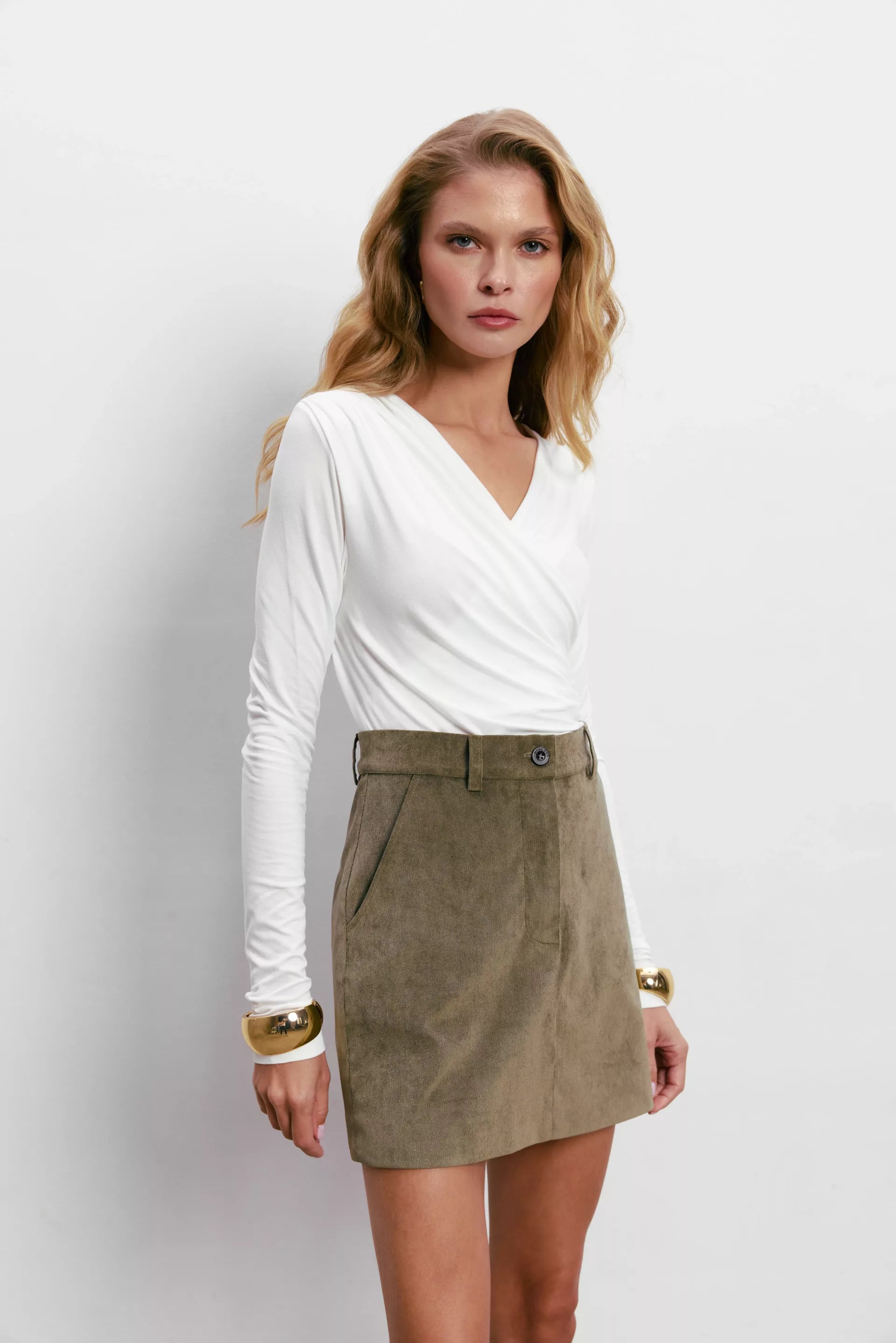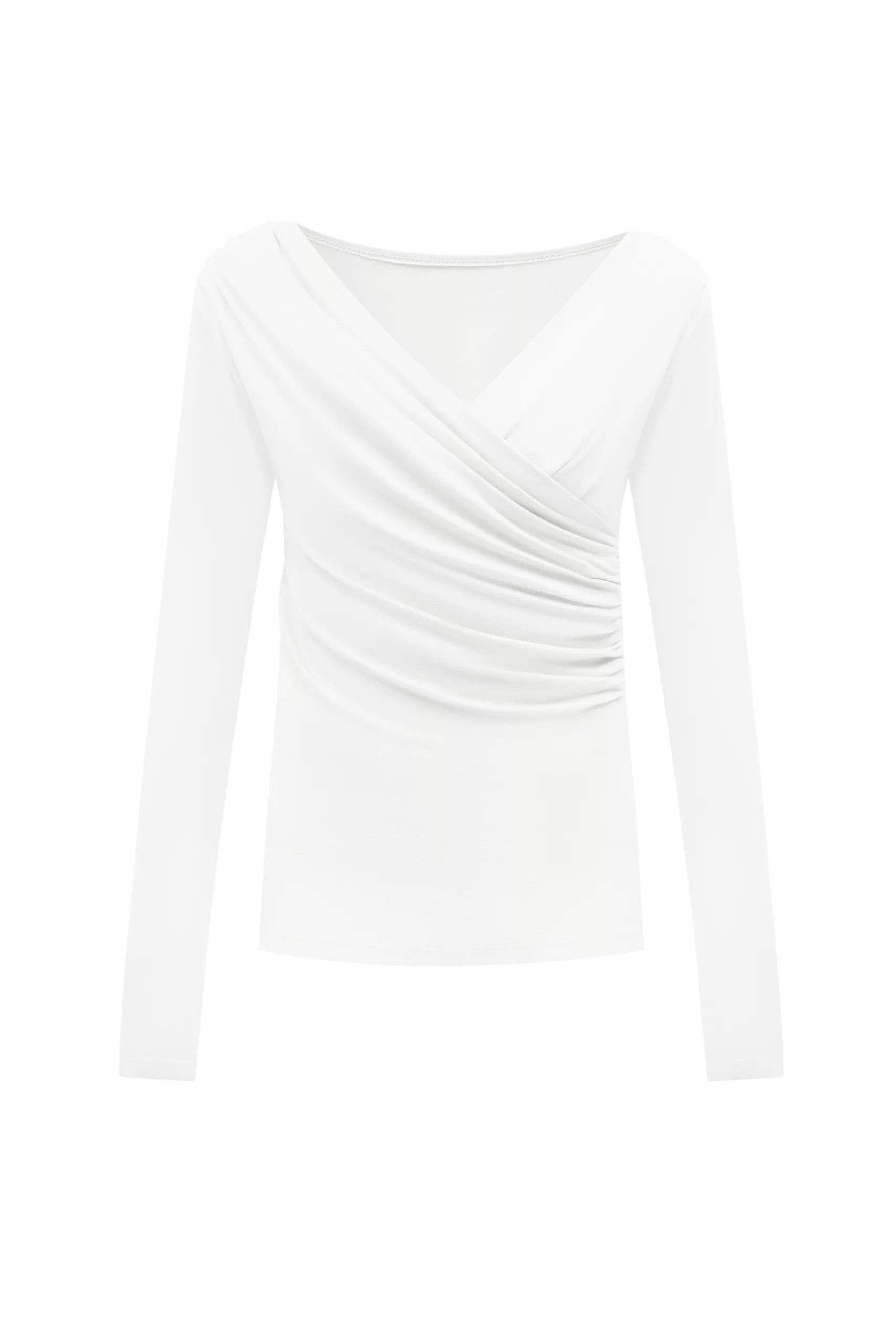 Багатофункціональний лонгслів, який за рахунок драпіювання може бути опущений на одне або обидва плеча, виконаний з м’якого трикотажу. Має подовжені рукави.