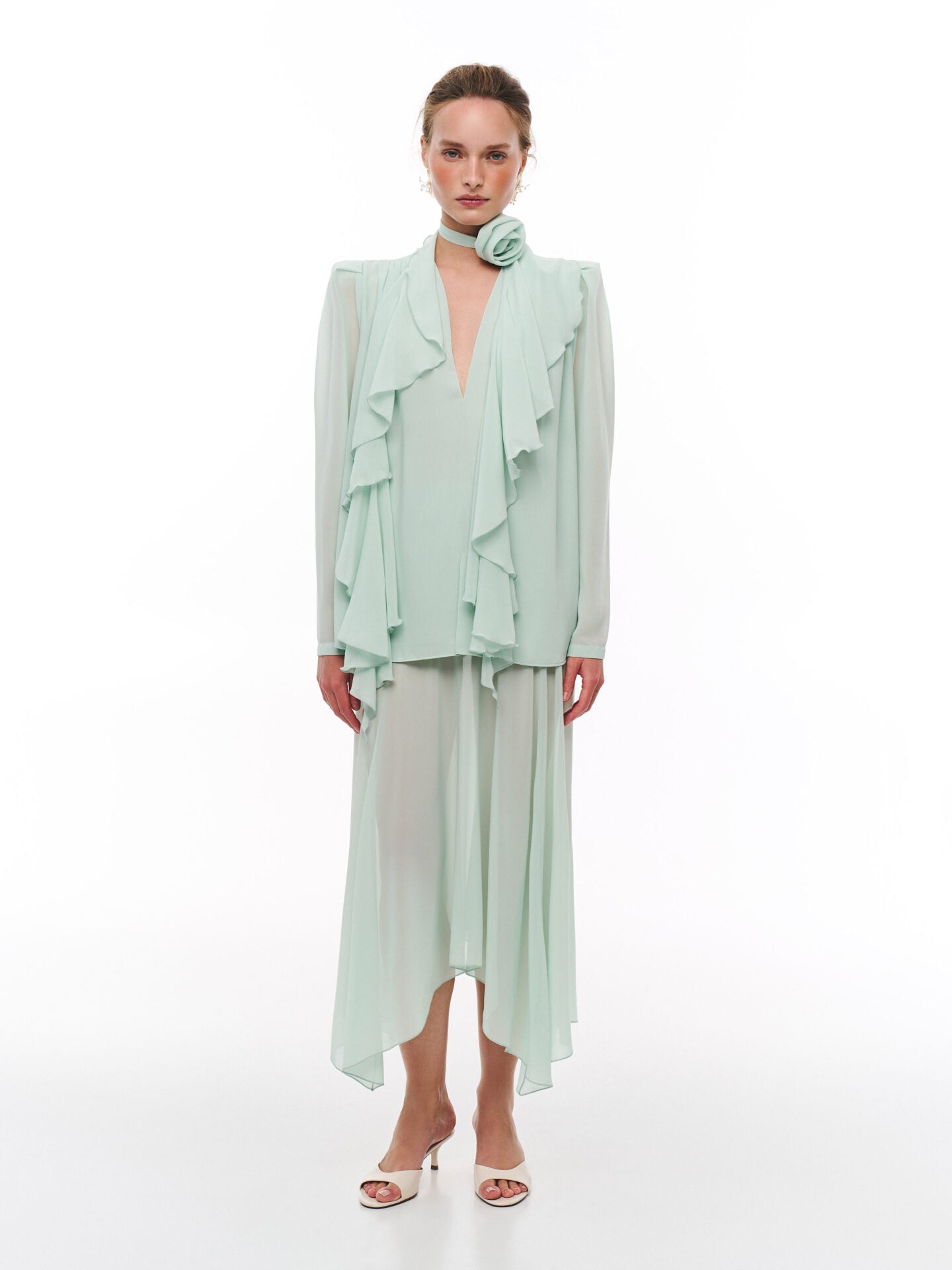 Сатинова блуза об’ємного крою. Рукава-ліхтарики та глибокий виріз надають витонченості  силуету. Блуза виконана з усіма закритими швами та подвійними передніми полочками. В комплекті чокер-шалик.