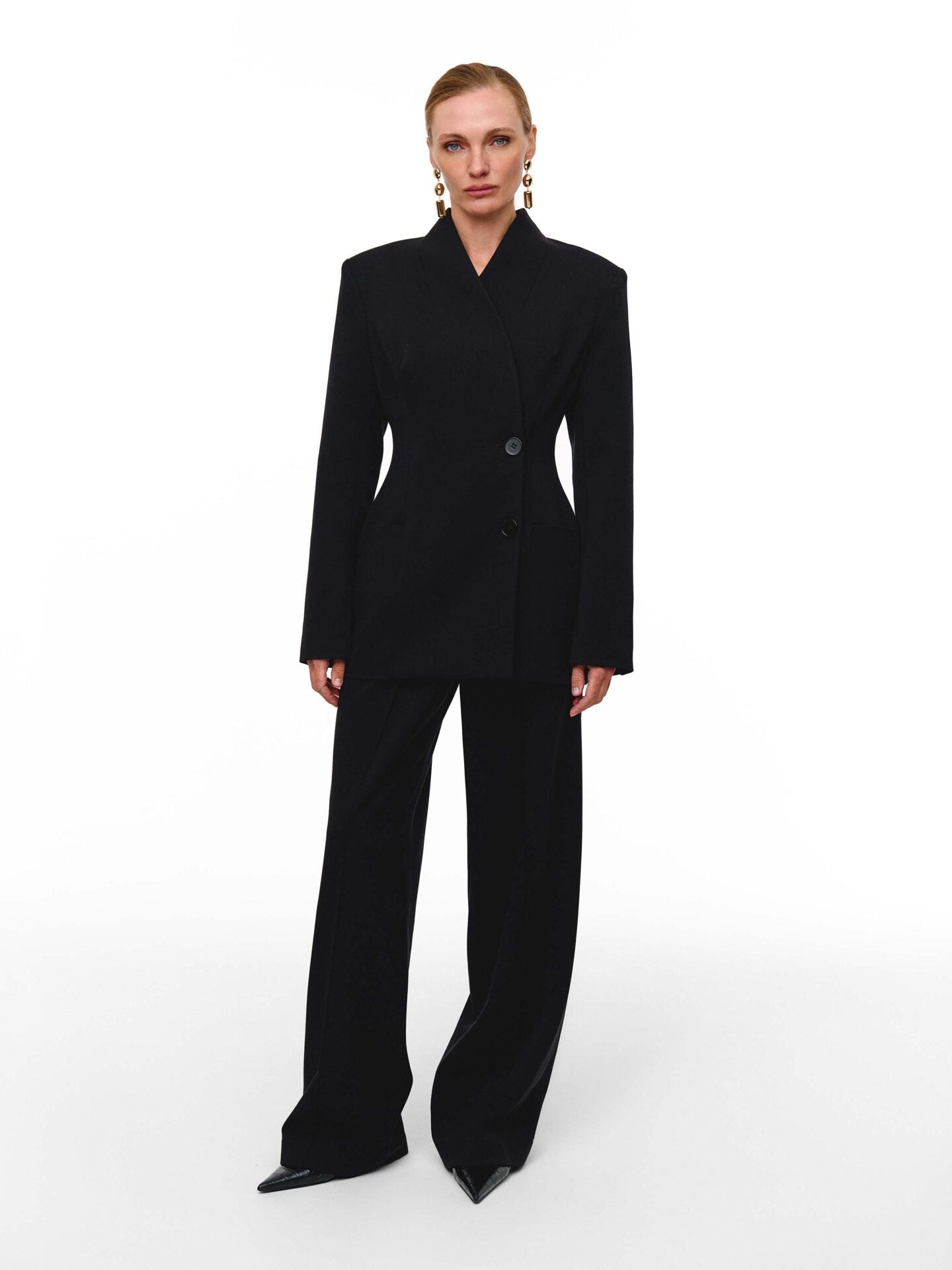 Силуетний піджак з коміром-стійкою. Піджак виконаний з акцентом на талії та стегнах, що надає силуету форми пісочного годинника.  Щільна костюмна тканина. Піджак застібається спереду на акцентні металеві гудзики.