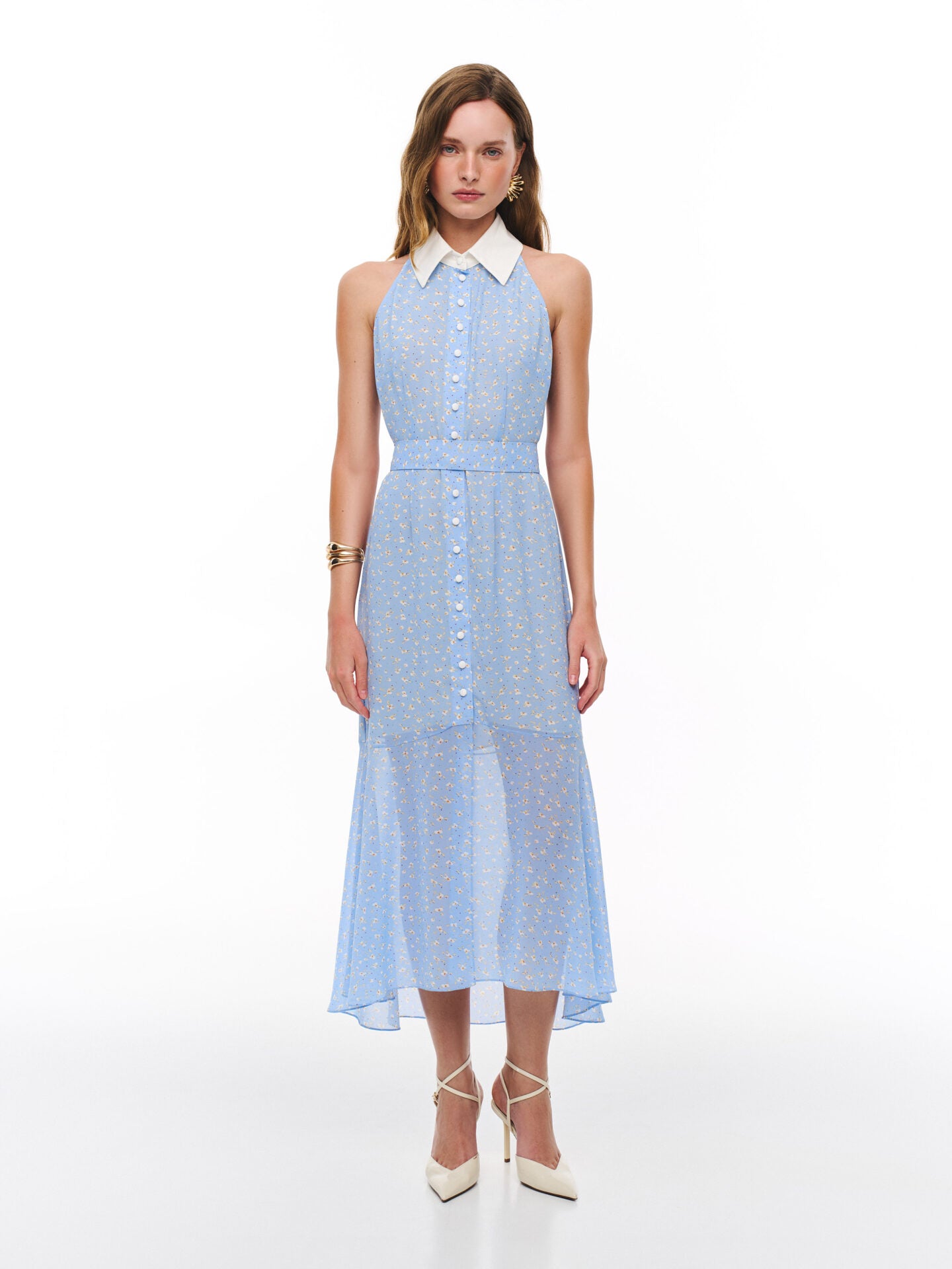 Сукня-міді з розкішного віскозного шифону. Сукня виконана на підкладці. Контрастний білий комірець надає сукні особливої витонченості. Сукня застібається спереду на біді гудзики. Преміальна технологія виконання з усіма закритими швами. Довжина сукні 128 см.