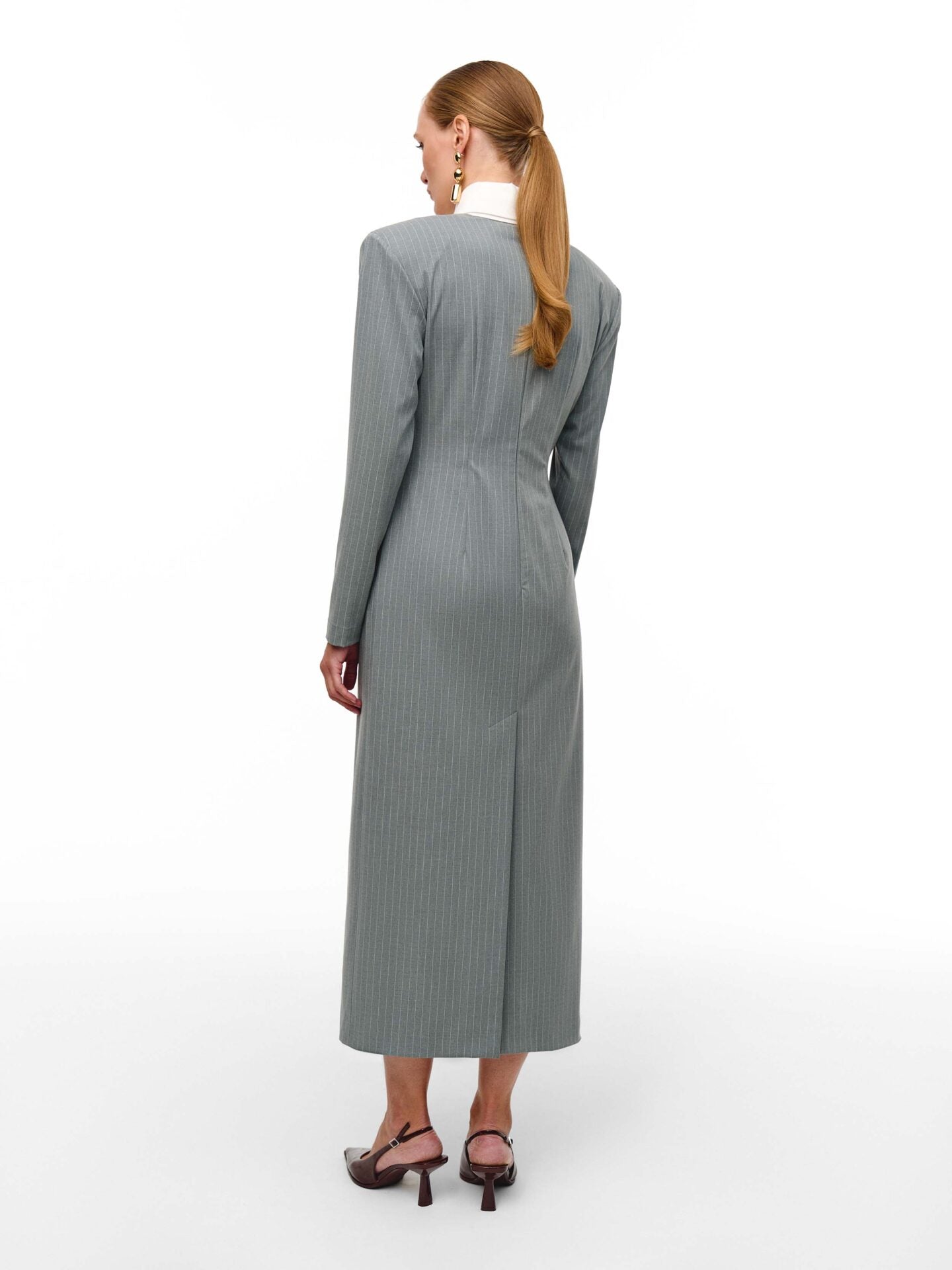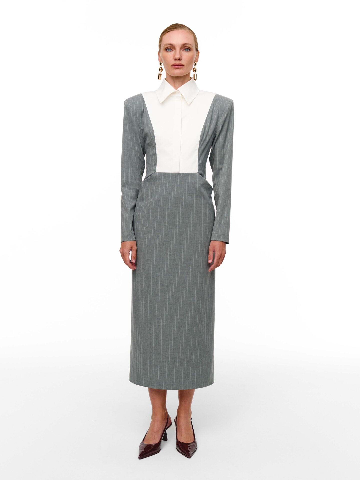 Сукня виконана з ексклюзивної тканини в тонку смужку і має контрастну білосніжну маніжку з класичним сорочковим коміром, шо створює ефект досконалості. Чітка, посилена лінія плечей та довгі рукава, преміальна технологія виконання з усіма закритими швами забезпечує ідеальну посадку. Сукня має дві врізні кишені.