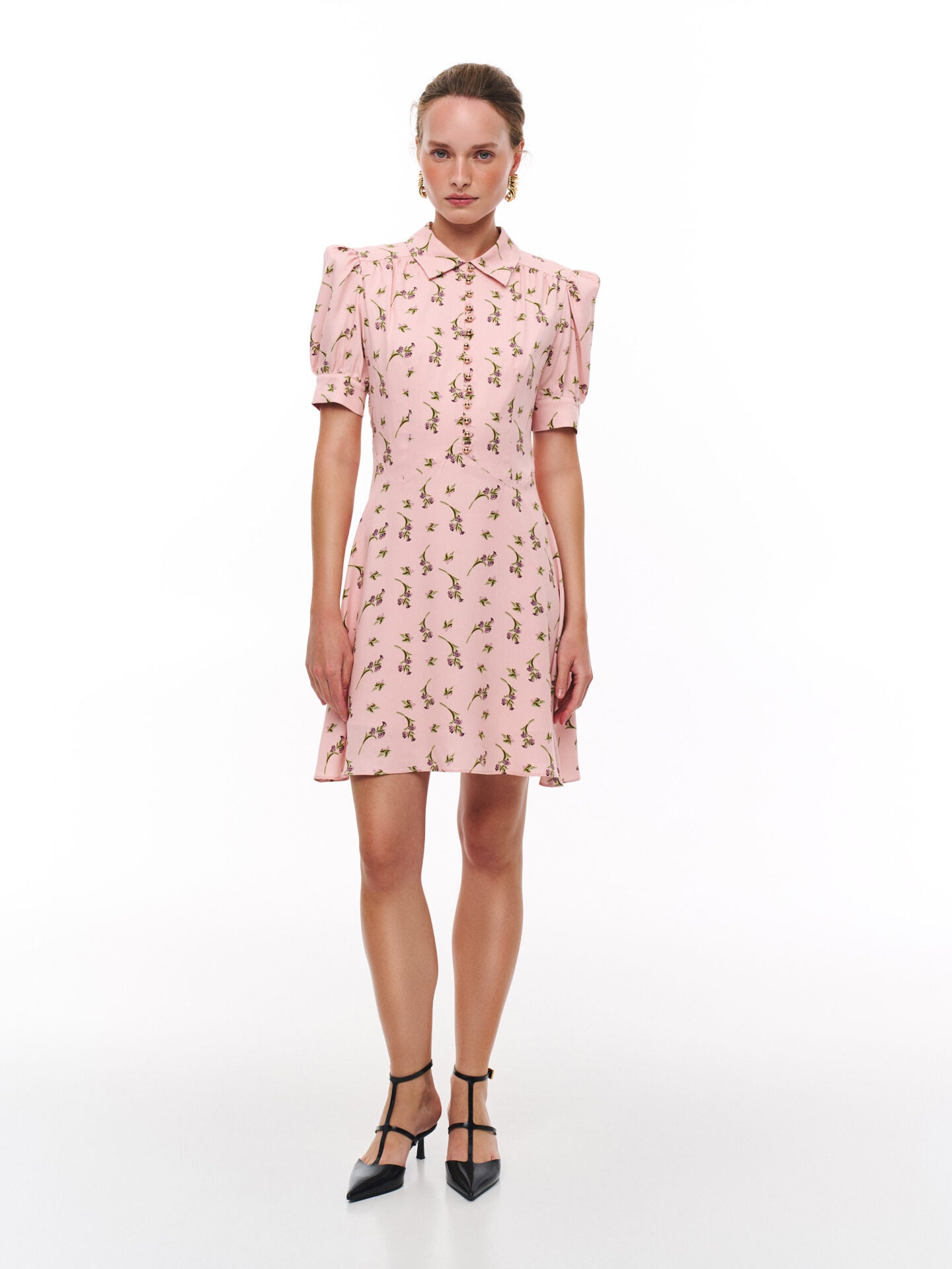 Сукня-міні з м’якої, струмуючої бавовняної тканини. Сукня виконана на підкладці. Рукава-ліхтарики створюють додатковий об’єм. Фігурний виріз по переду надає сукні особливої витонченості. Сукня застібається ззаду на потаємну блискавку. Довжина сукні 90 см.