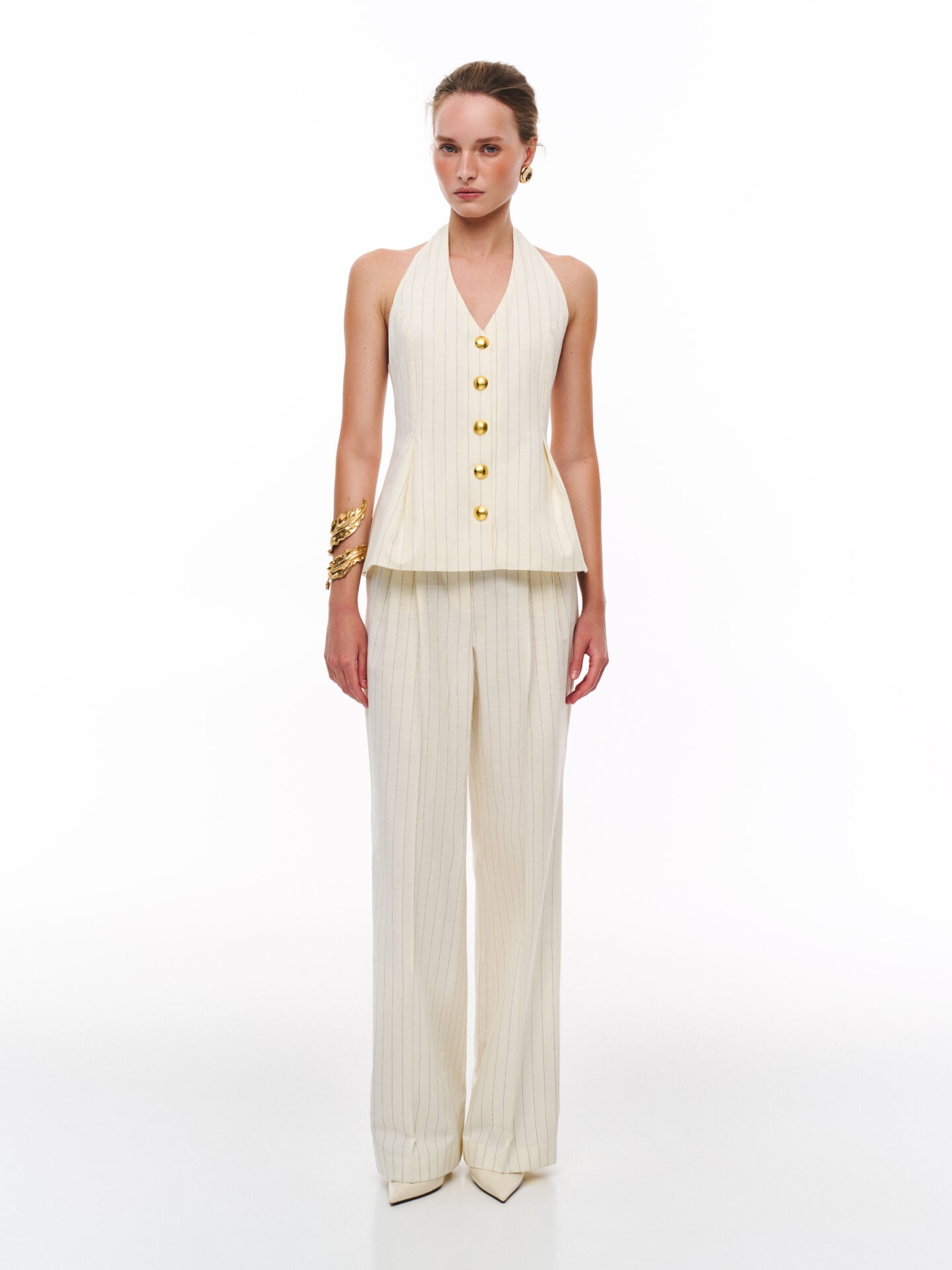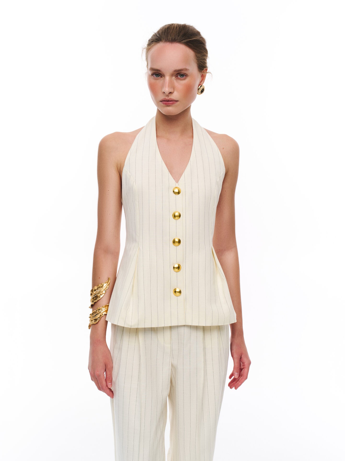 Ефектний топ без рукавів з V-подібним вирізом. Виготовлений з легкої тканини бежевого кольору, прикрашеної великим чорним абстрактним принтом. Фасон галтера підкреслює лінії шиї та плечей, а великі декоративні ґудзики спереду додають стильності. Ідеальний вибір для літніх образів або вечірніх виходів.