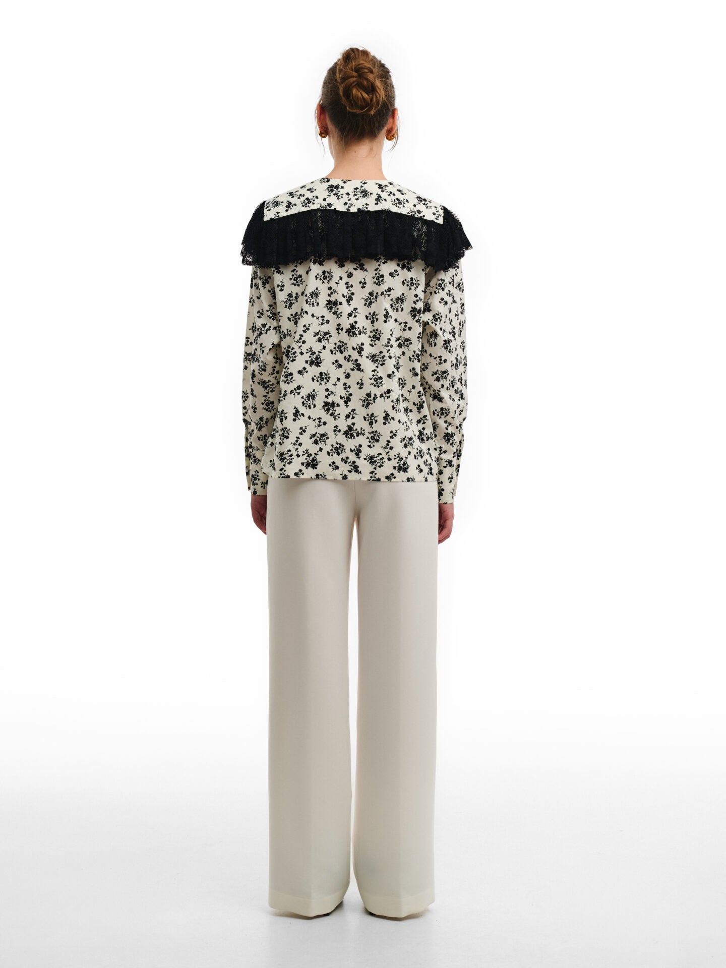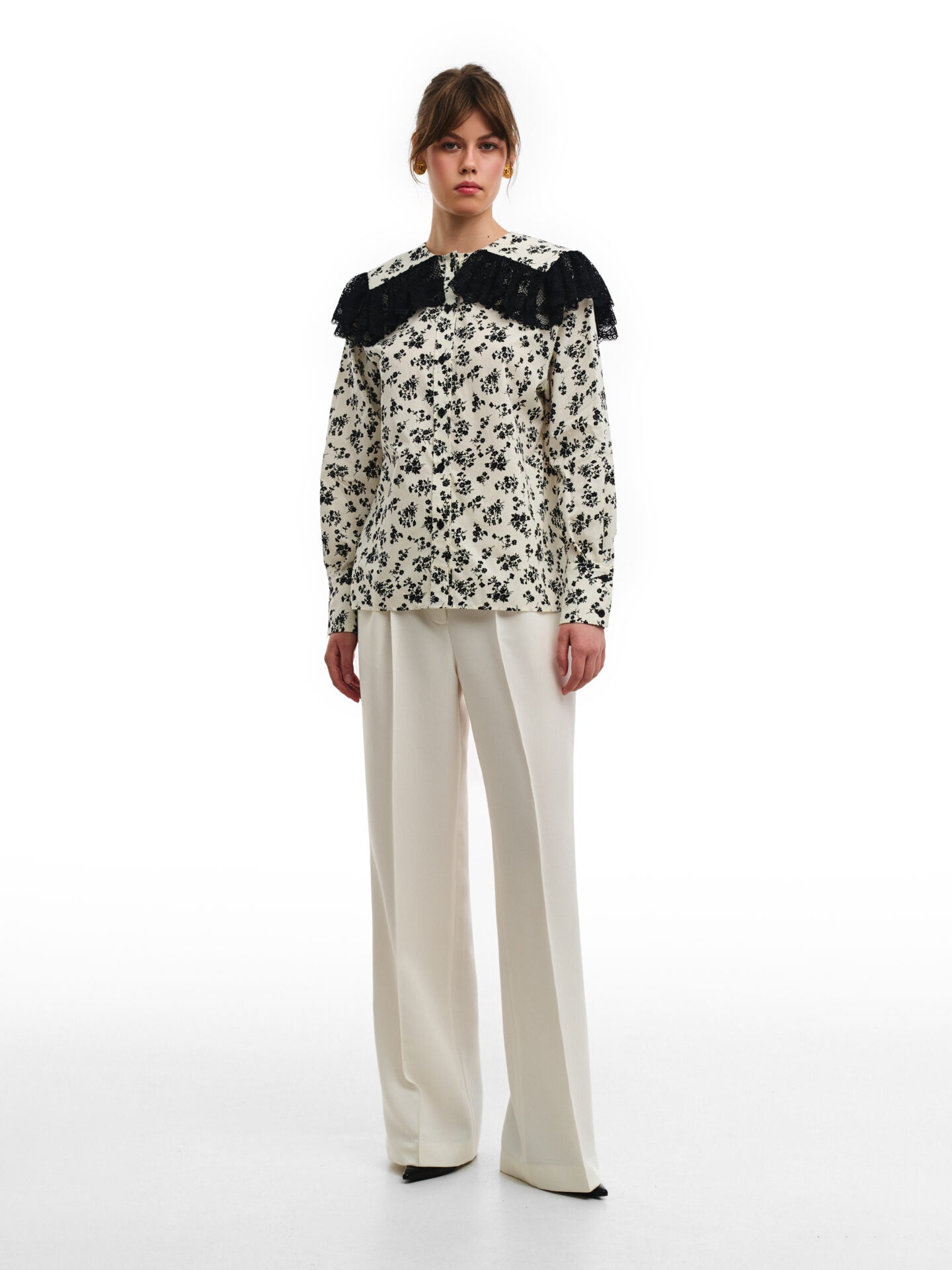 Штани-палаццо з подвійними защіпами та карманами по бокам. Висока лінія талії та широкий пояс підкреслюють силует. Широкий манжет по низу штанів. Довжина виробу 114 см.