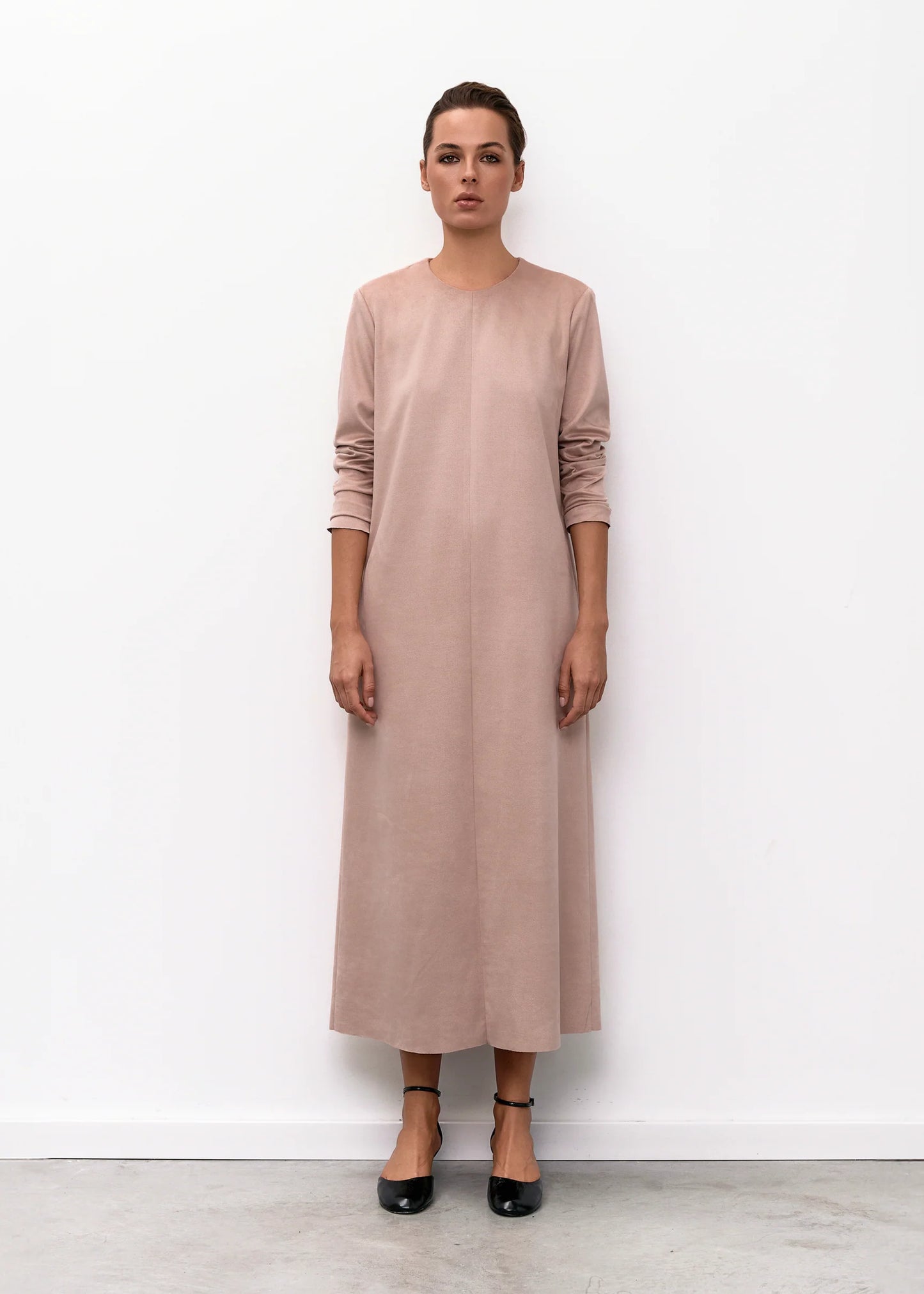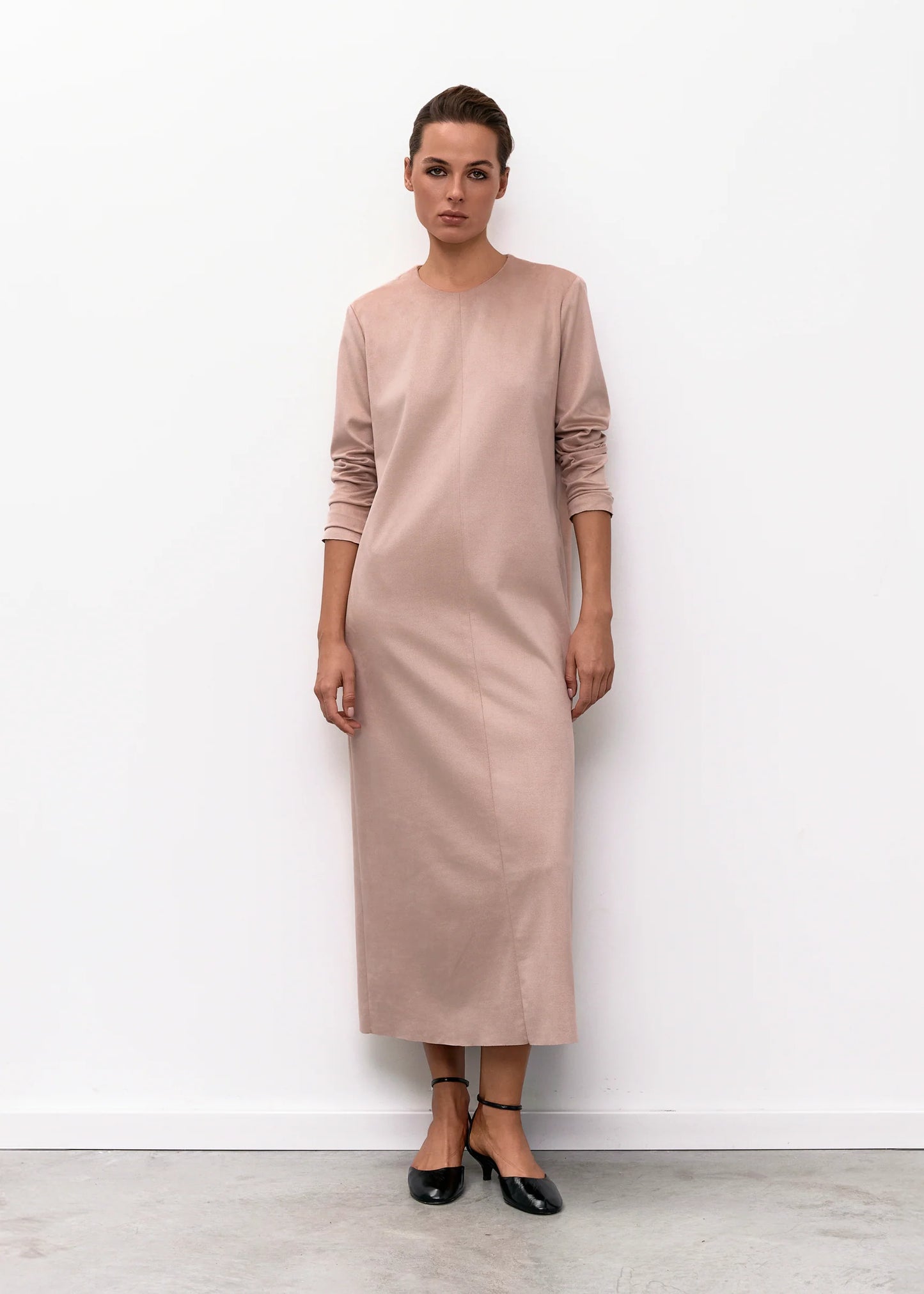 Плаття прямого крою з довгим рукавом та необробленим низом. Виконане з м’якої екозамші. Застібається ззаду на потаємну блискавку.