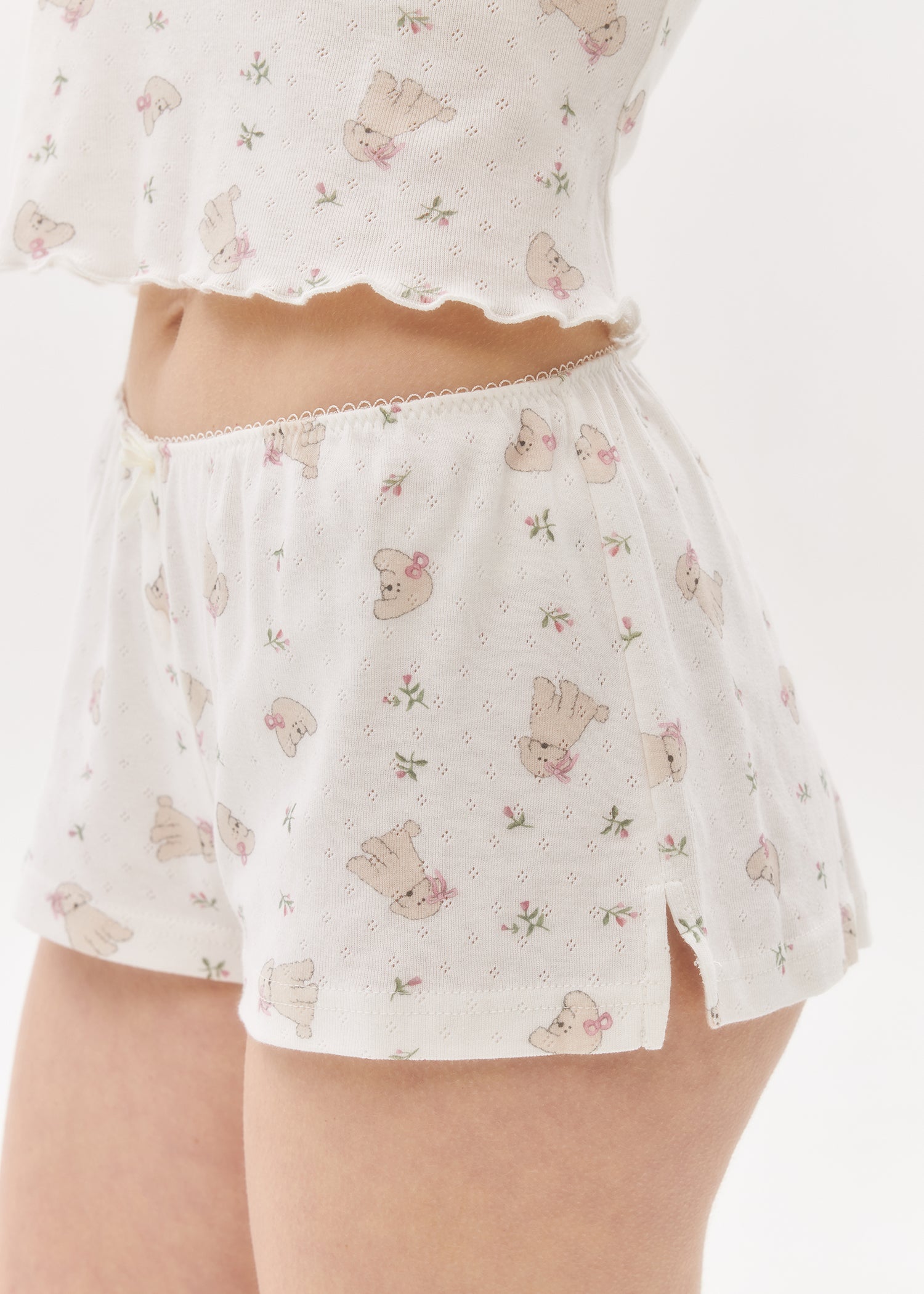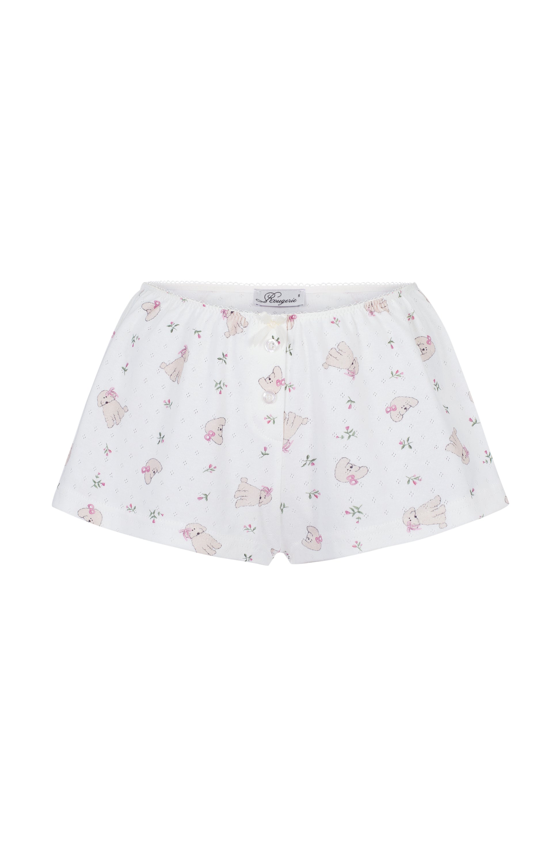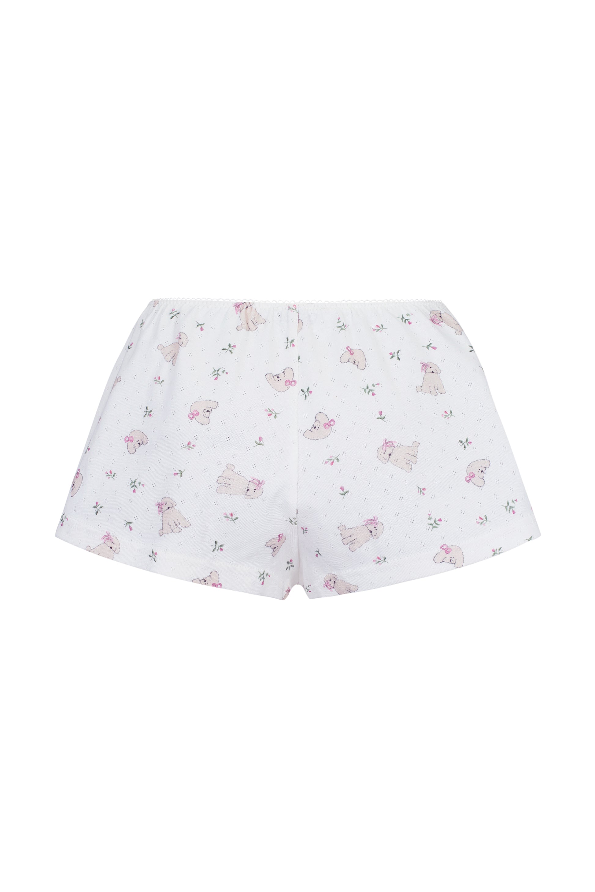 Шорти білого кольору з грайливим принтом з собачками. Низька посадка. З декоративними розрізами по бокам.