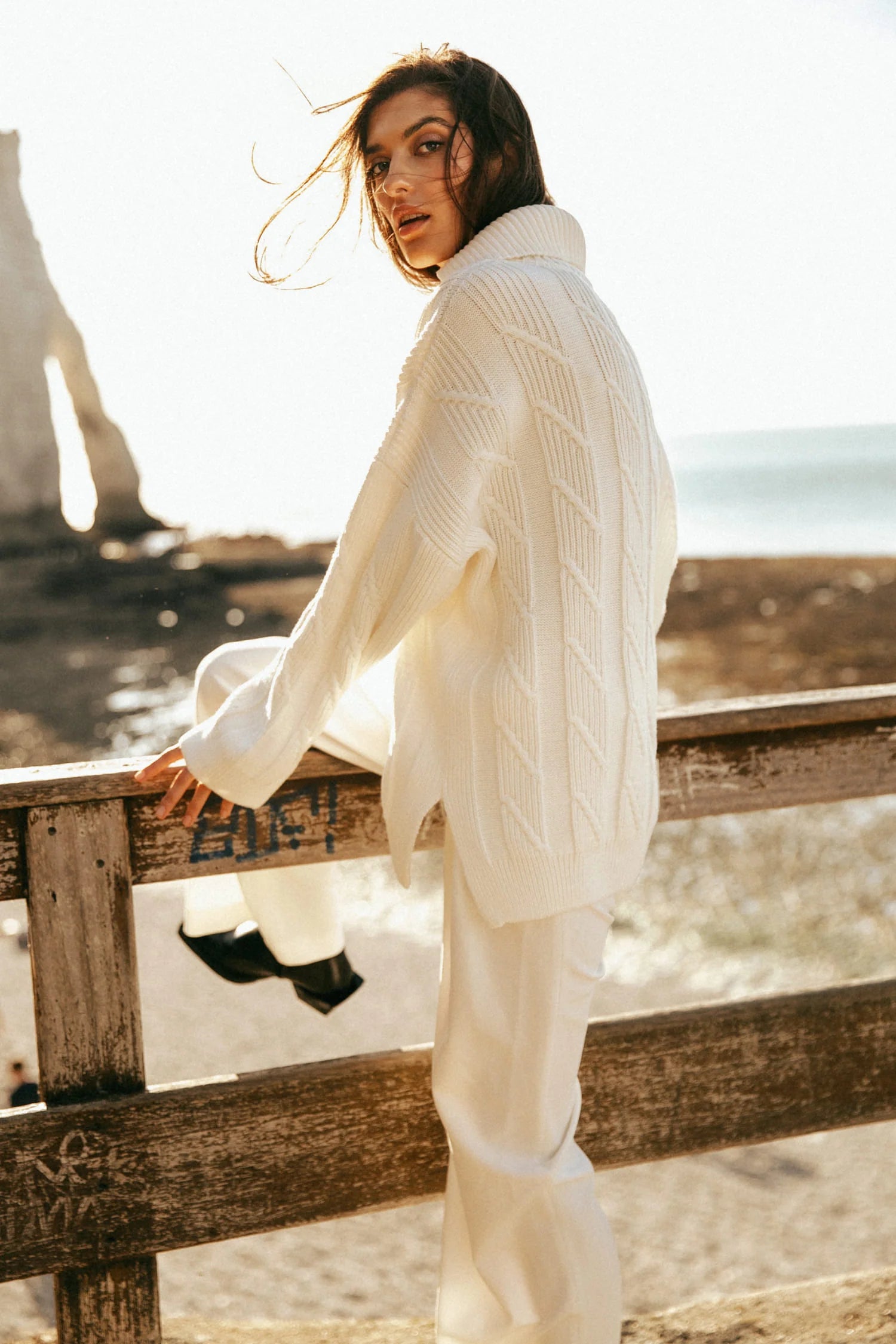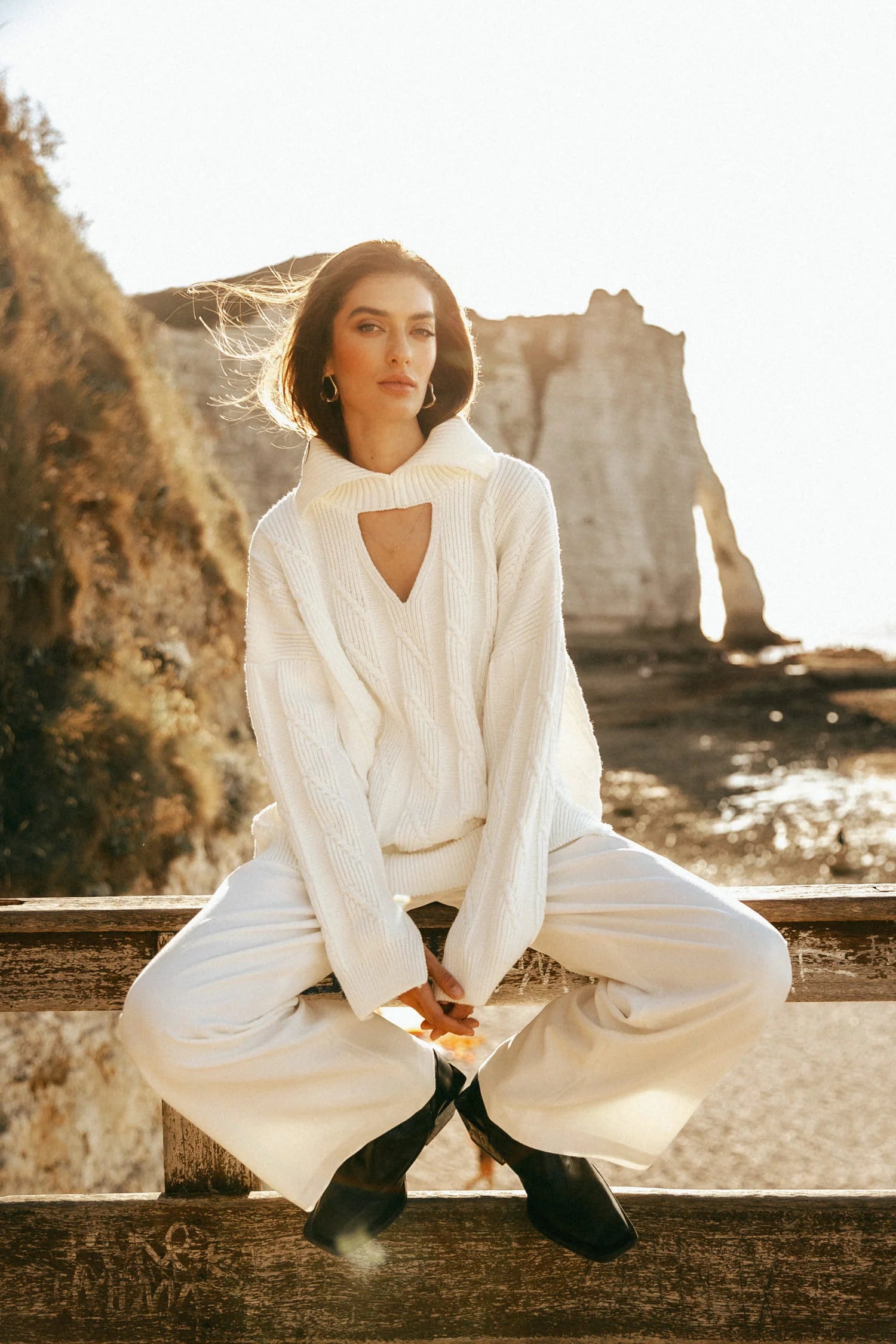 В’язані коси створюють фактуру, яка нагадує природний рельєф, а високий комір дарує відчуття тепла й захищеності. Трикутний виріз під горлом додає легкості образу, а розрізи на рукавах роблять силует більш сучасним і динамічним.
