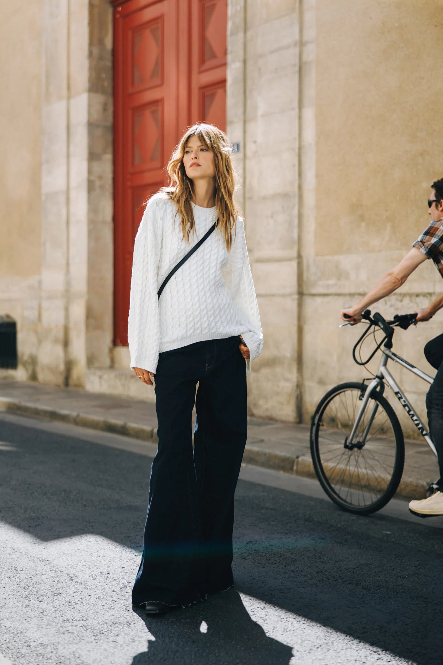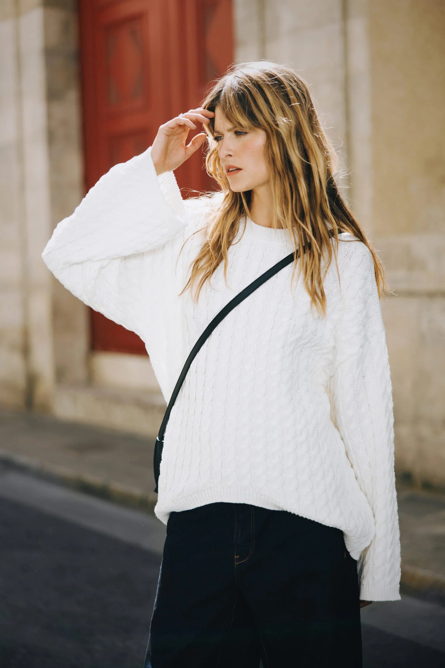 Светр бавовняний обʼємної вʼязки, яка виконана на рукавах в іншому стилі ніж на основній частині, цікавий варіант базової моделі светру