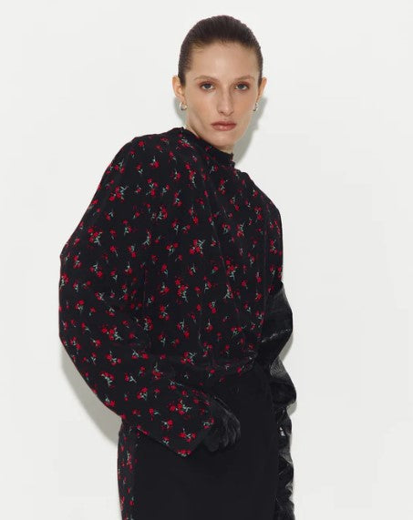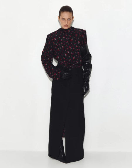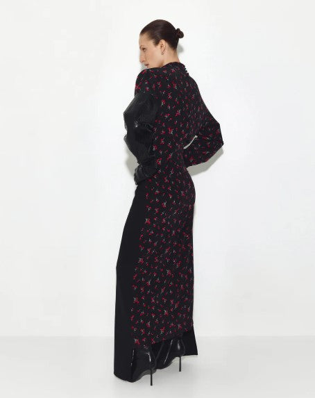 Удосконалена сукня Едді, яка вже стала бестселером бренду. Розширена лінія плечей створює жіночний, але одночасно маскулінний образ. Горловина — м’яка стійка. Спереду імітація максі-спідниці зі структурованої шерсті. Виріб виконано з шовку. Застібка на потайній блискавці. Асиметричний низ. Спереду високий розріз.