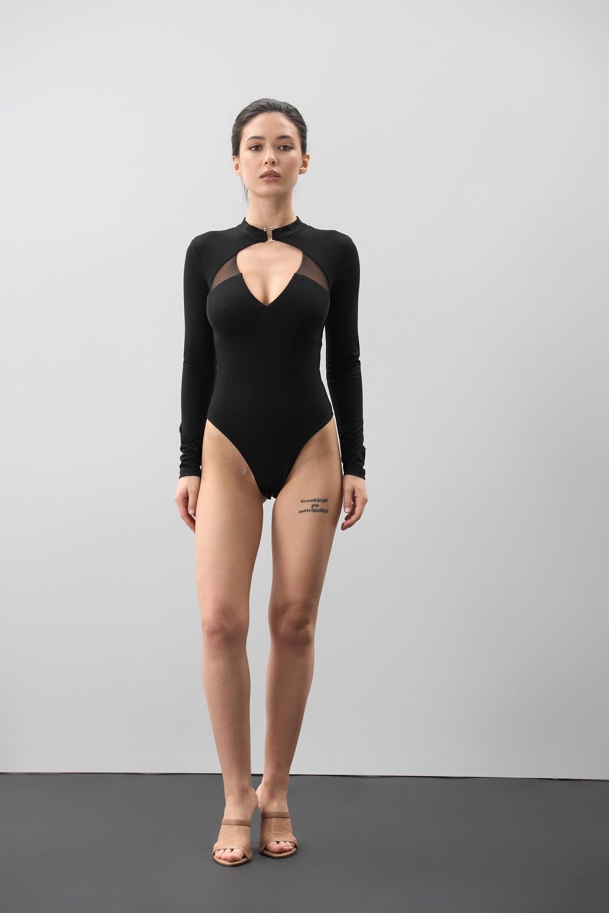 Сміливість, що виглядає елегантно. Цей боді — про силу бути собою. Глибокий виріз з коміром і декоративною застібкою підкреслює лінію декольте і робіть на цьому акцент.