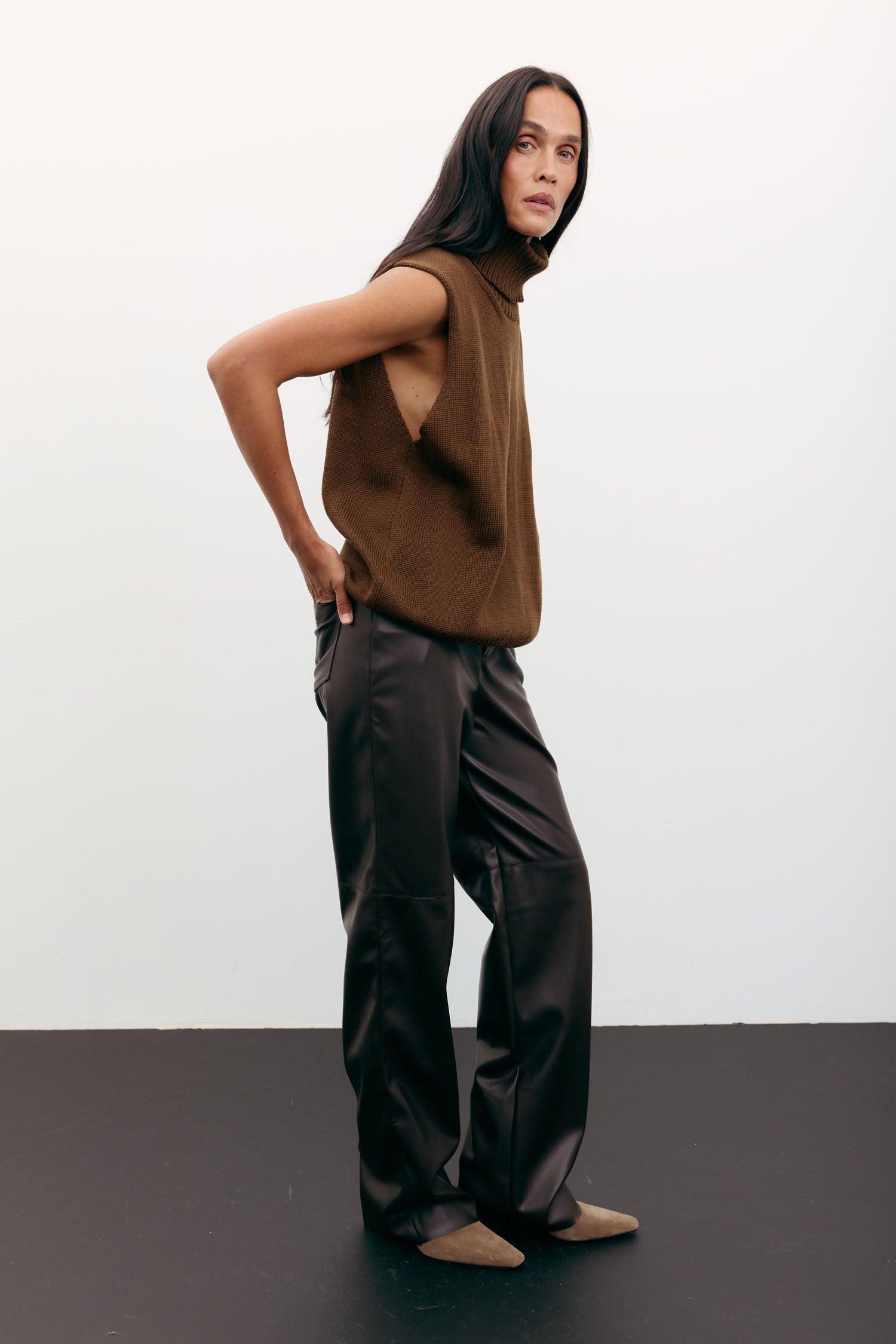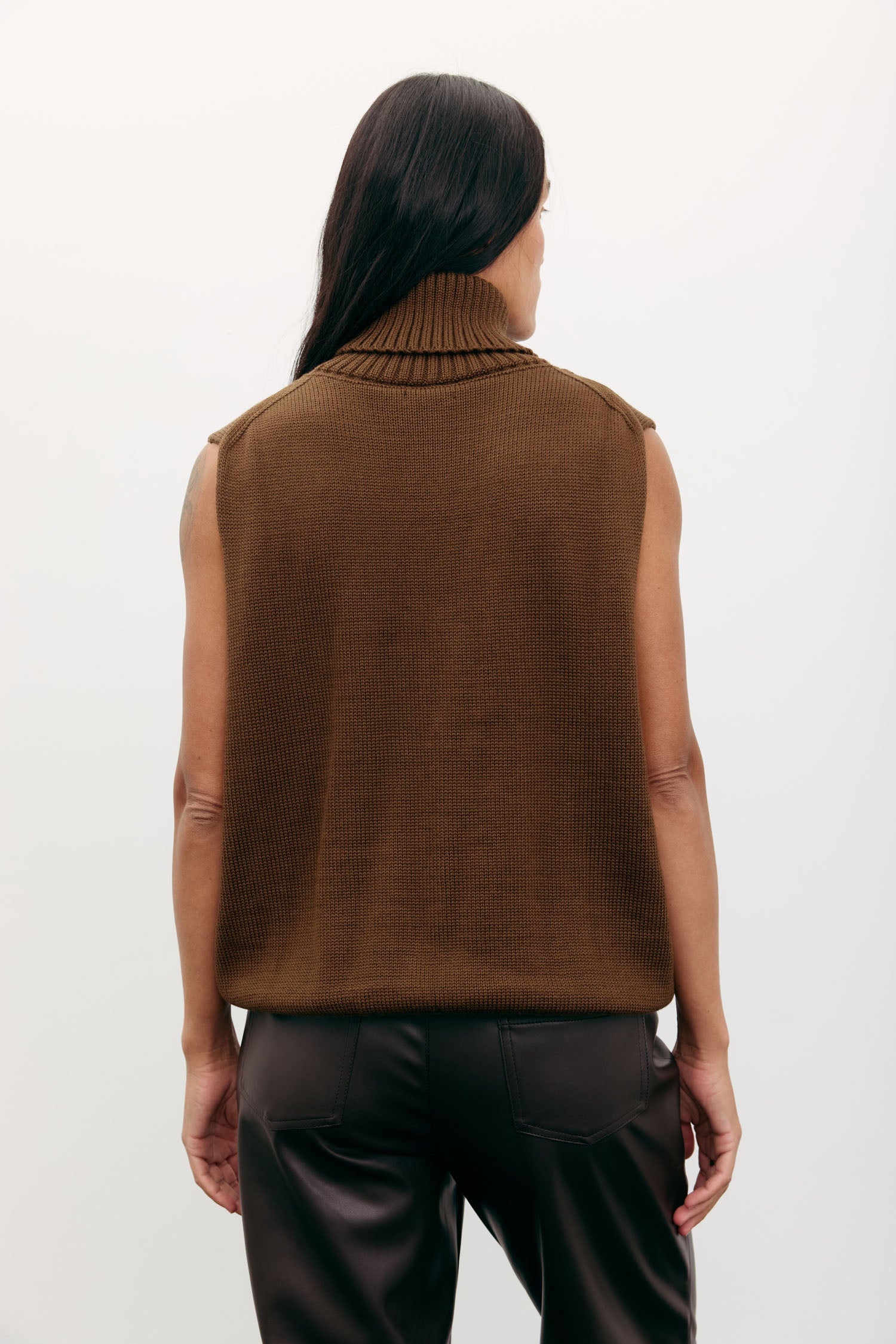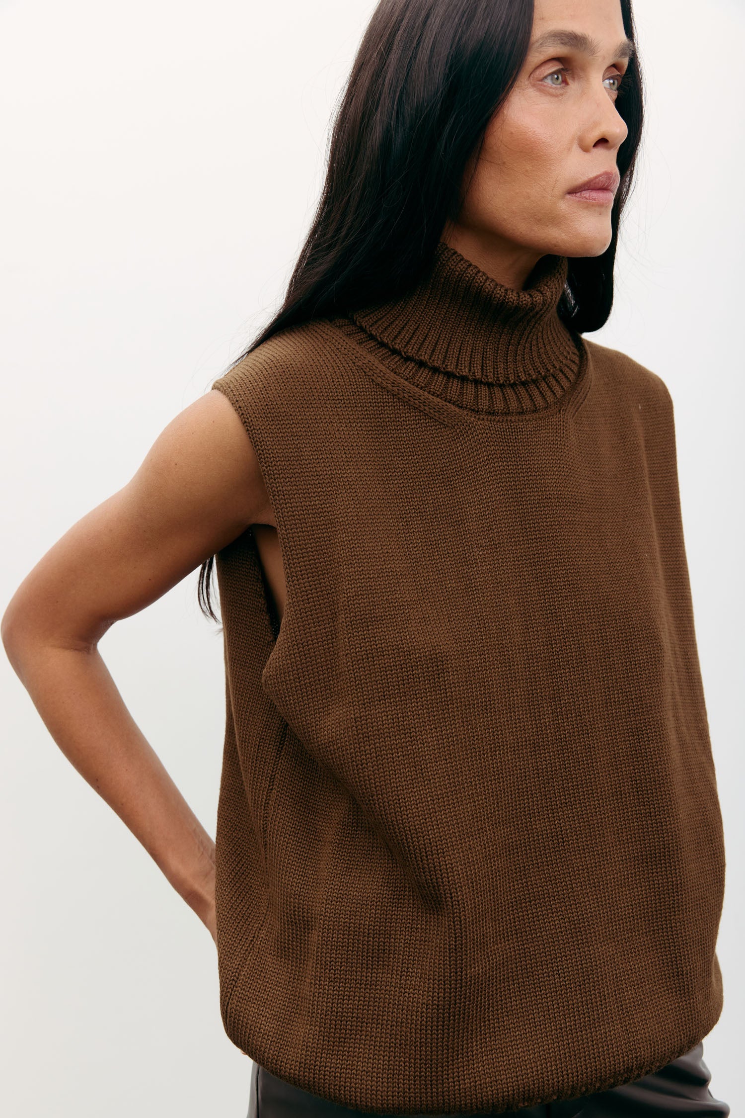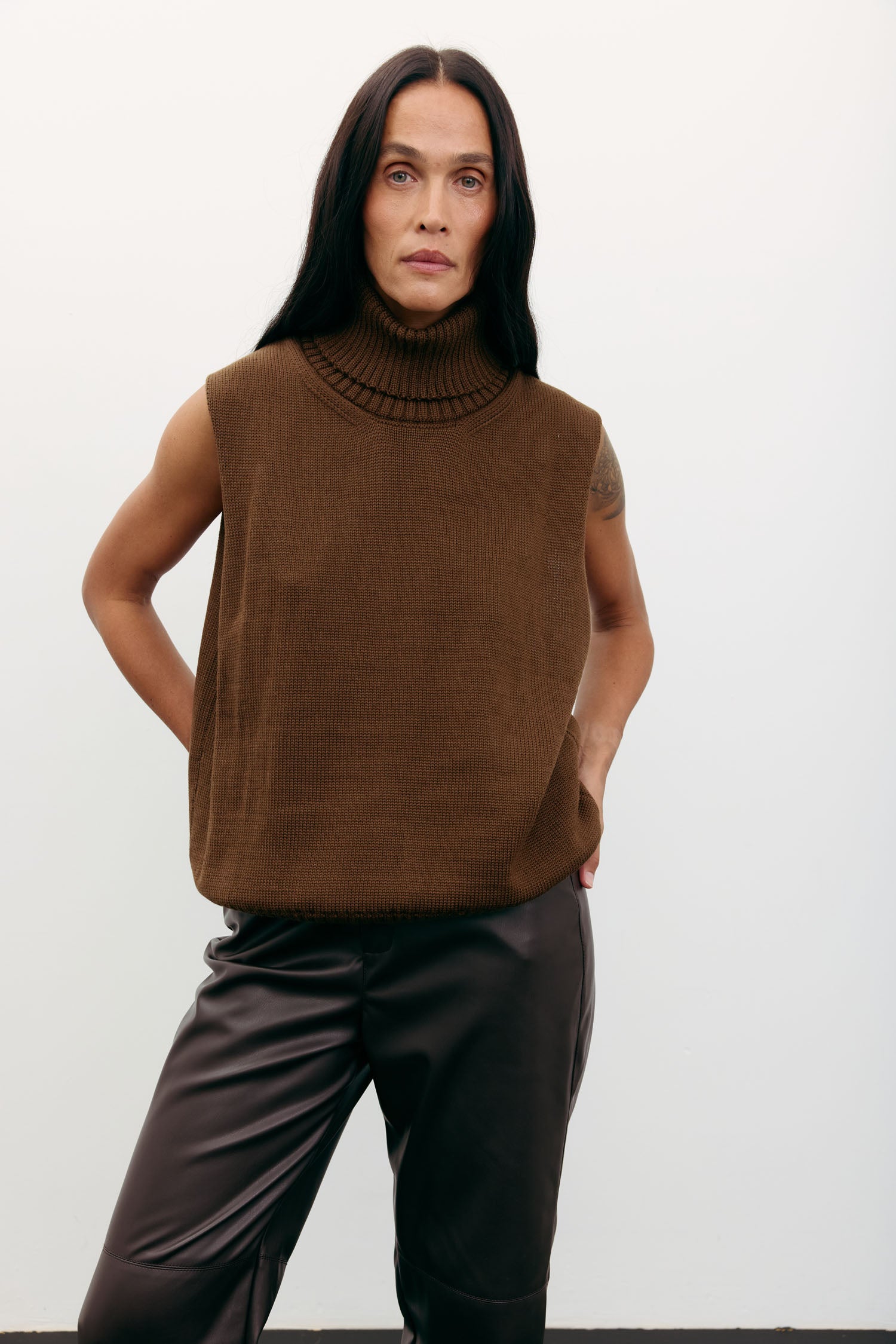 Жіночий жилет шоколадного кольору з напіввовняної пряжі. Має високу об’ємну горловину та лаконічний силует.  Теплий і затишний жилет, що легко поєднується із базовими елементами гардероба, підходить для створення багатошарових образів восени.