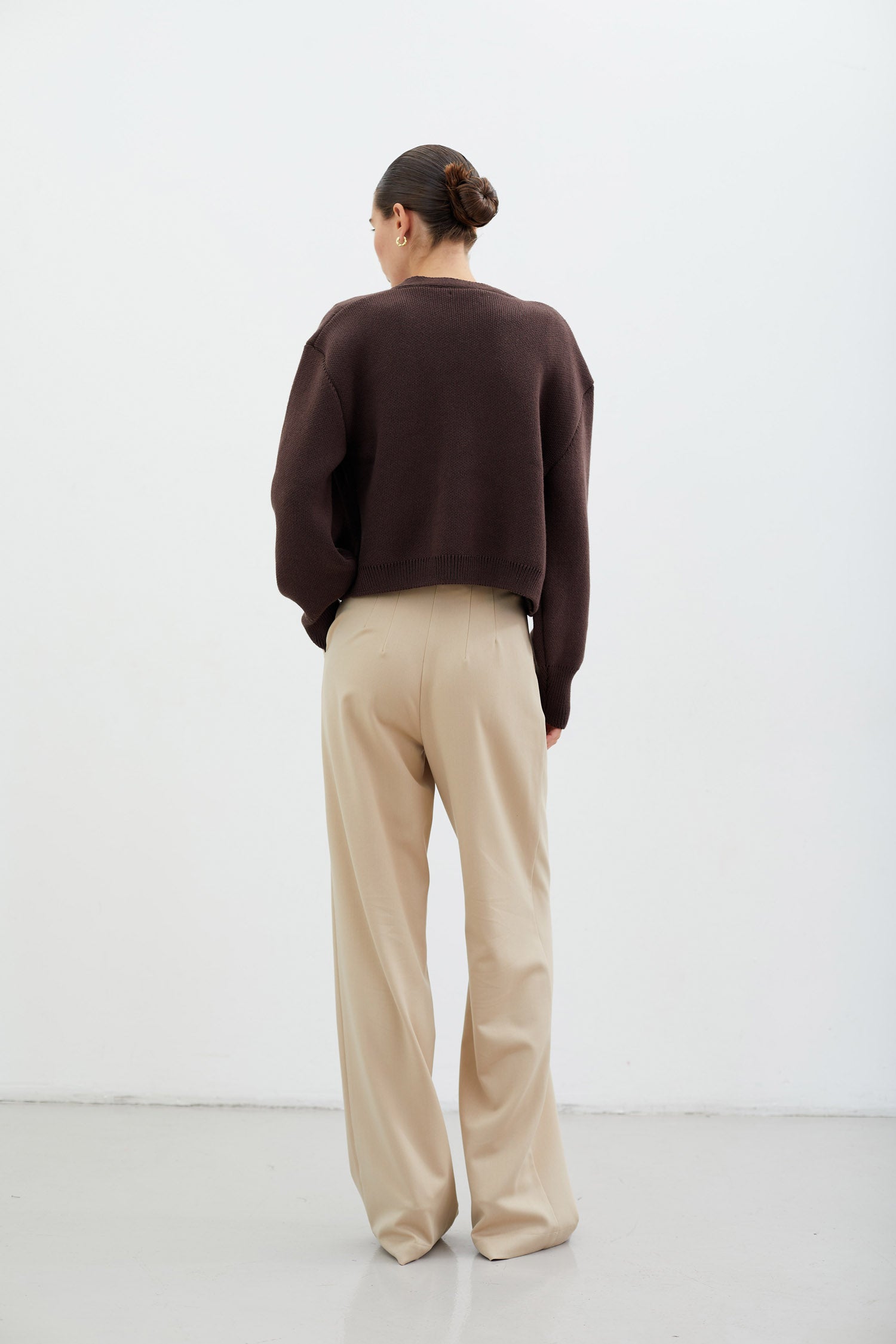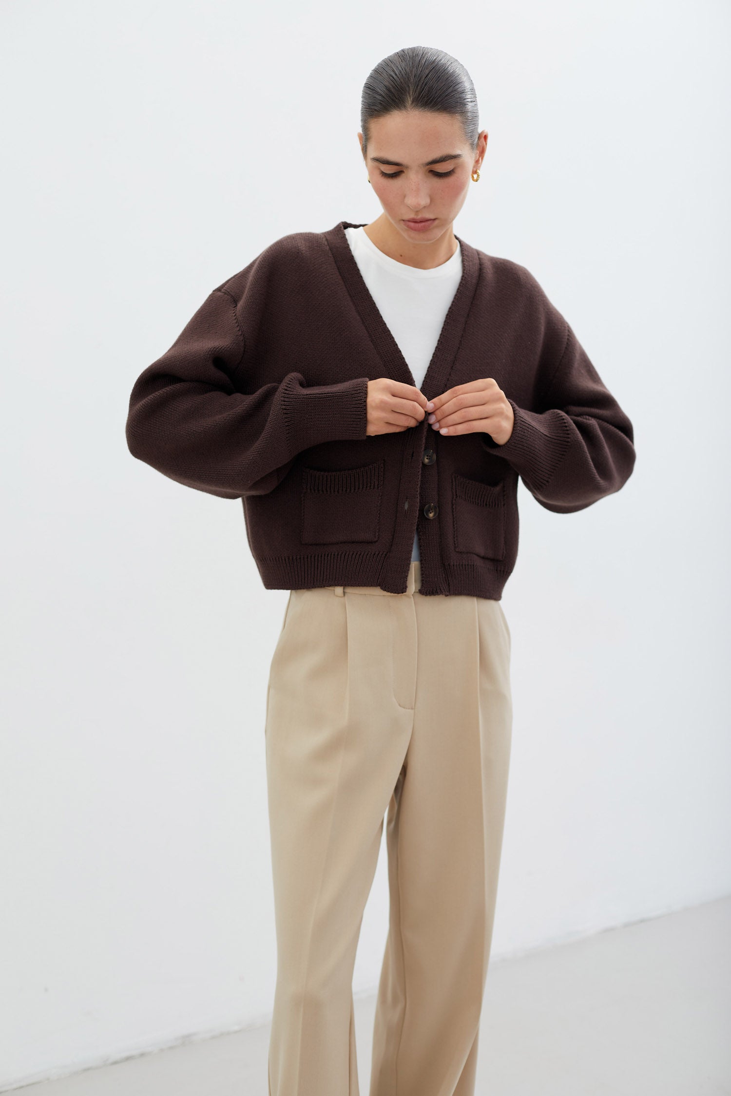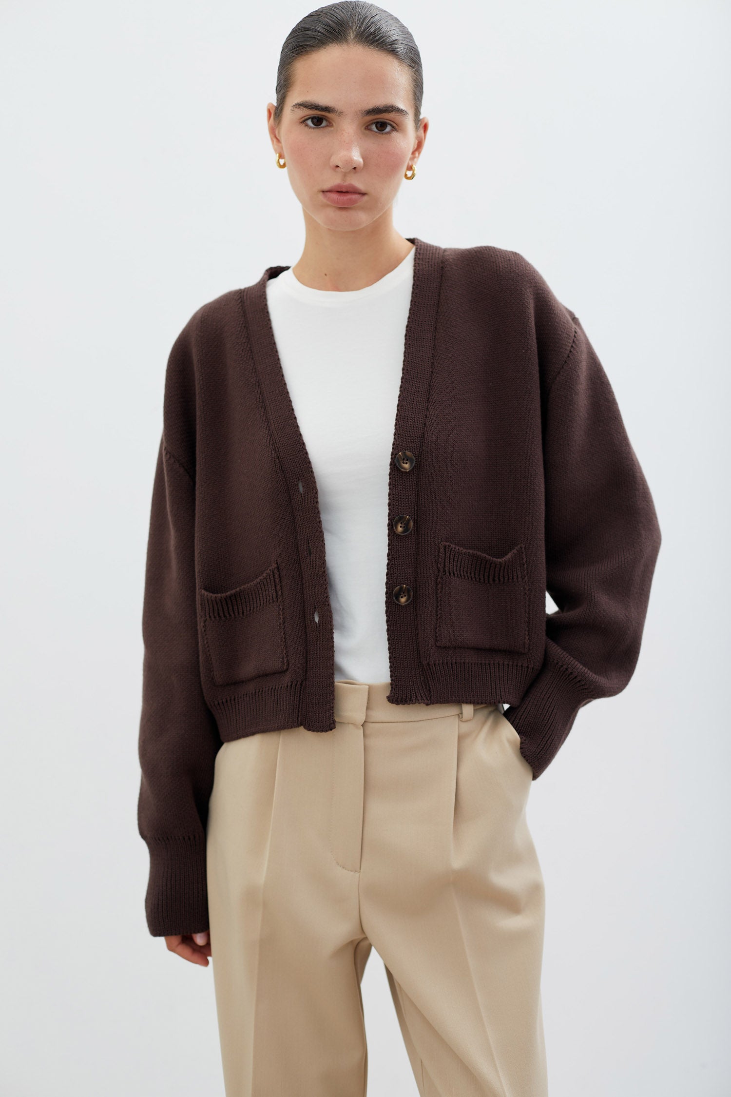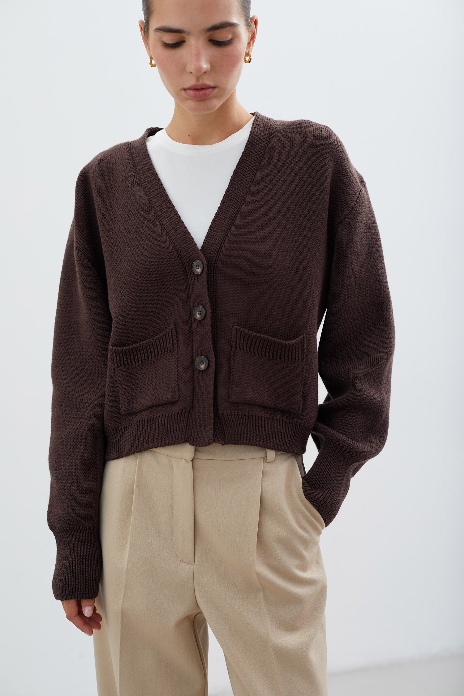 Трикотажний кардиган з кишенями шоколадного кольору на трьох великих ґудзиках. Щільний і теплий в’язаний кардиган з бавовняної пряжі
