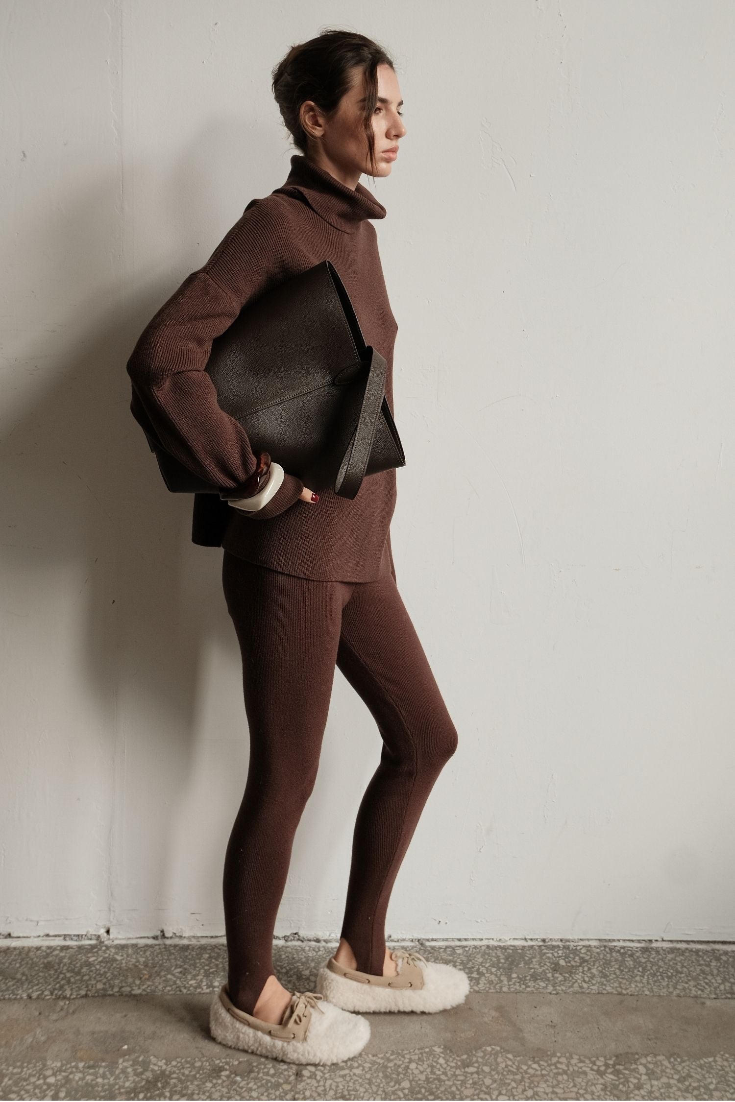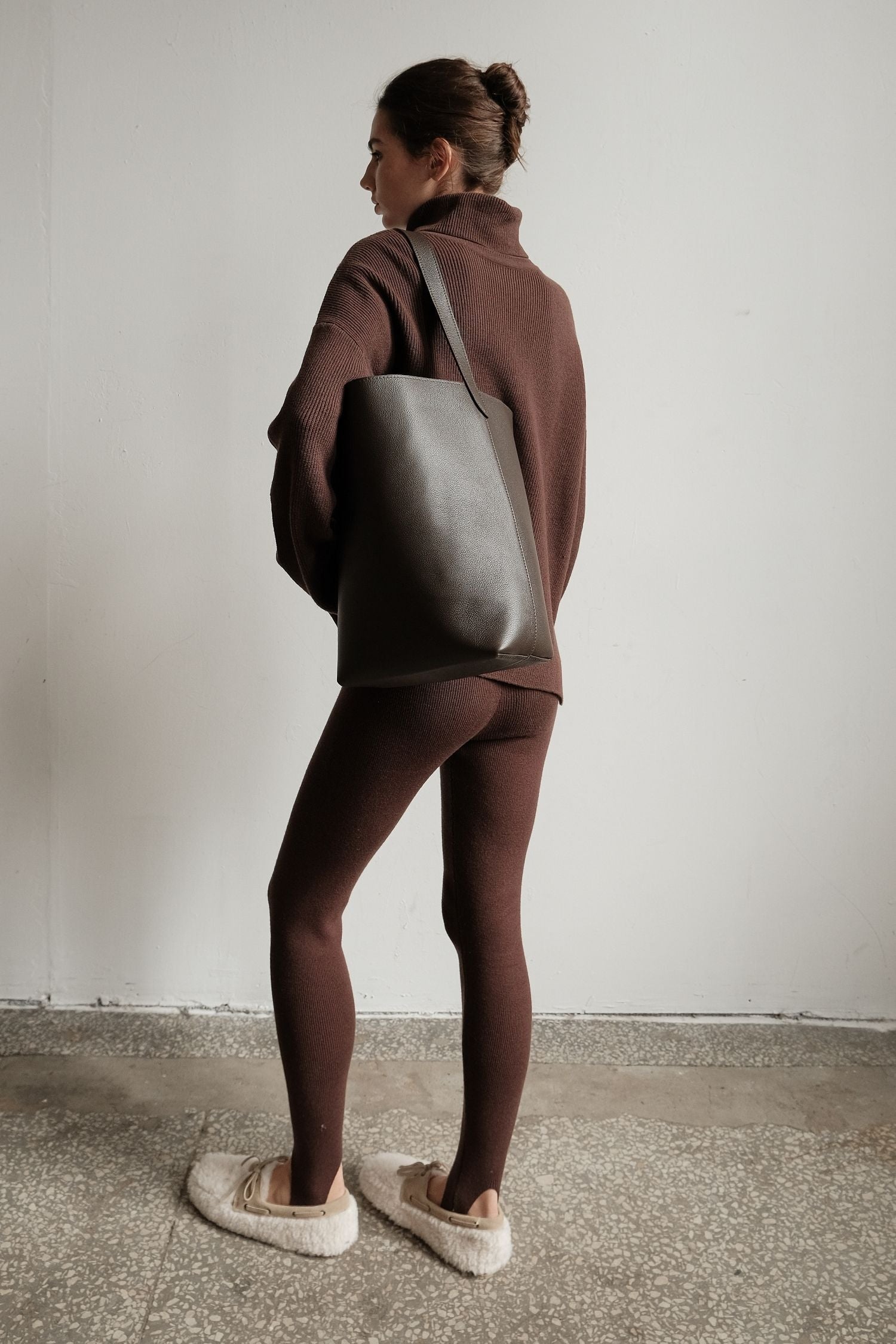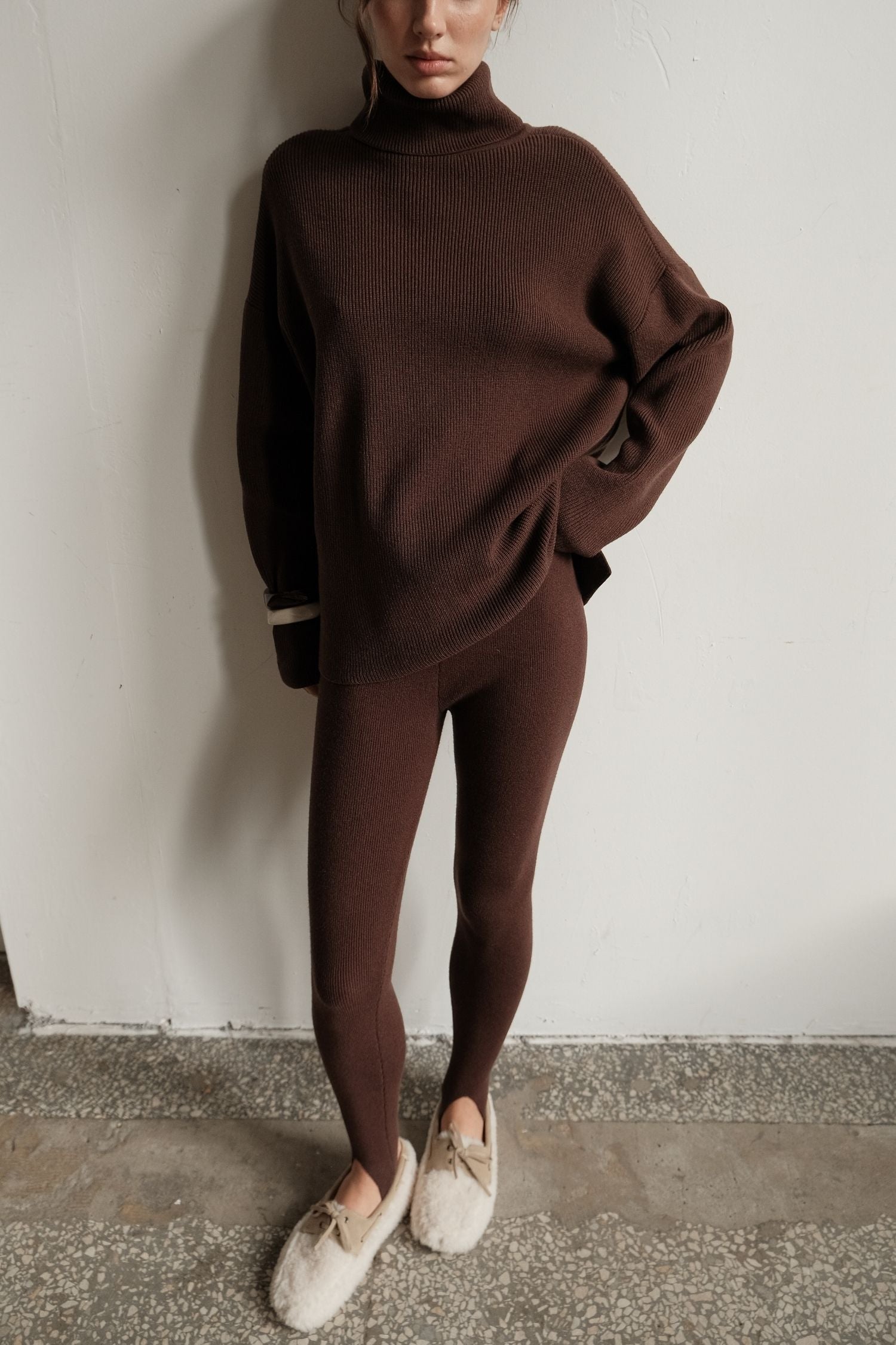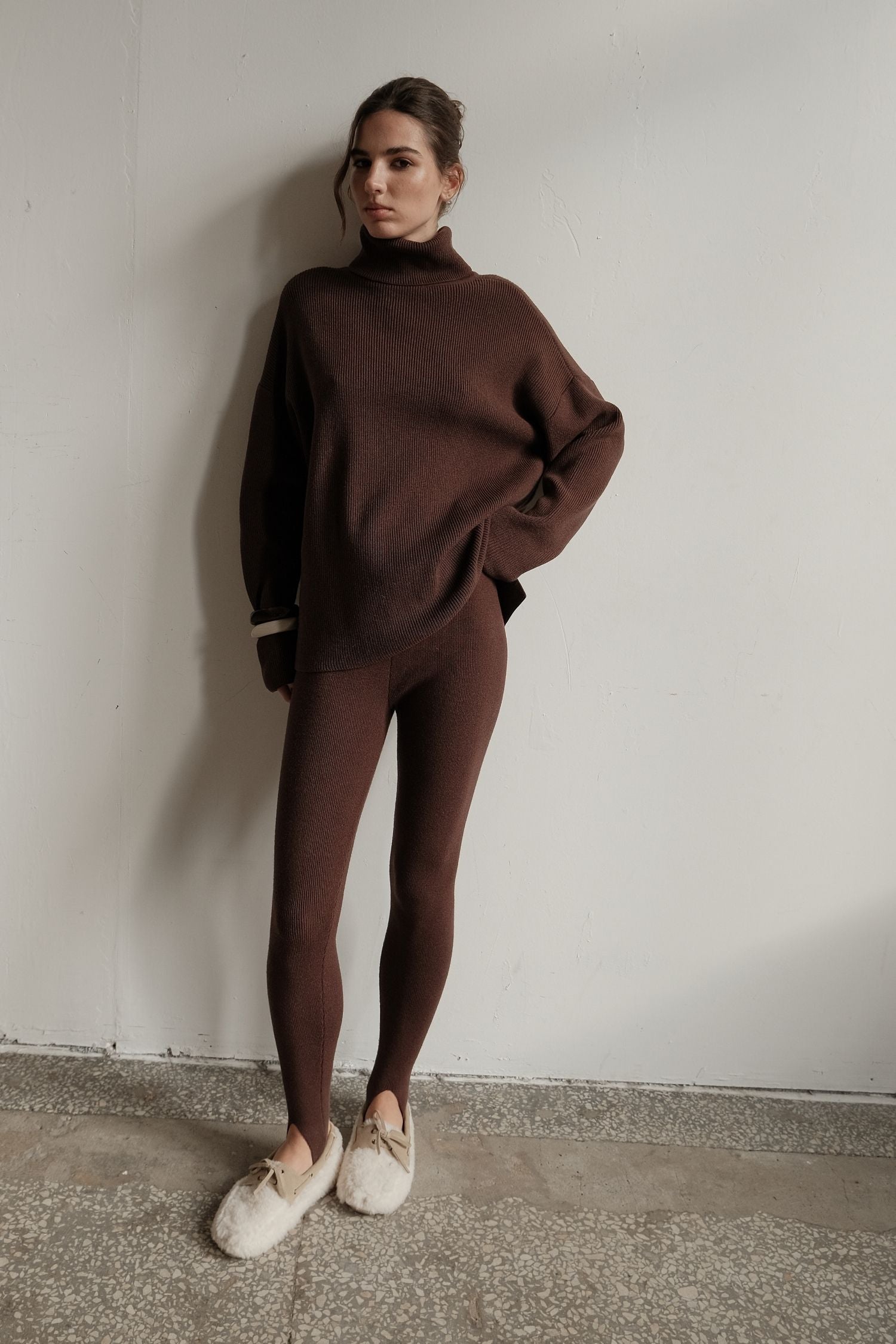 Жіночі трикотажні легінси зі штрипками. Легінси шоколадного кольору, виконані з м’якої та приємної до тіла пряжі. Тепла і максимально зручна модель в актуальному відтінку, що ідеально поєднується зі светрами, сорочкам, джемперами і різноманітними верхнім одягом.